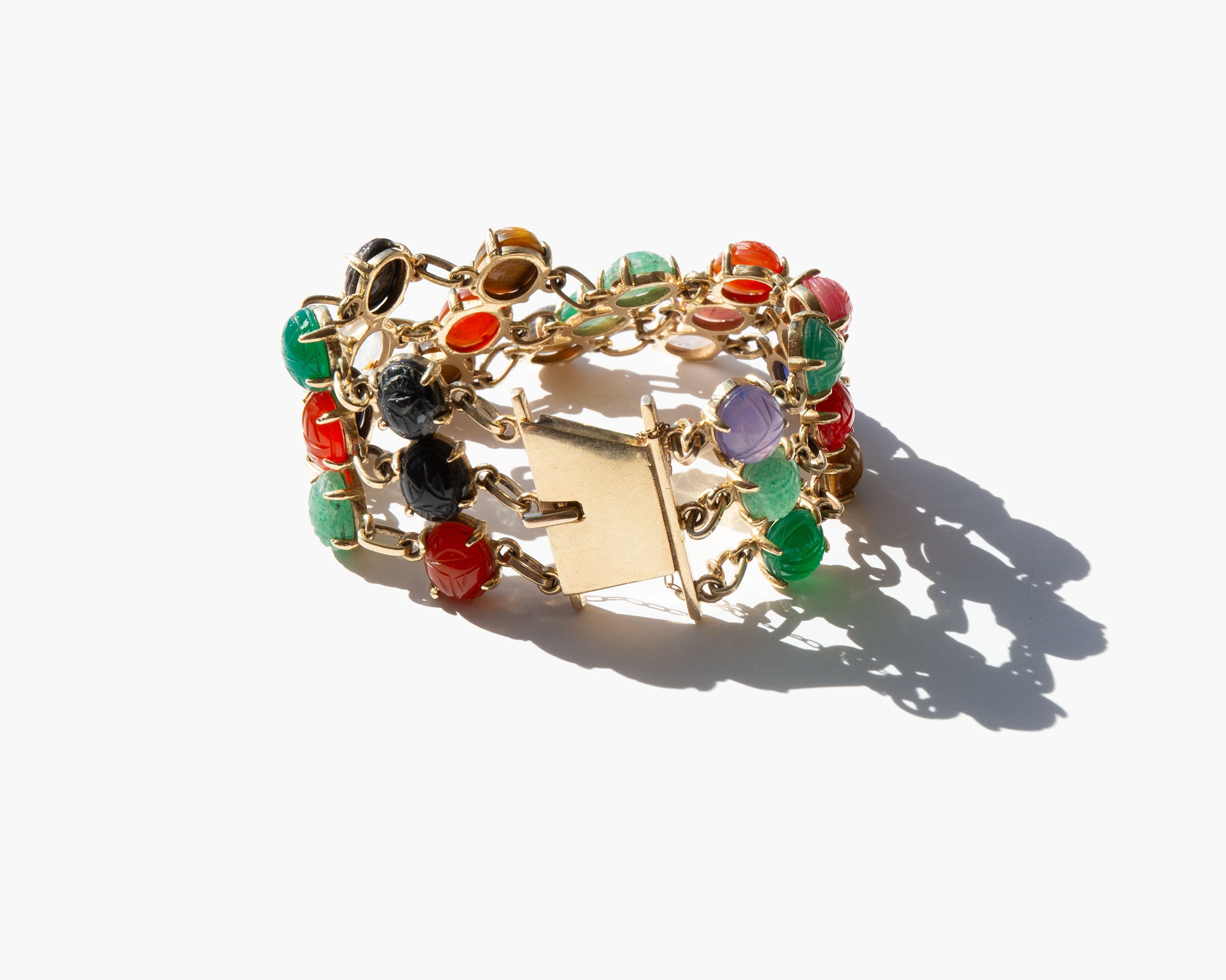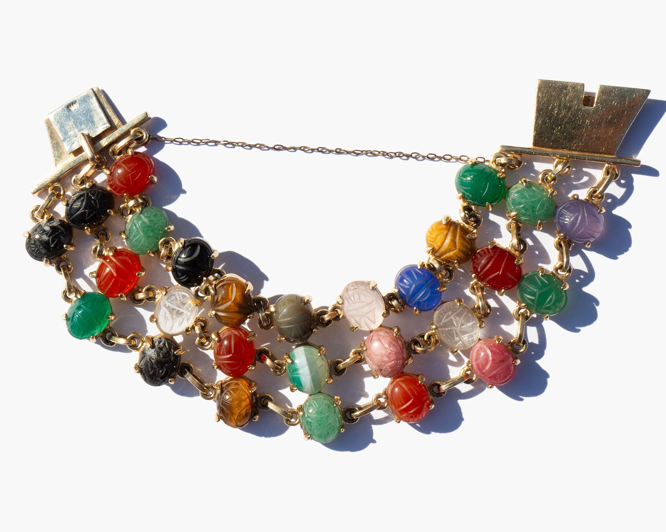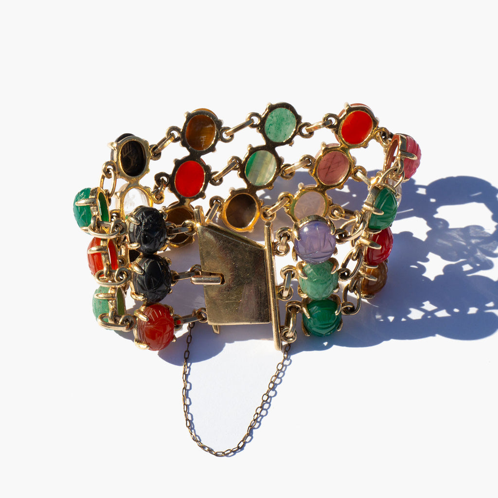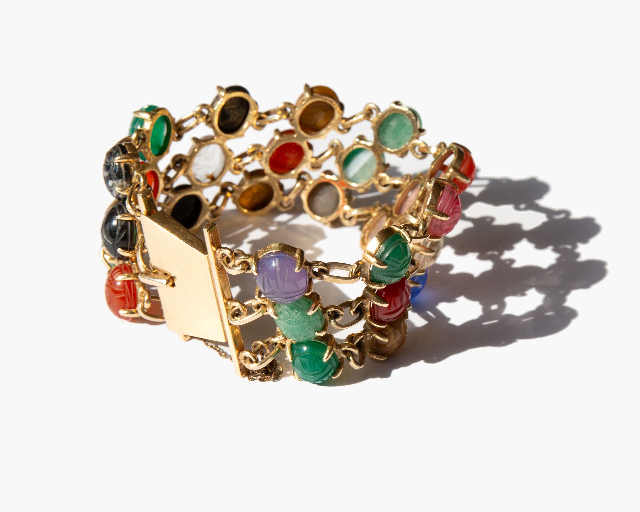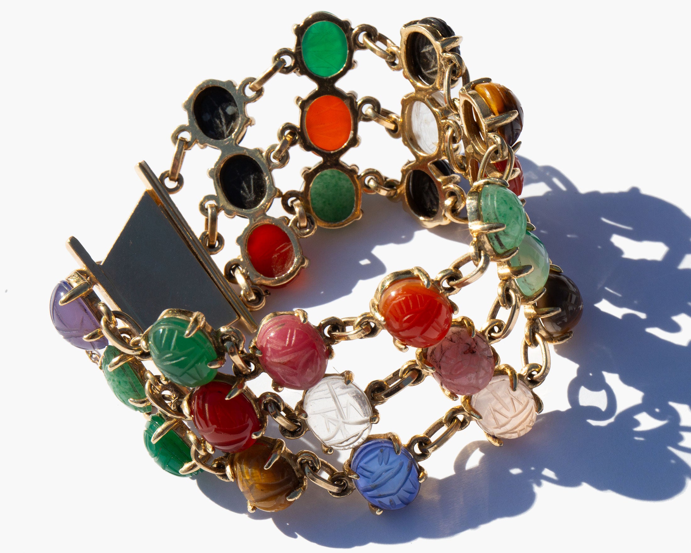 Large and decadent 1970's 14k gold triple strand bracelet with carnelian, quartz, lapis, rose quartz, tiger's eye, and other semi precious stone scarabs. The scarab is an ancient symbol of spontaneous creation and rebirth. In ancient Egypt Scarab amulets were used to protect the deceased in the afterlife and a scarab talisman provided the living wearer with defenses against evil and bad luck and a confidence in the certain knowledge of reincarnation.