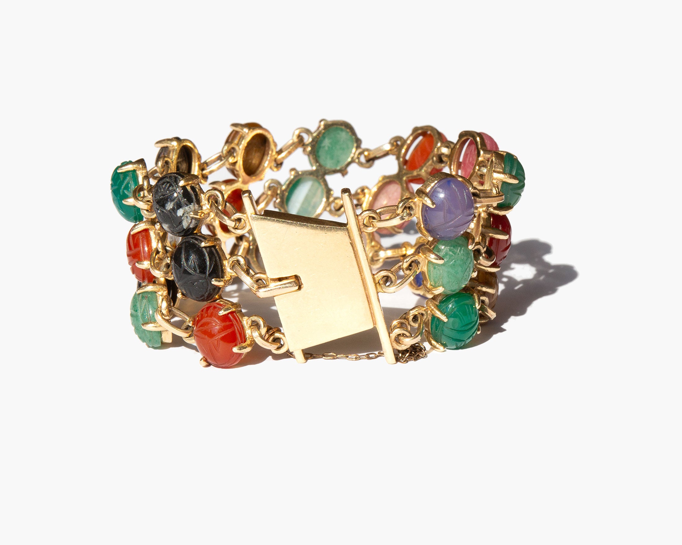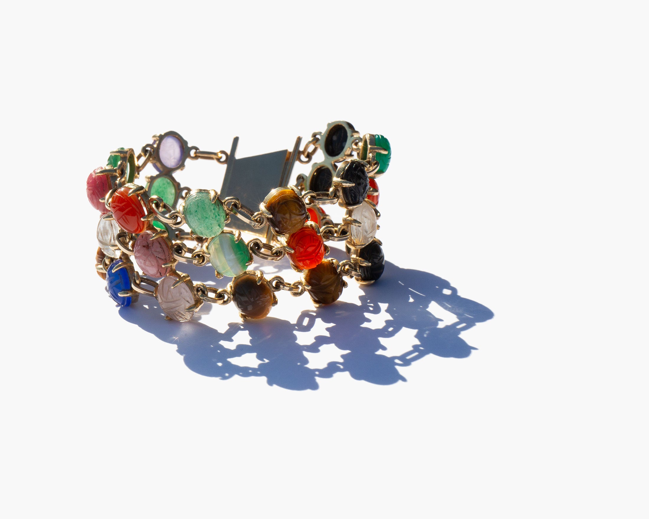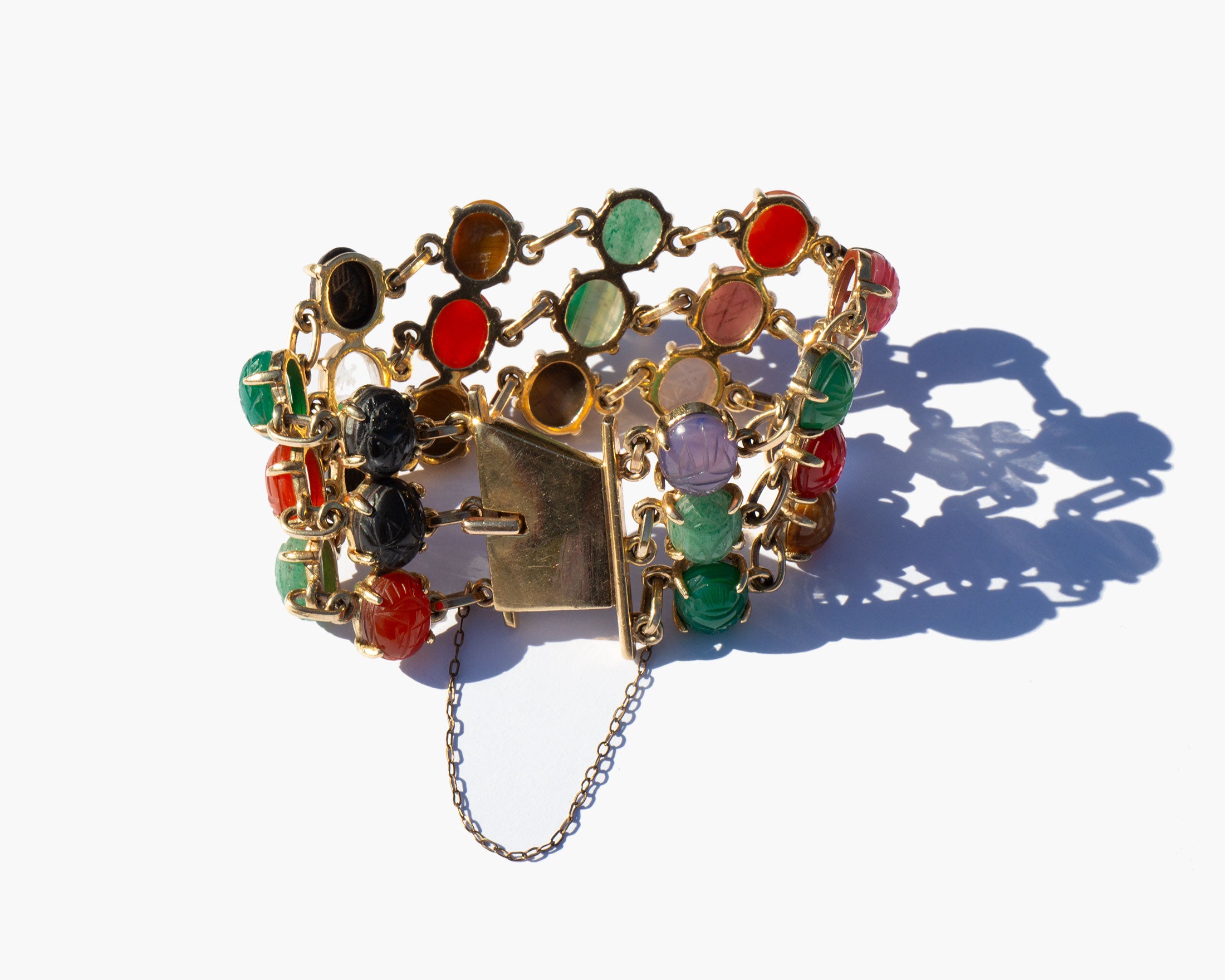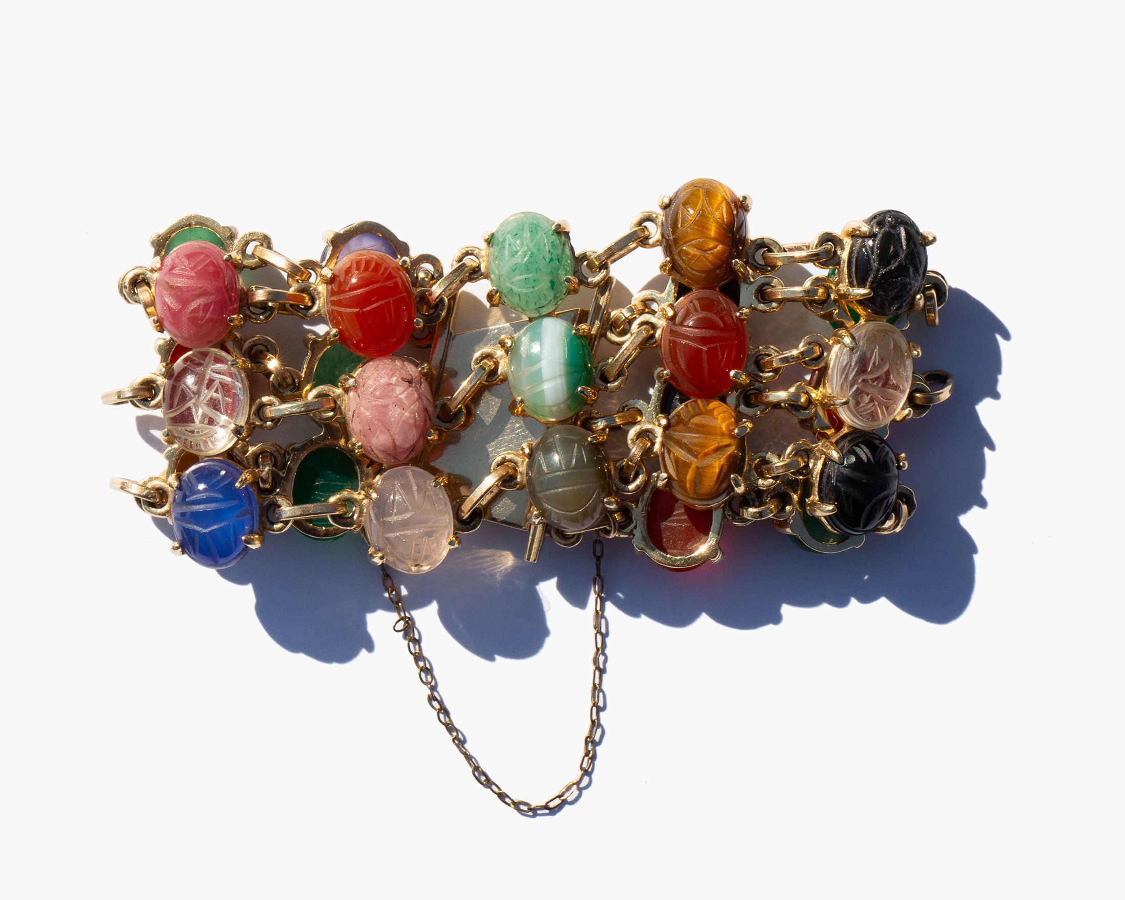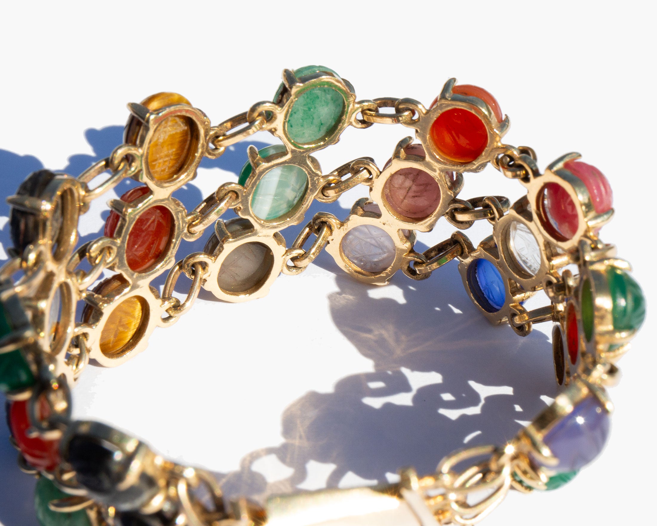 Large and decadent 1970's 14k gold triple strand bracelet with carnelian, quartz, lapis, rose quartz, tiger's eye, and other semi precious stone scarabs. The scarab is an ancient symbol of spontaneous creation and rebirth. In ancient Egypt Scarab amulets were used to protect the deceased in the afterlife and a scarab talisman provided the living wearer with defenses against evil and bad luck and a confidence in the certain knowledge of reincarnation.