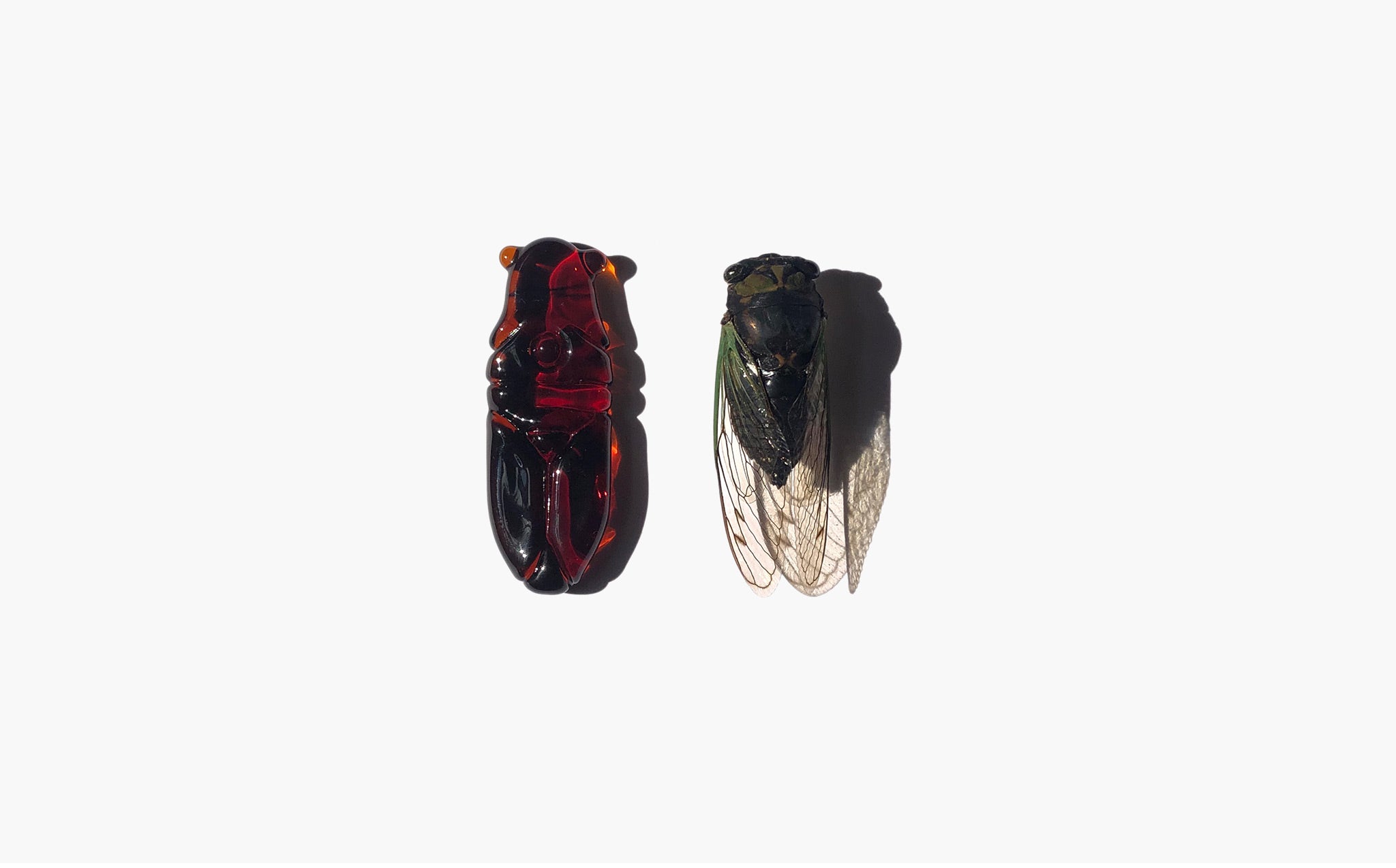 Inspired by the shrill love song of the cicada, ancient poets wrote verses dedicated to the insects life-cycle and mysterious emergence from the ground. Revered for centuries, the cicada was at one time thought to survive only on dew and air. Socrates believed that cicadas were humans that existed before the birth of the muses and their invention of song. Hearing the beautiful music for the first time, these men and women became so charmed and entranced that they sang in an ecstasy, forgetting to eat or drink, until they died. Taking pity on the unfortunate songsters, the muses turned them into insects, granting them the pleasure of singing continuously, without the need for sustenance. Since the times of these ancient odes and fables, many cultures have linked cicadas and their fevered mating songs with love, sexuality, and eroticism, and analogies have been drawn between their cast off shells and the end of the human life span, during which some believe that a hollow form is left behind as the spirit enters the afterlife.