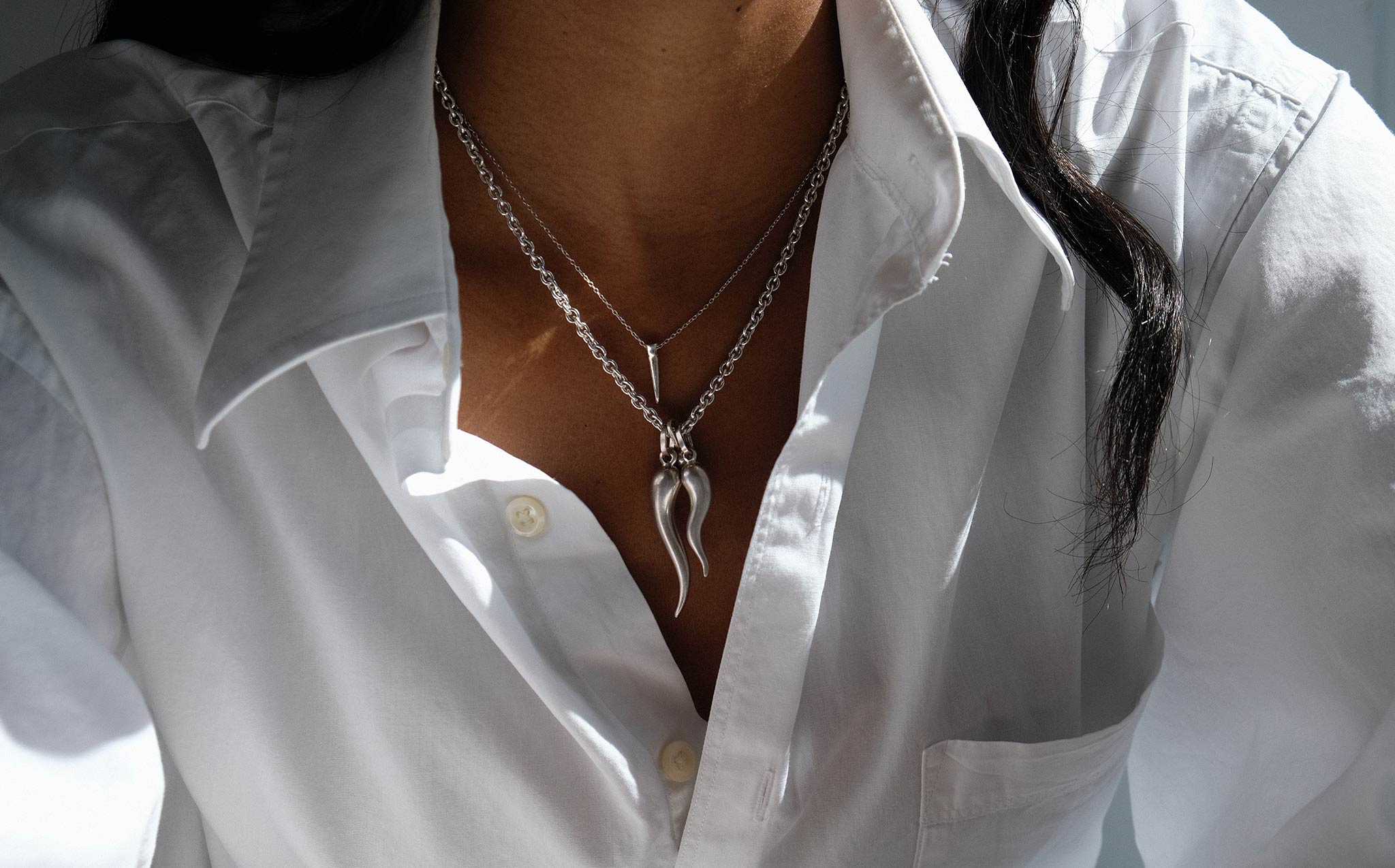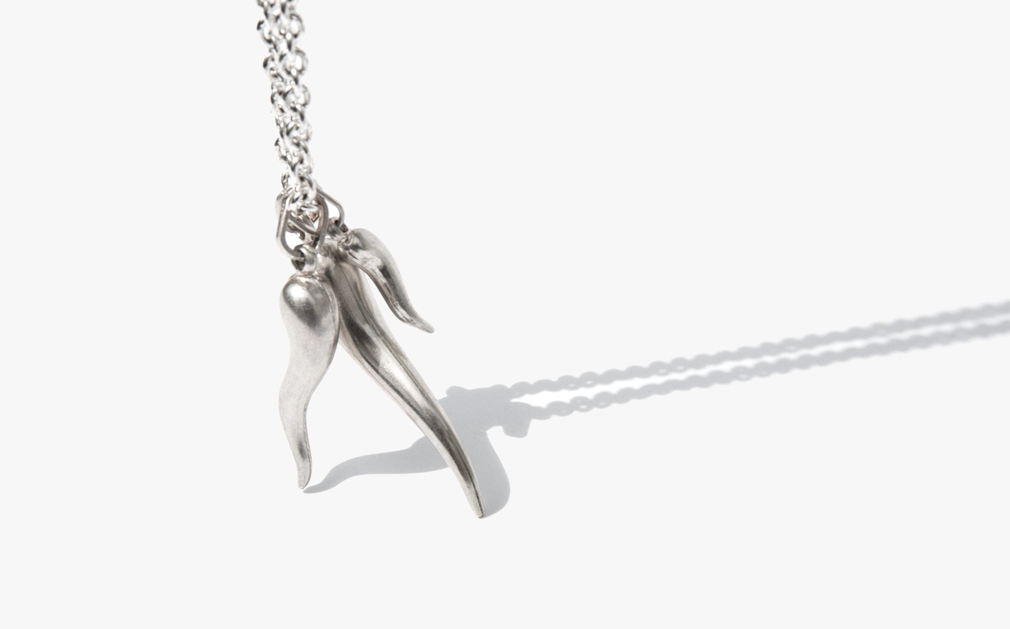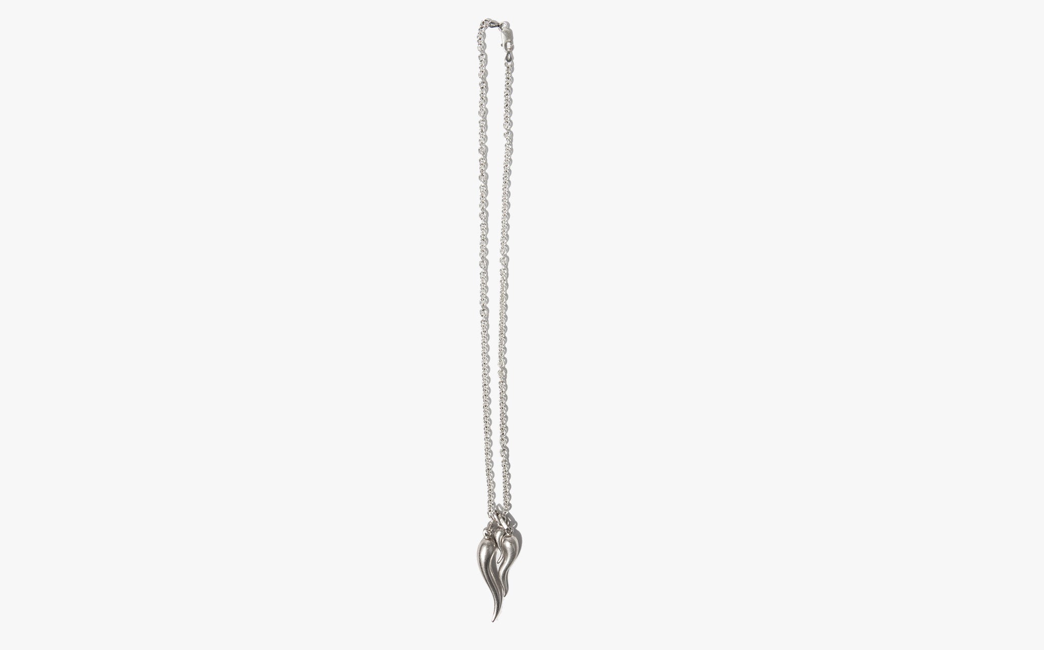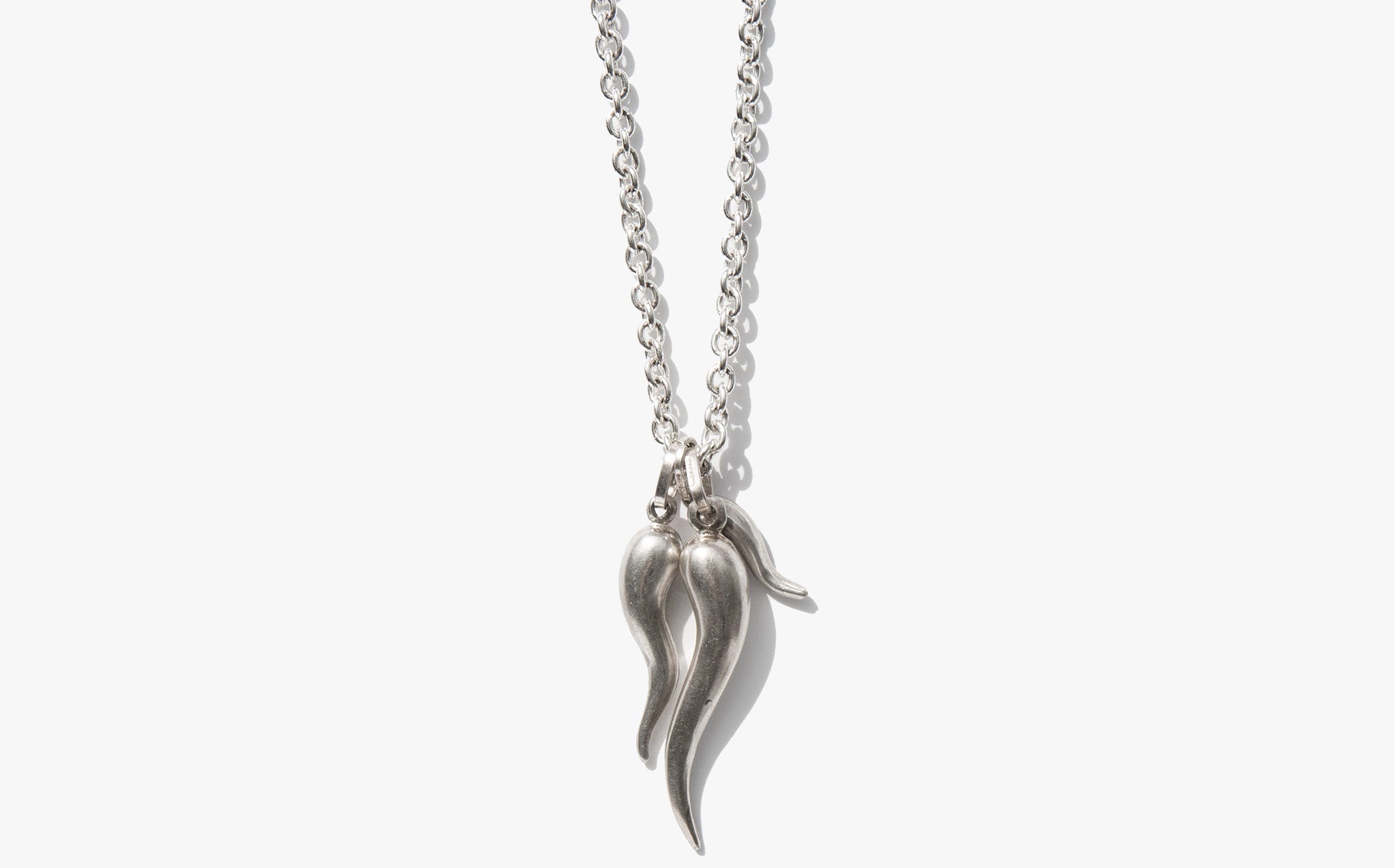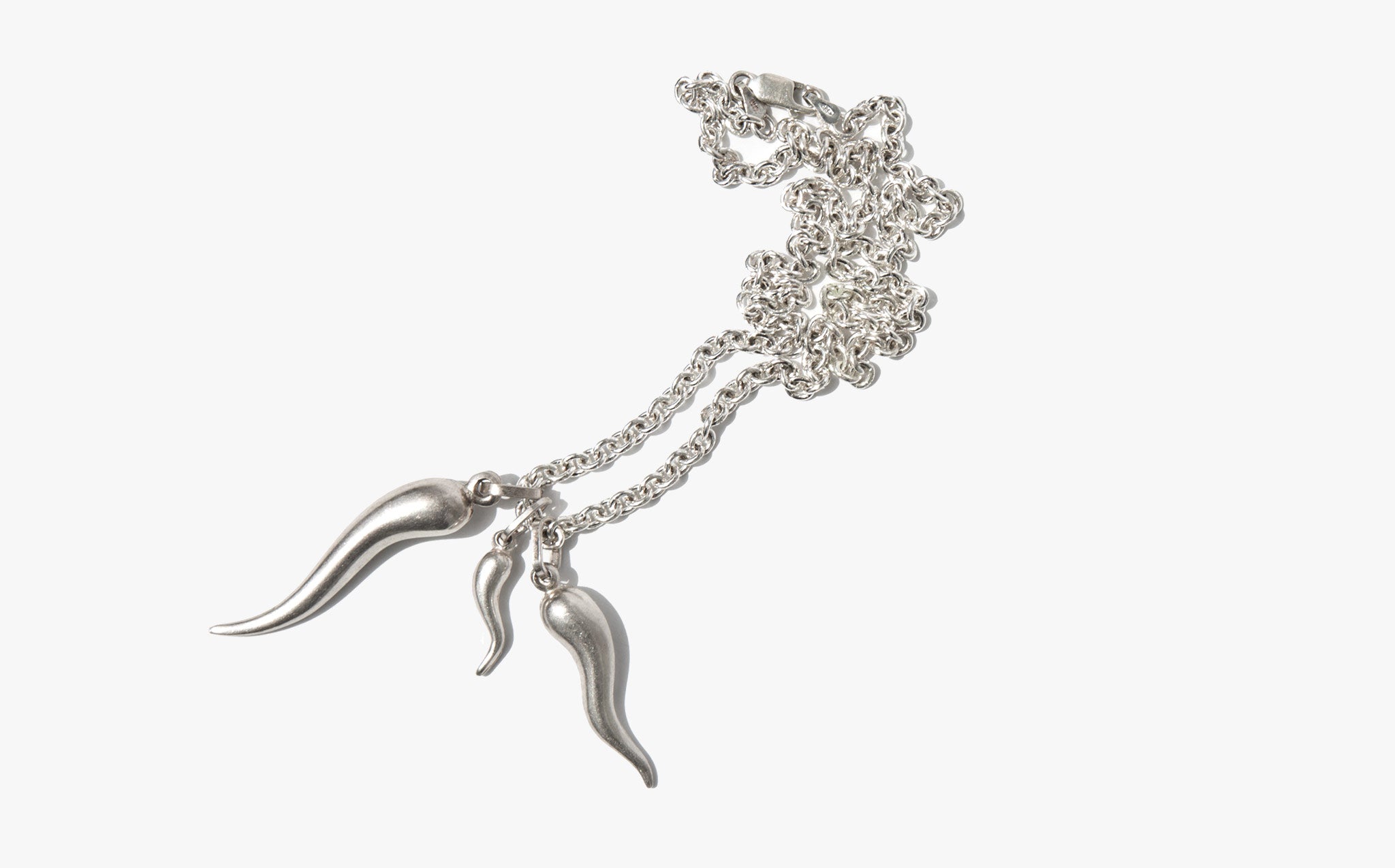 Pretty round link sterling silver chain with a trio of silver corna, the Italian horn amulet. Corna are traditionally worn to ward off bad luck and the malocchio or evil eye.