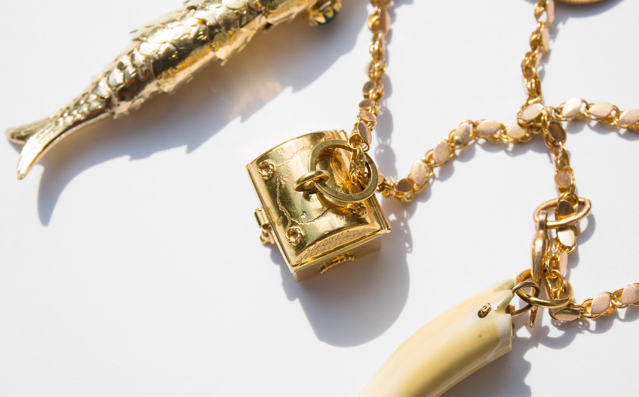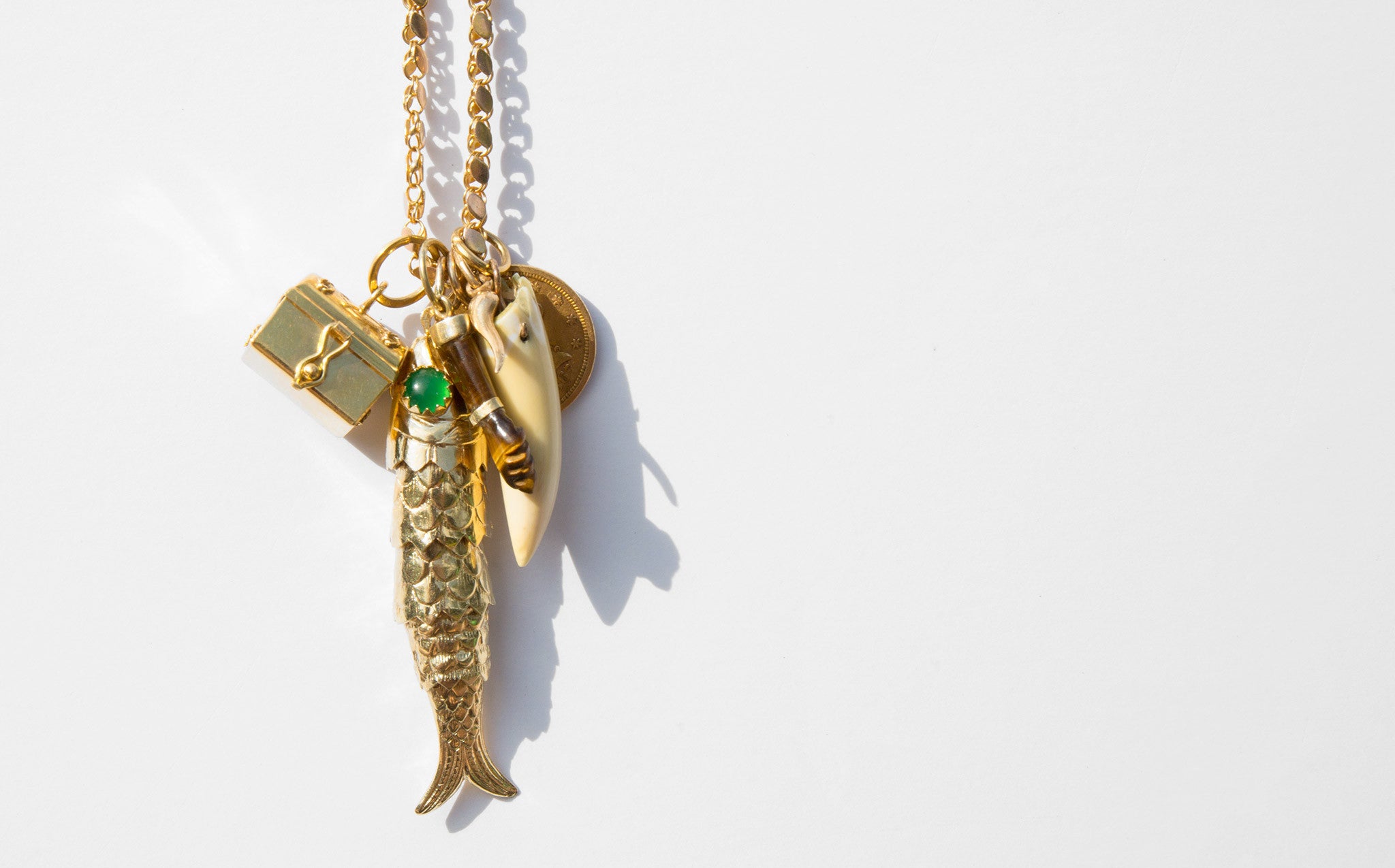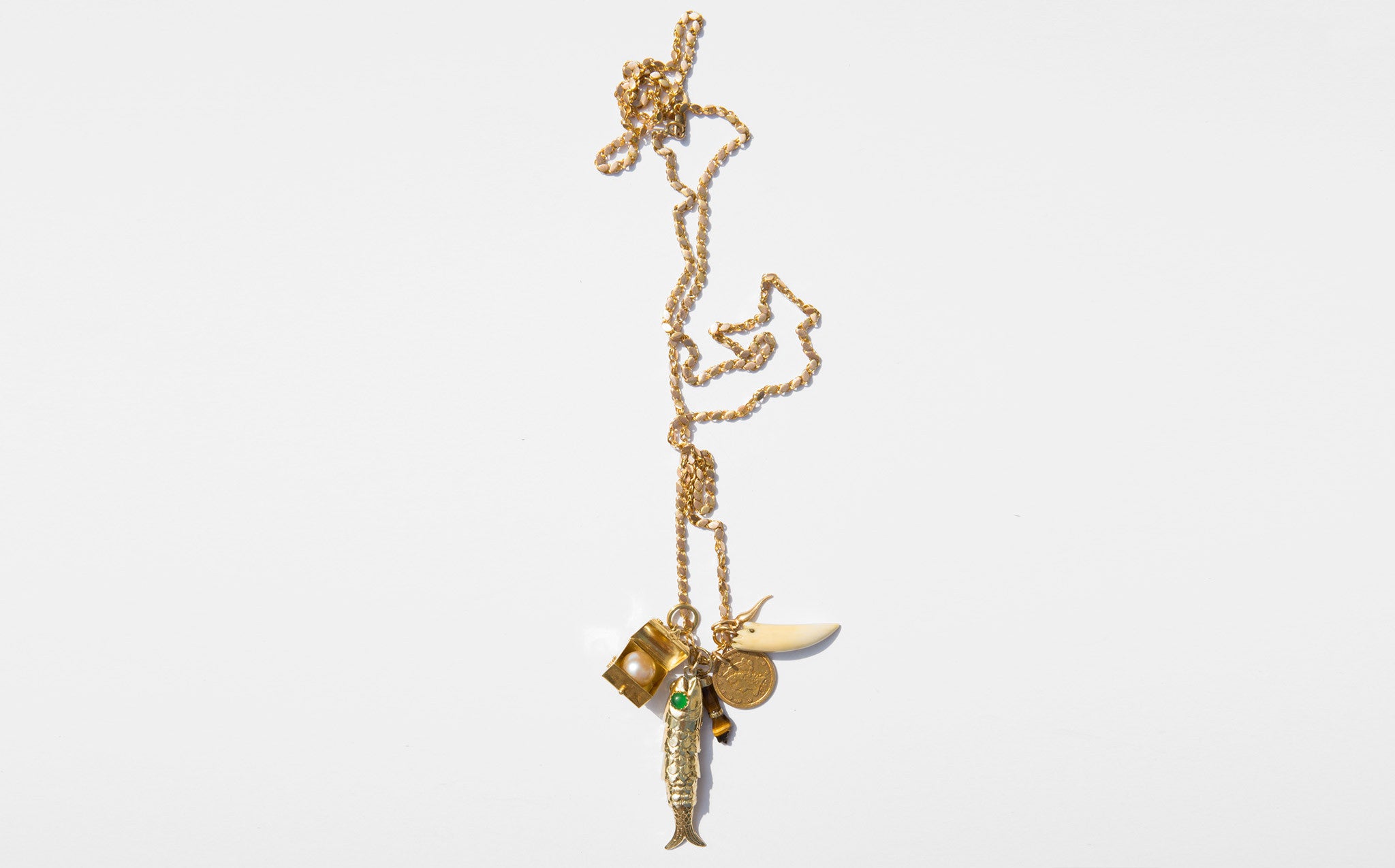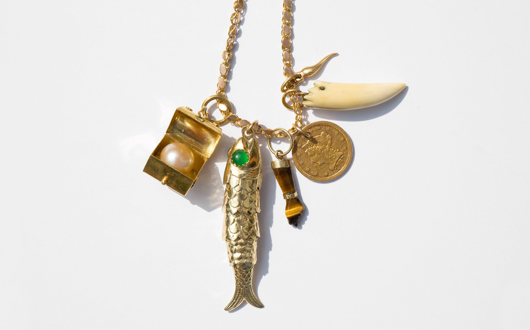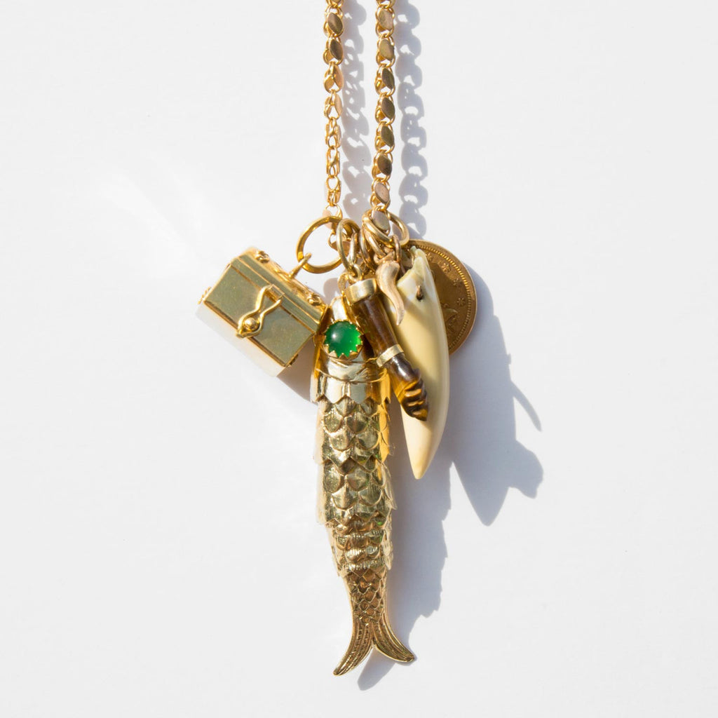 A fantastically poignant charm necklace for the irrepressible traveler. Unusual and thick 14k gold link chain with a cluster of symbolic charms to accompany and protect throughout life's journeys. Charms include an 18k gold treasure chest that opens to reveal a cultured pearl, a large 14k gold opposable fish, tiger eye figa charm edged in 14k gold, 14k gold corno charm, a 22k gold 2.5 dollar liberty coin, and a vintage animal tooth charm.