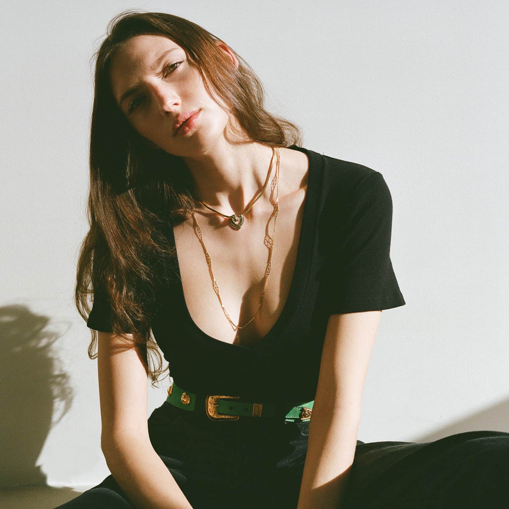 This one hits the sweet spot – a cleavage enhancing deep V-neck t-shirt with a long and lean frame in a fitted stretch-rib deadstock fabric.