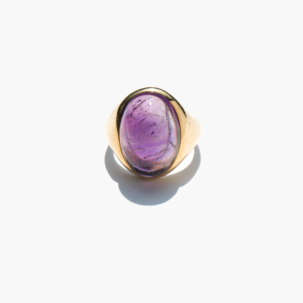Mesmerizing, translucent amethyst cabochon ring in a weighty 14K gold setting.