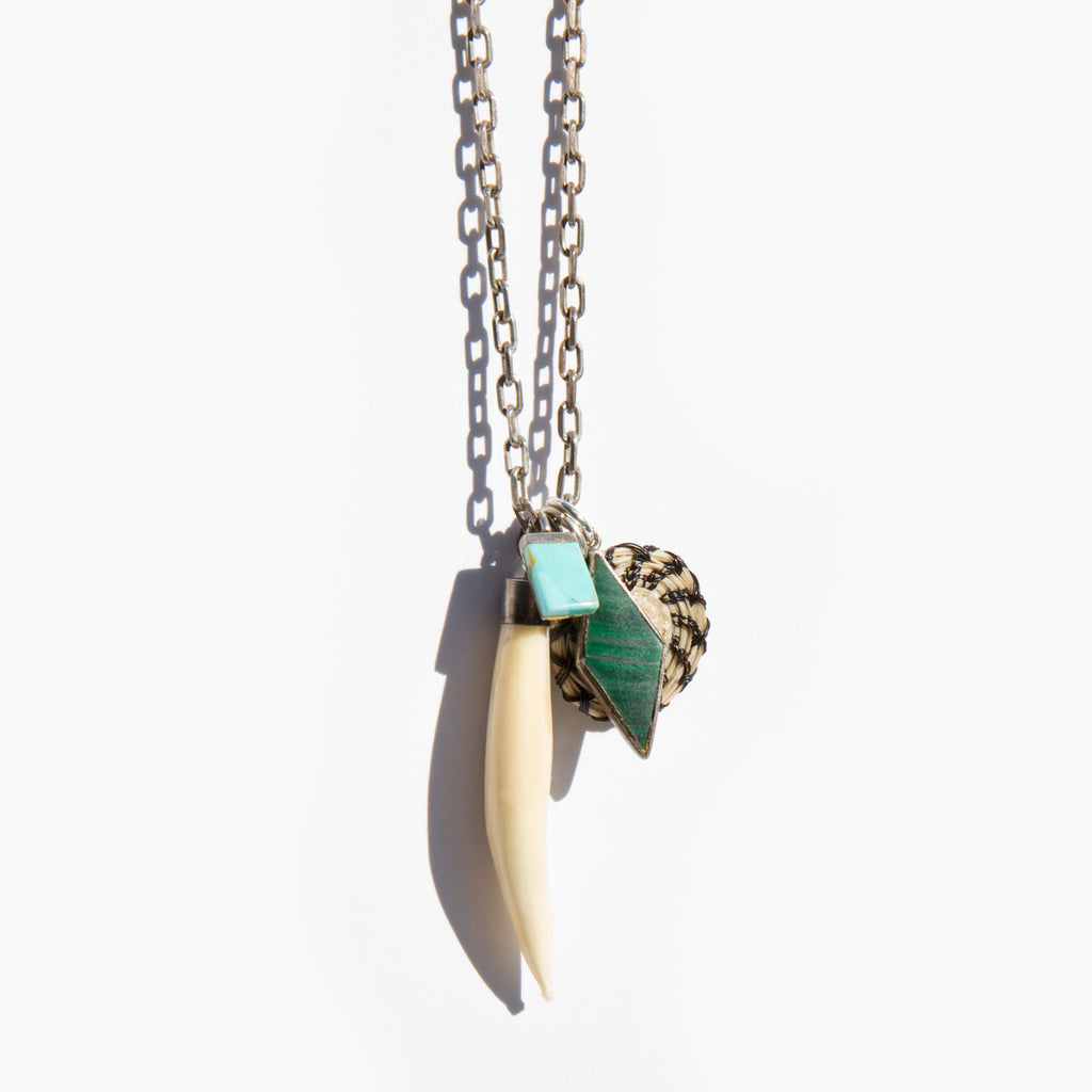 Unique, western inspired charm necklace with an array of vintage, one-of-kind charms. A handmade, woven horsehair charm handmade by the Tohono O'odham Native Americans, a sterling silver edged piece of turquoise, a diamond shaped malachite charm, and a large cow horn charm.