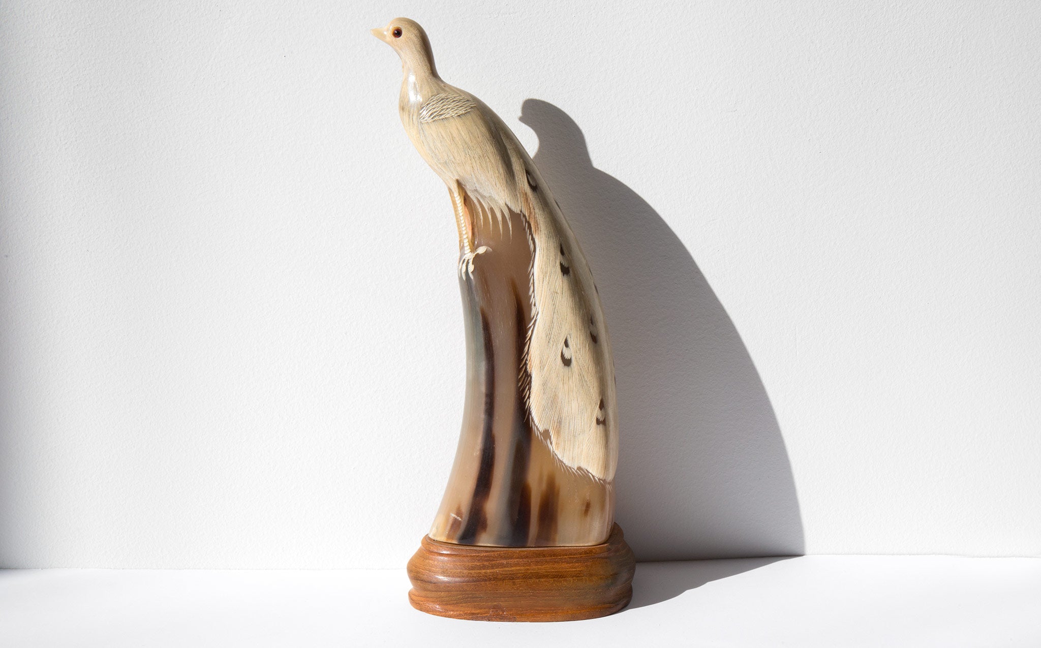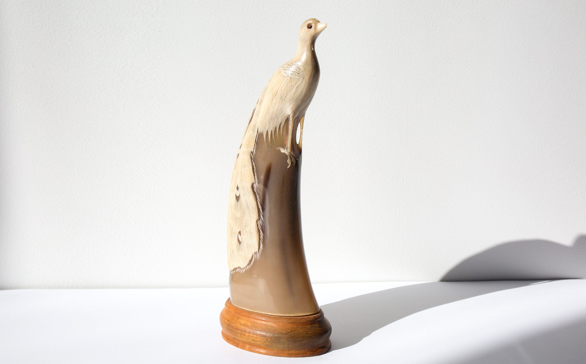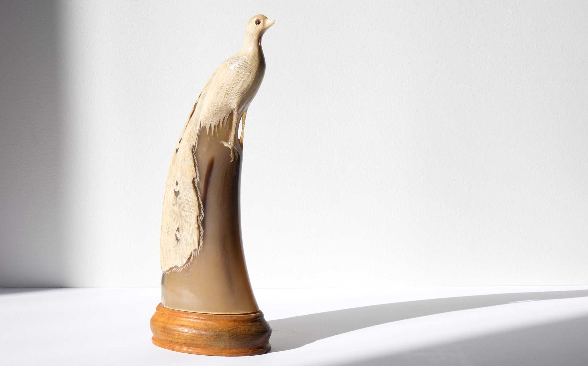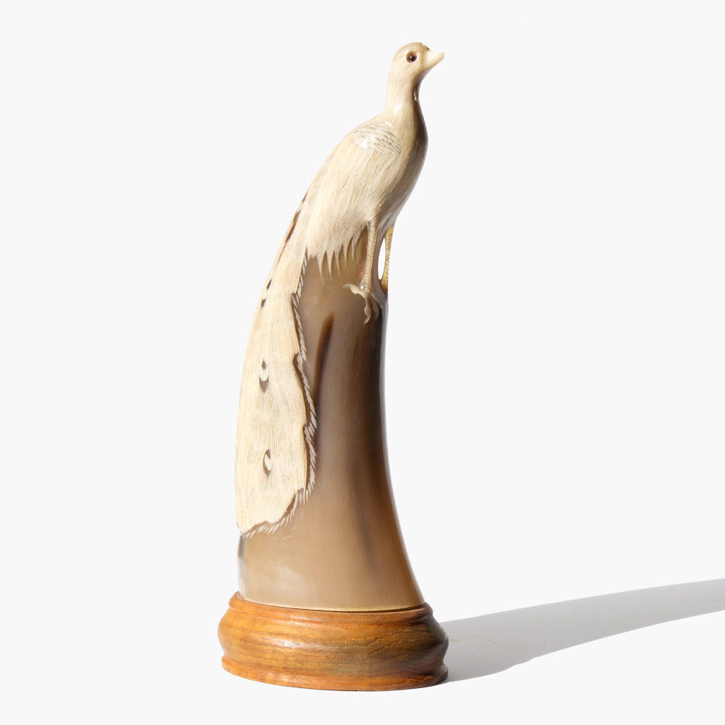 Carved horn peacock mounted on a wooden base. The Ancient Greeks worshipped the stunningly plumed bird because they believed that Zeus's wife Hera created the fowl's abstract plumage when her loyal watchmen Argus was killed by Hermes and she placed his eyes on the peacock's tail as an everlasting tribute to his loyalty.