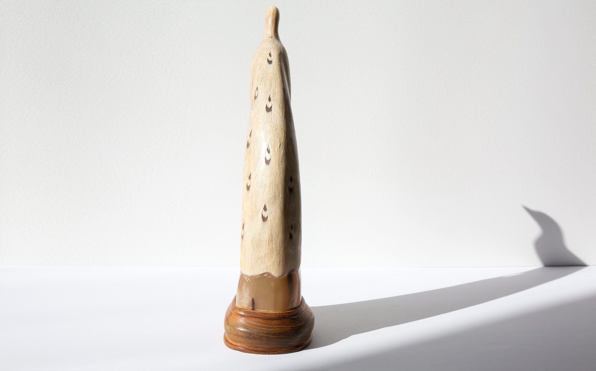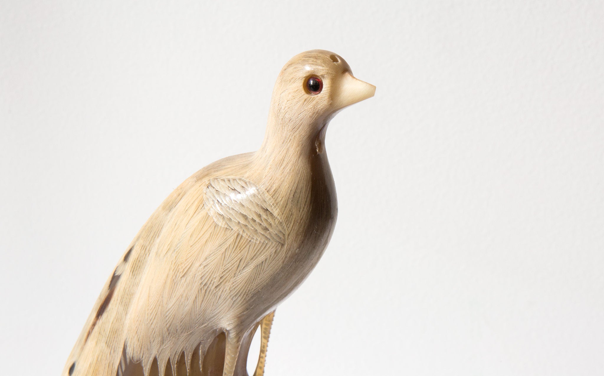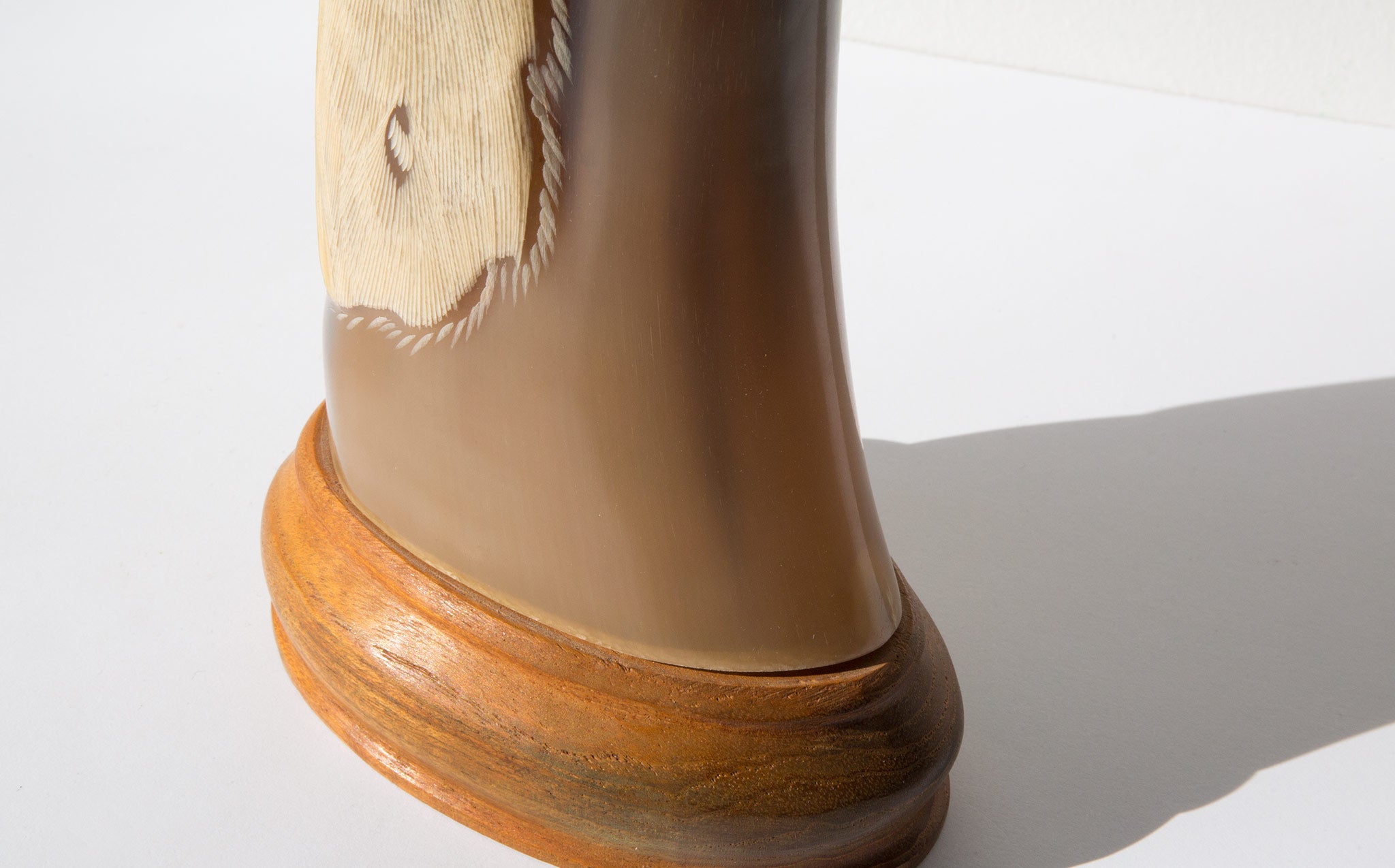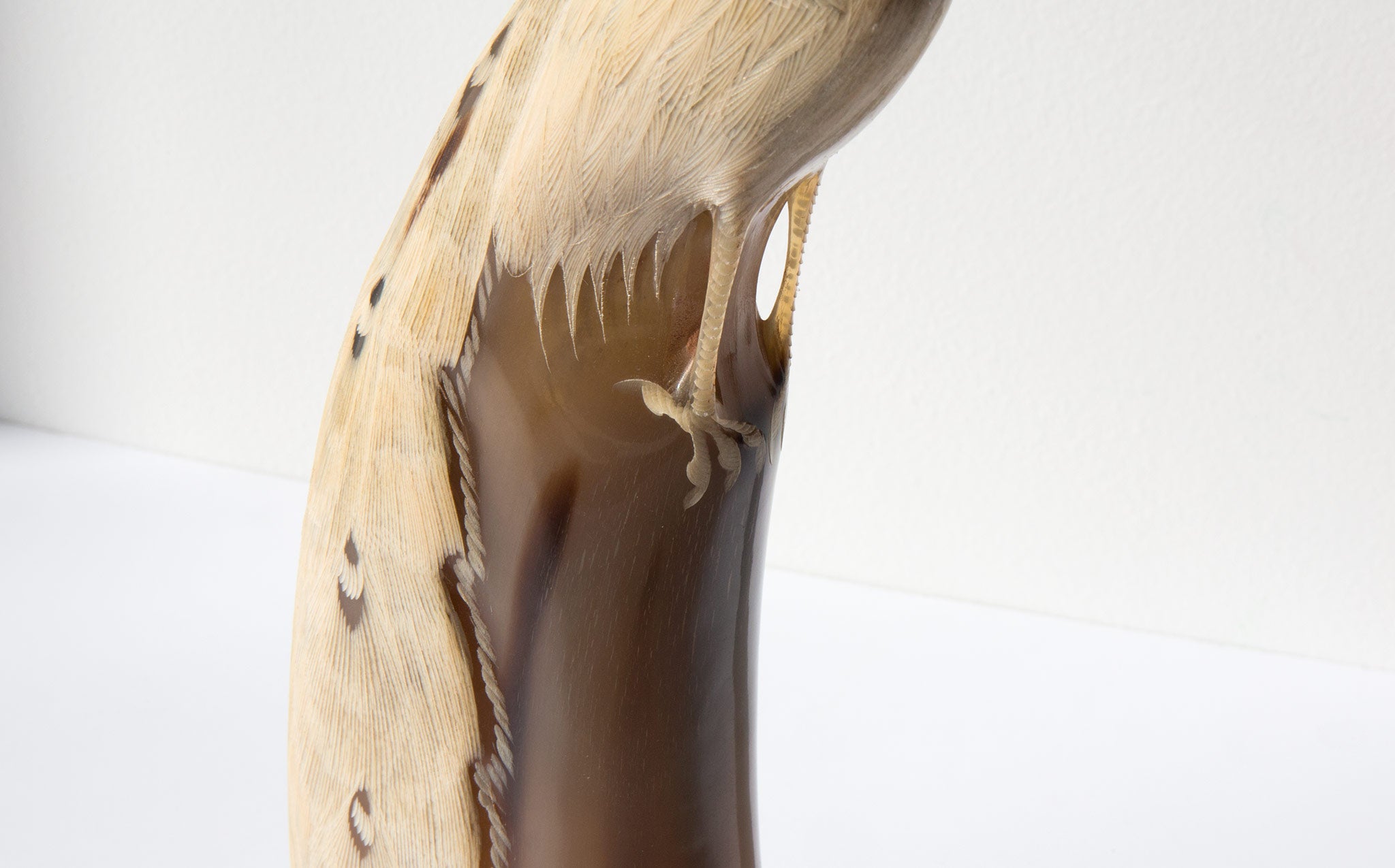 Carved horn peacock mounted on a wooden base. The Ancient Greeks worshipped the stunningly plumed bird because they believed that Zeus's wife Hera created the fowl's abstract plumage when her loyal watchmen Argus was killed by Hermes and she placed his eyes on the peacock's tail as an everlasting tribute to his loyalty.