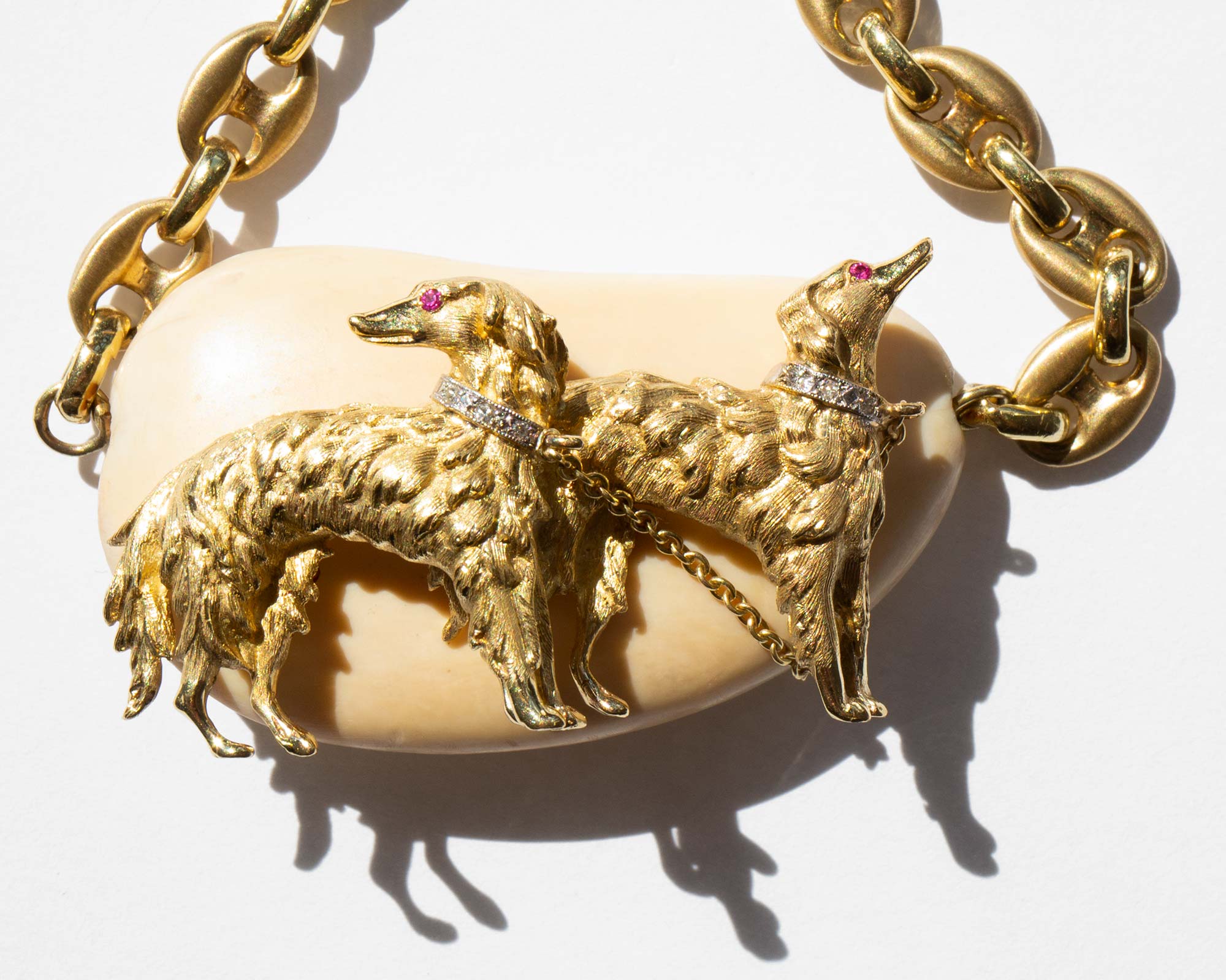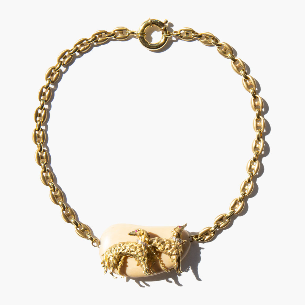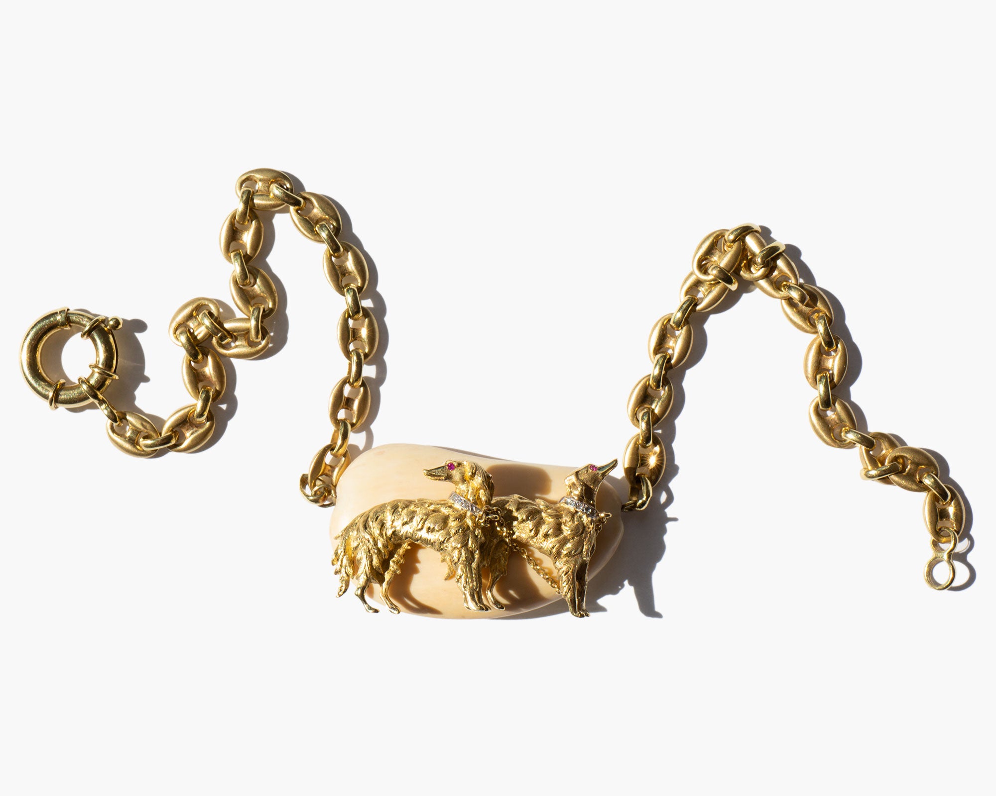 An incredible, one-of-a-kind custom estate piece – weighty and thick, solid 14k gold mariner link choker chain with a large natural bone pendant that features two solid 14k gold Borzoi dogs with diamond collars and ruby eyes.