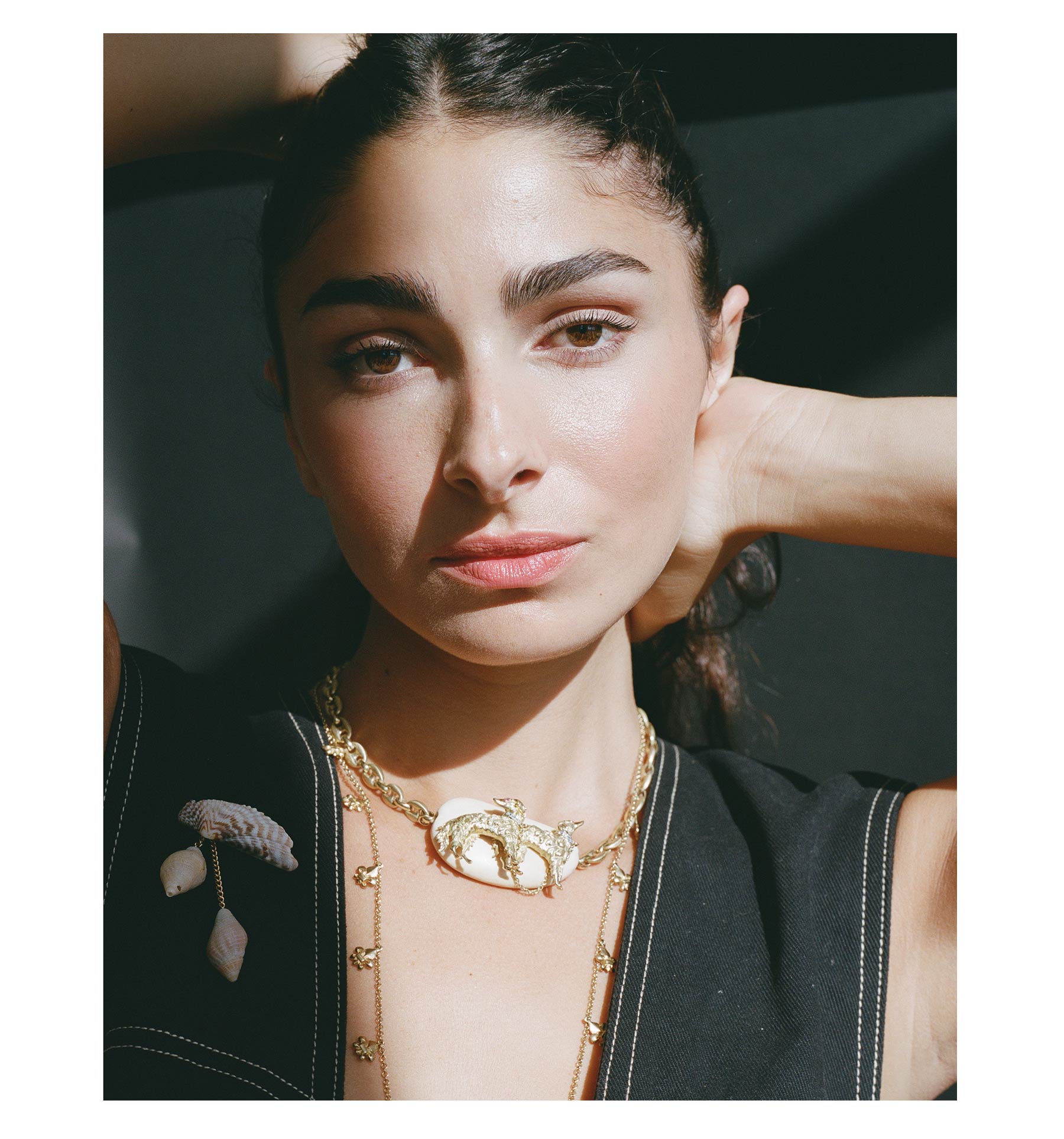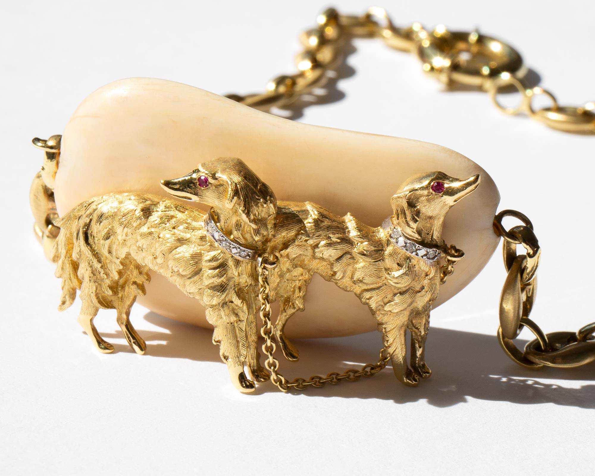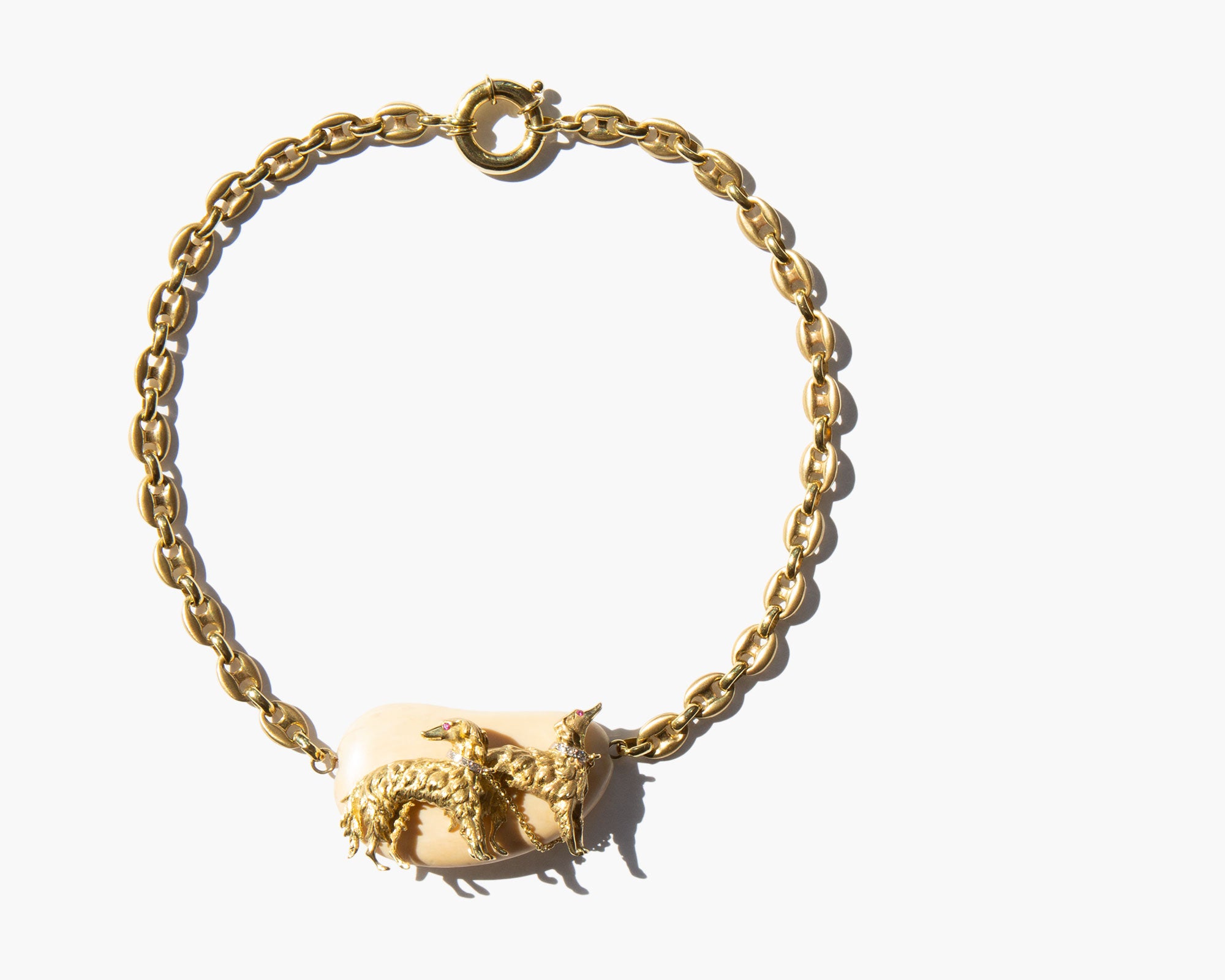 An incredible, one-of-a-kind custom estate piece – weighty and thick, solid 14k gold mariner link choker chain with a large natural bone pendant that features two solid 14k gold Borzoi dogs with diamond collars and ruby eyes.