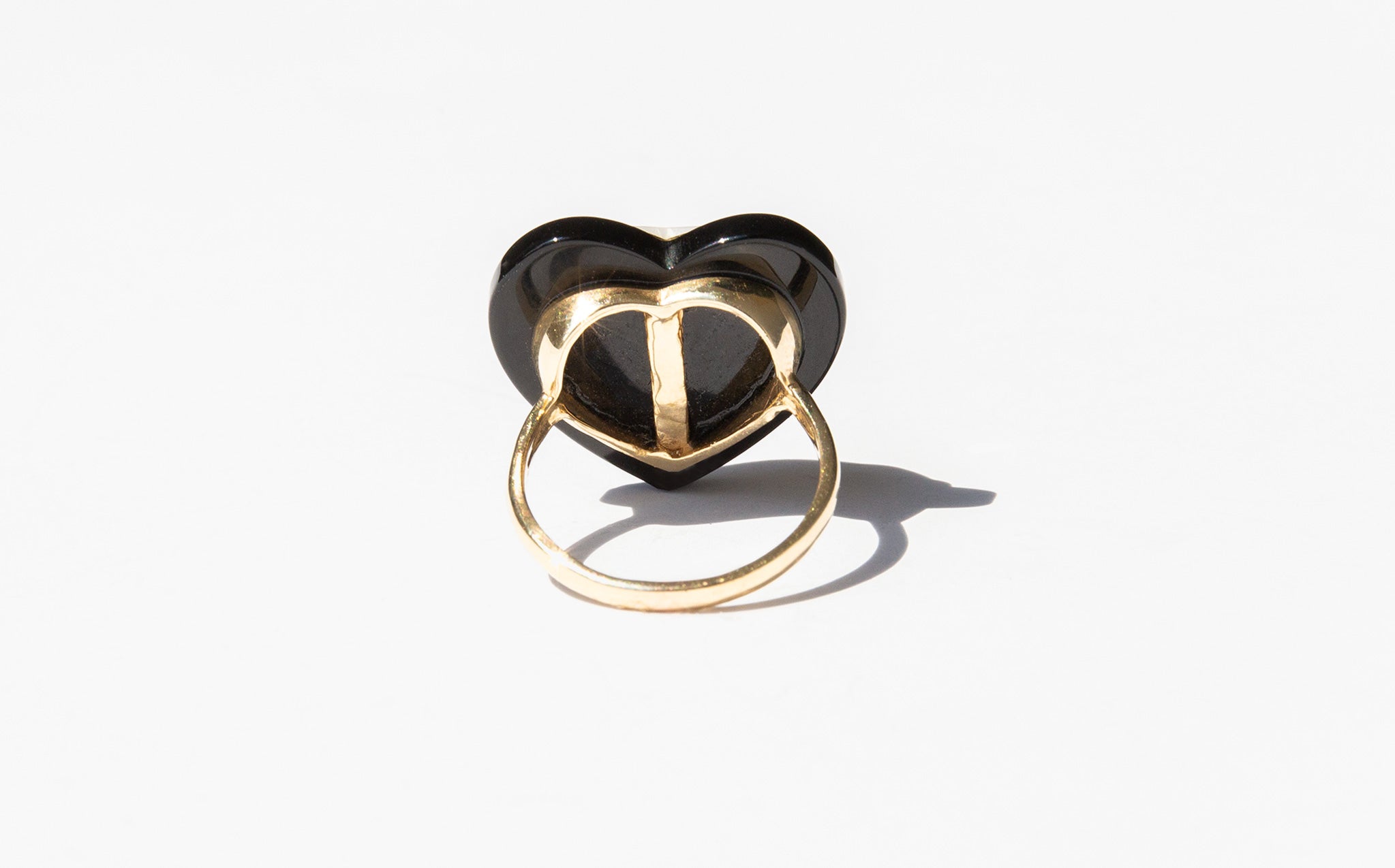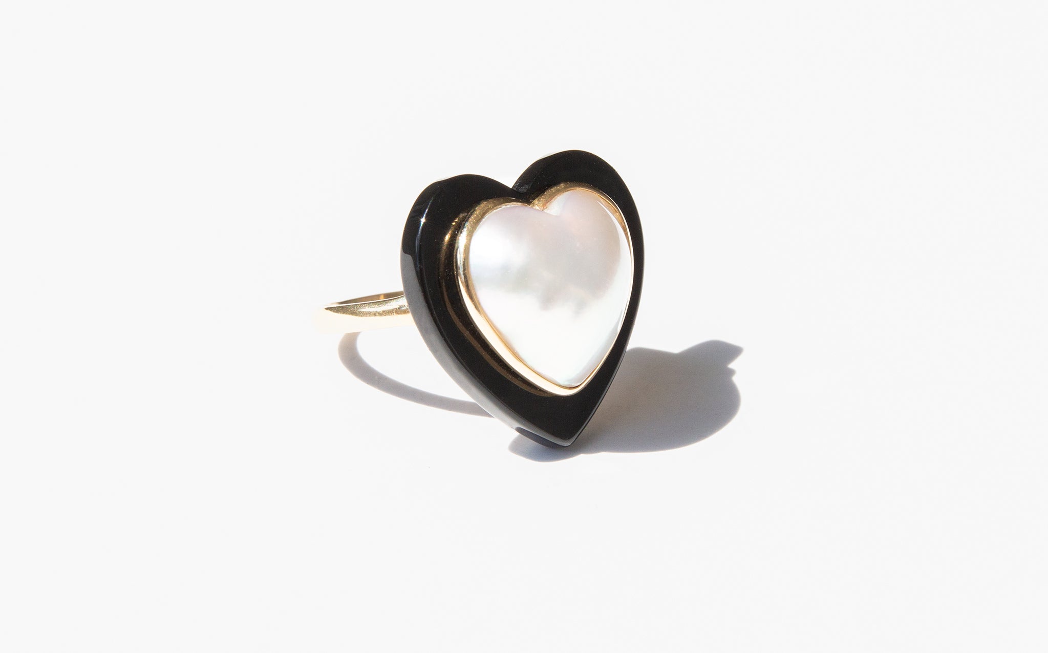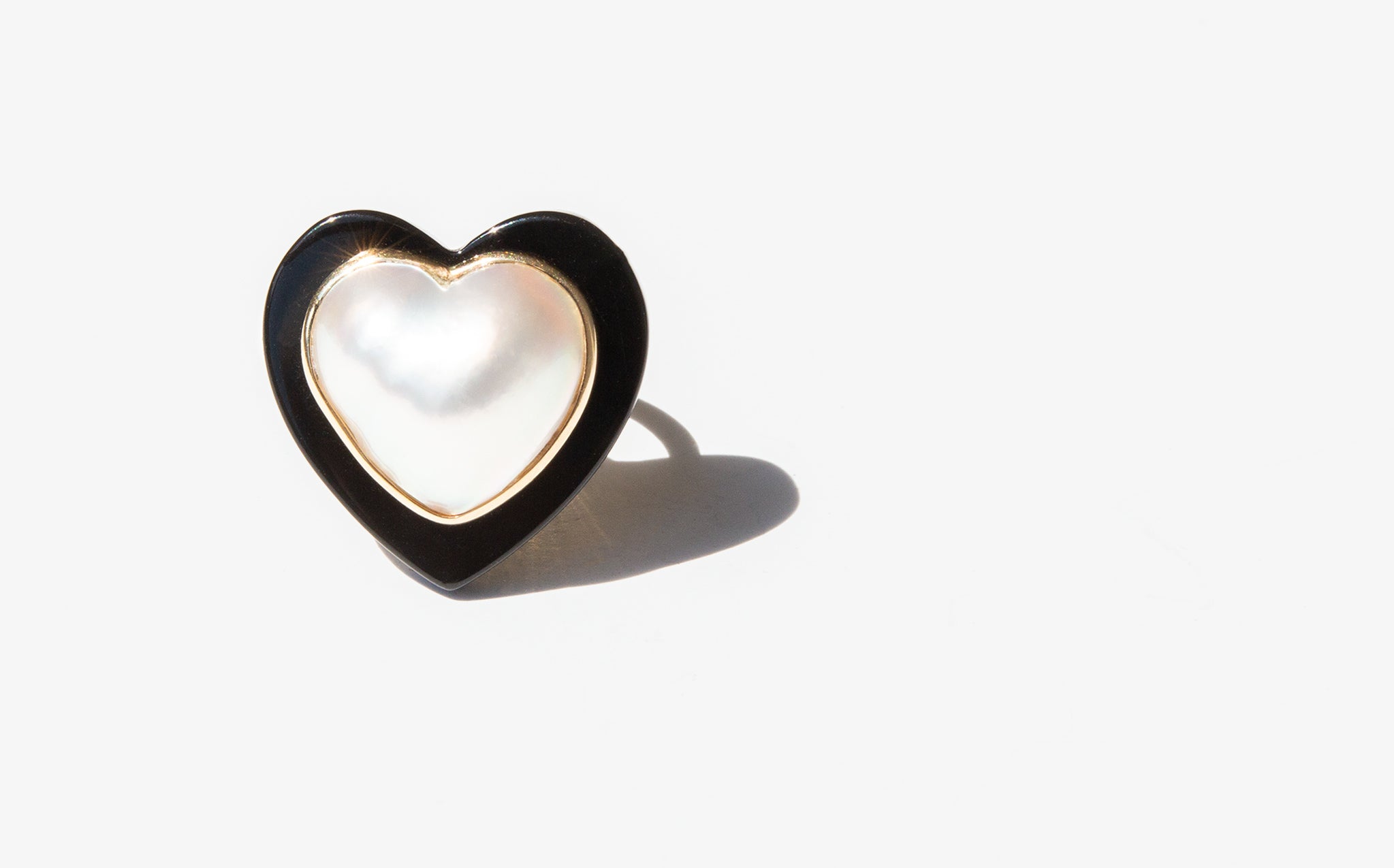 Ethereally iridescent mabe pearl heart ring set in onyx and 14k gold.