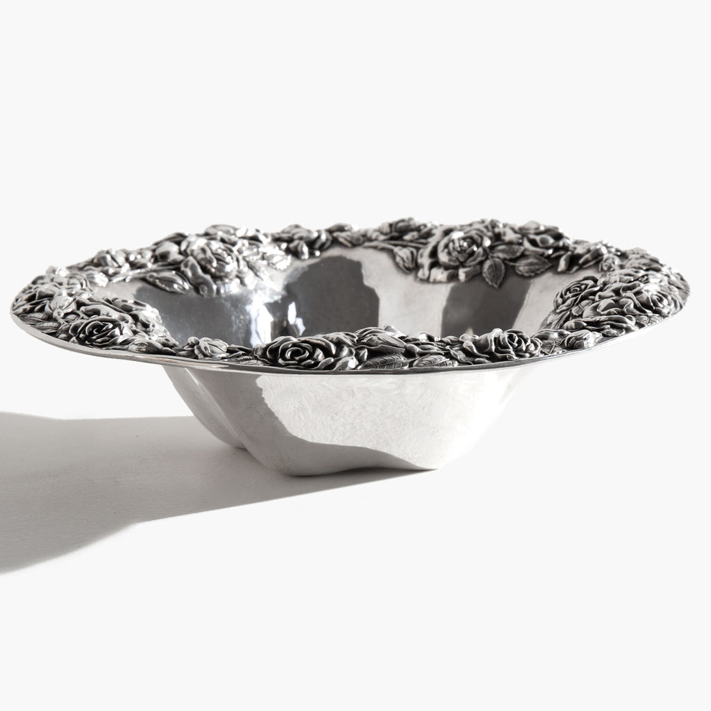 Beautifully worked late 19th century art-nouveau sterling silver bowl accented with roses. Crafted at the Unger Brothers Jewelry Company in Newark NJ between 1870 and 1900.