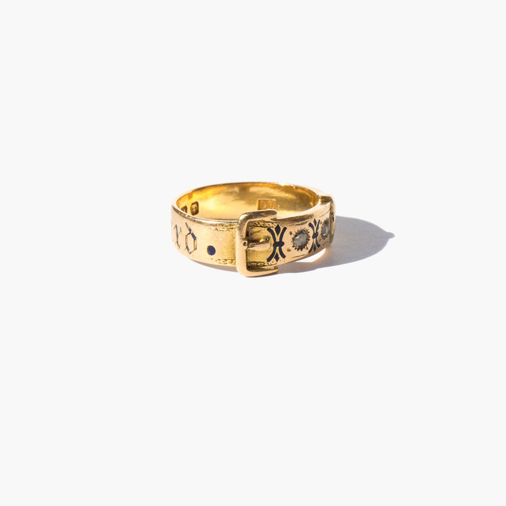 Antique Victorian 18k gold "Regard" buckle ring with rose cut diamonds and black enamel. During the Victorian era Regard rings were given as engagement rings and tokens of love and the buckle symbolized a lasting commitment.