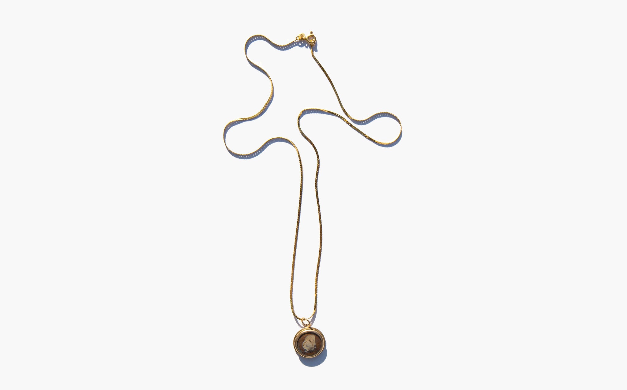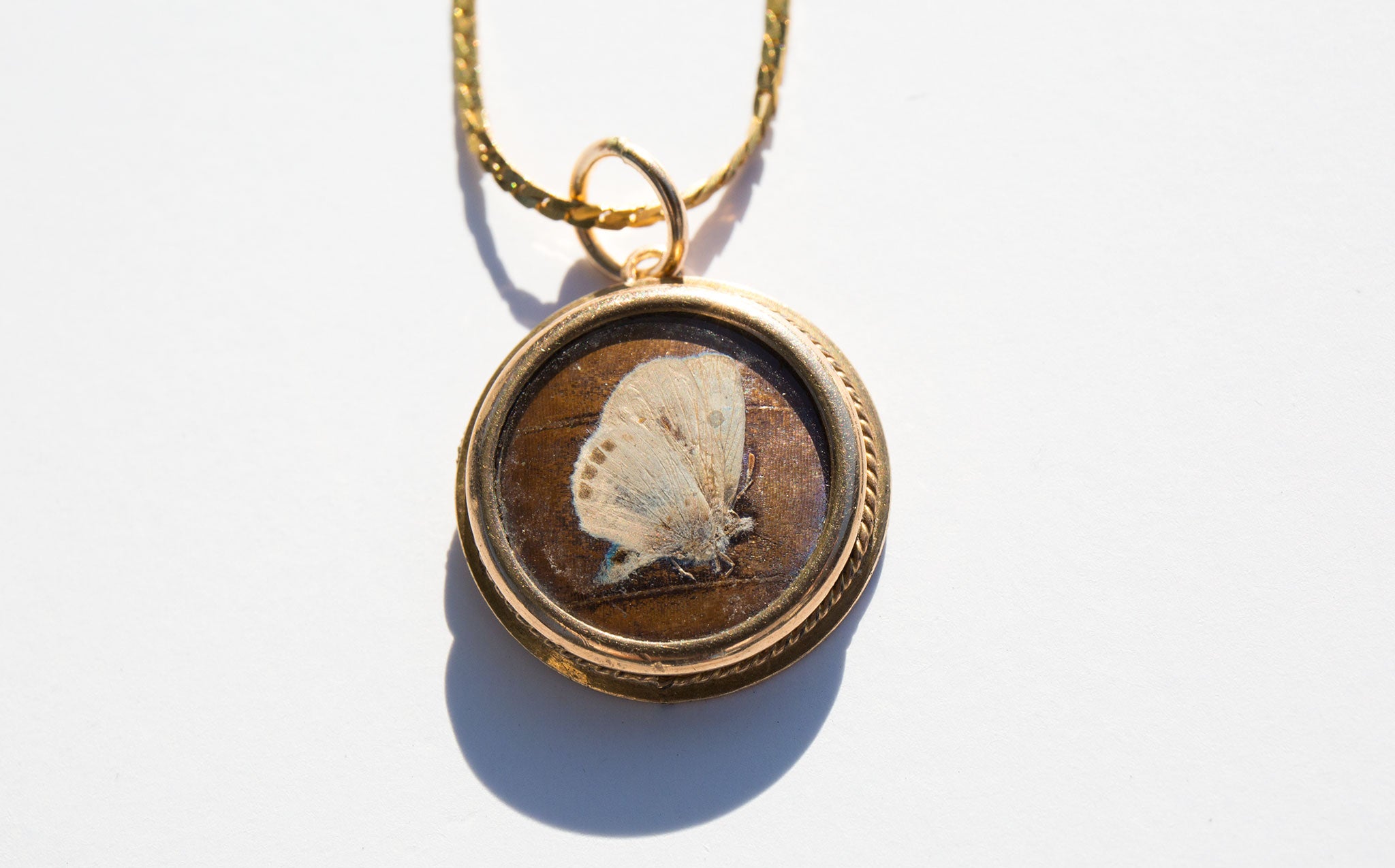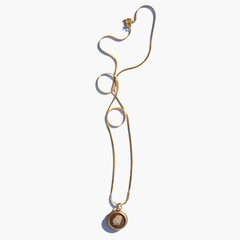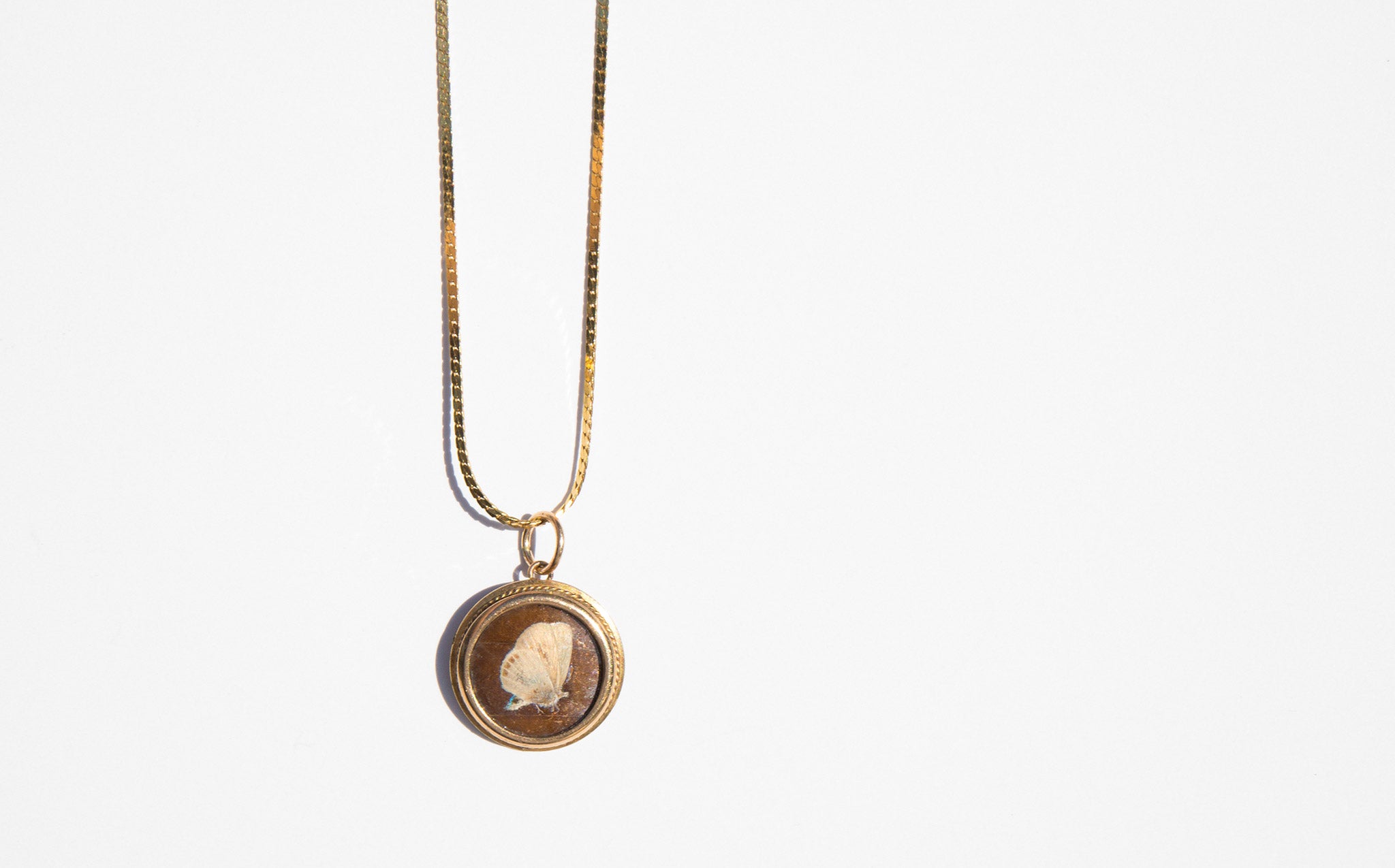 Antique gold-tone charm with a tiny pressed butterfly in a glass encasement strung on a sparkling 14k gold chain.