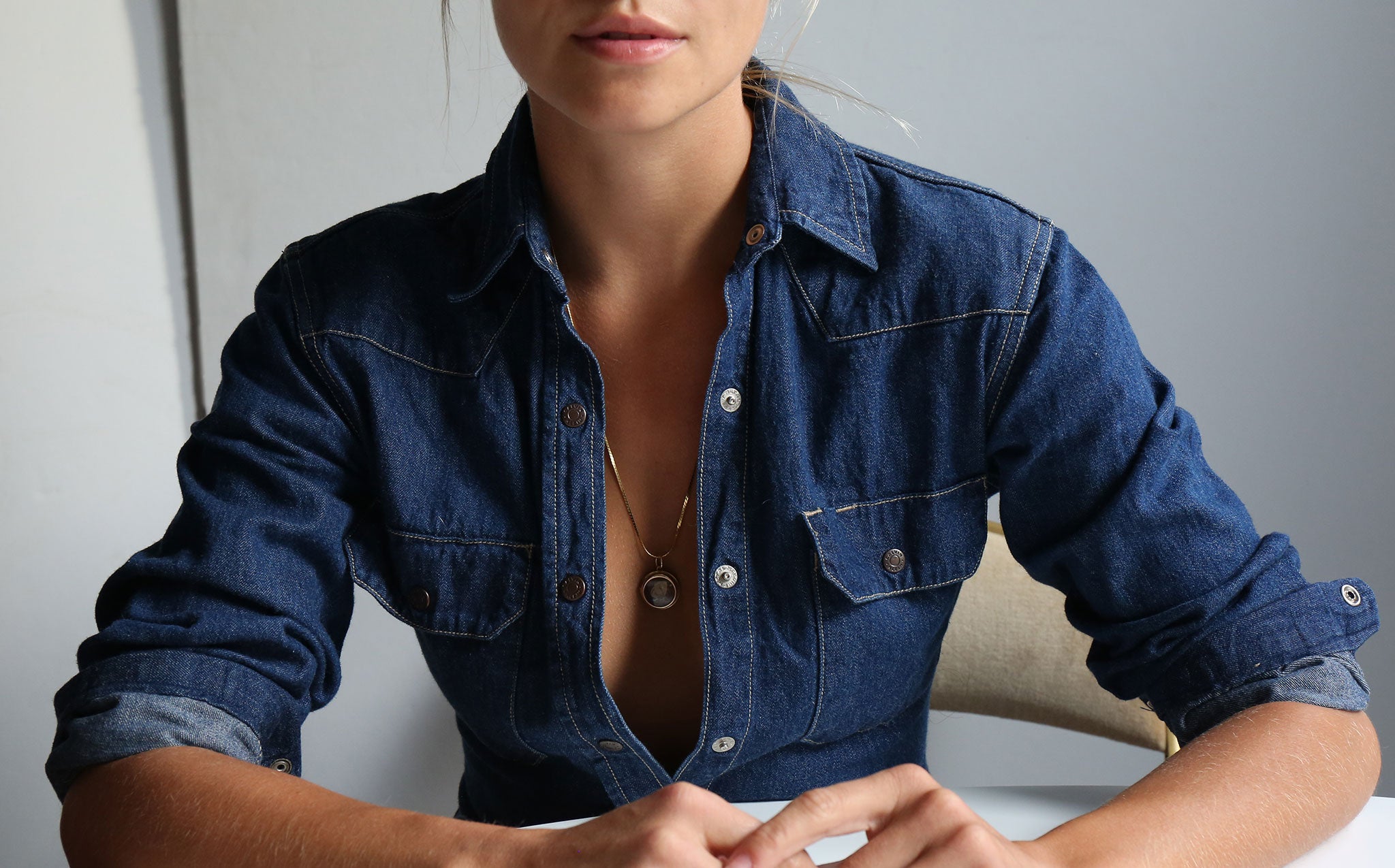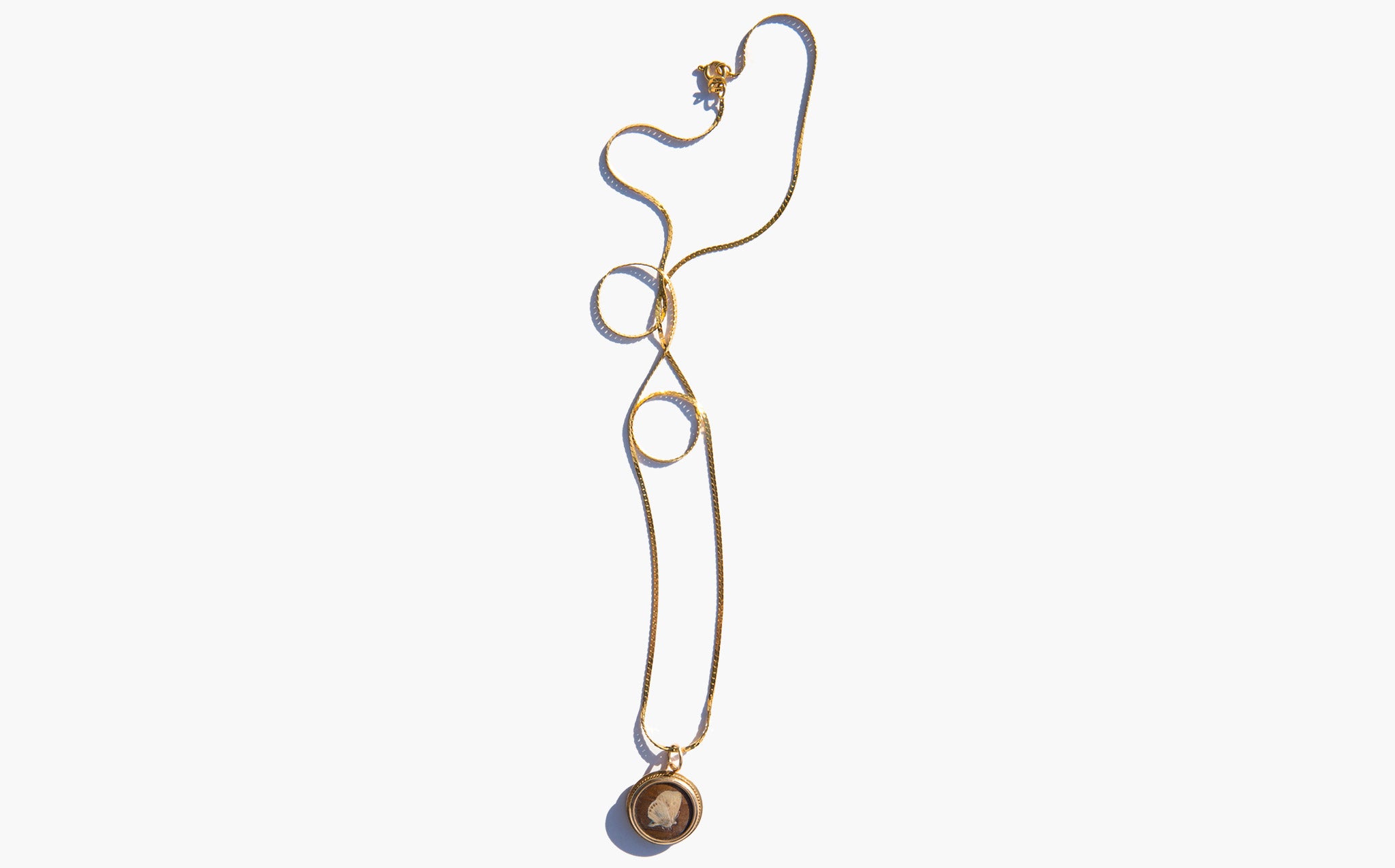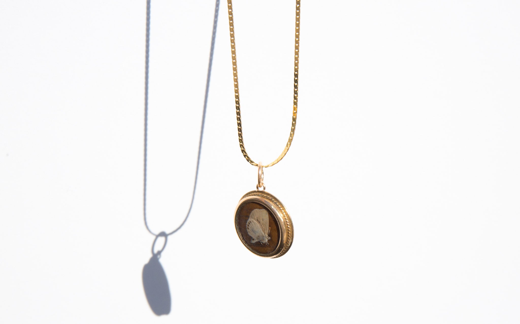 Antique gold-tone charm with a tiny pressed butterfly in a glass encasement strung on a sparkling 14k gold chain.