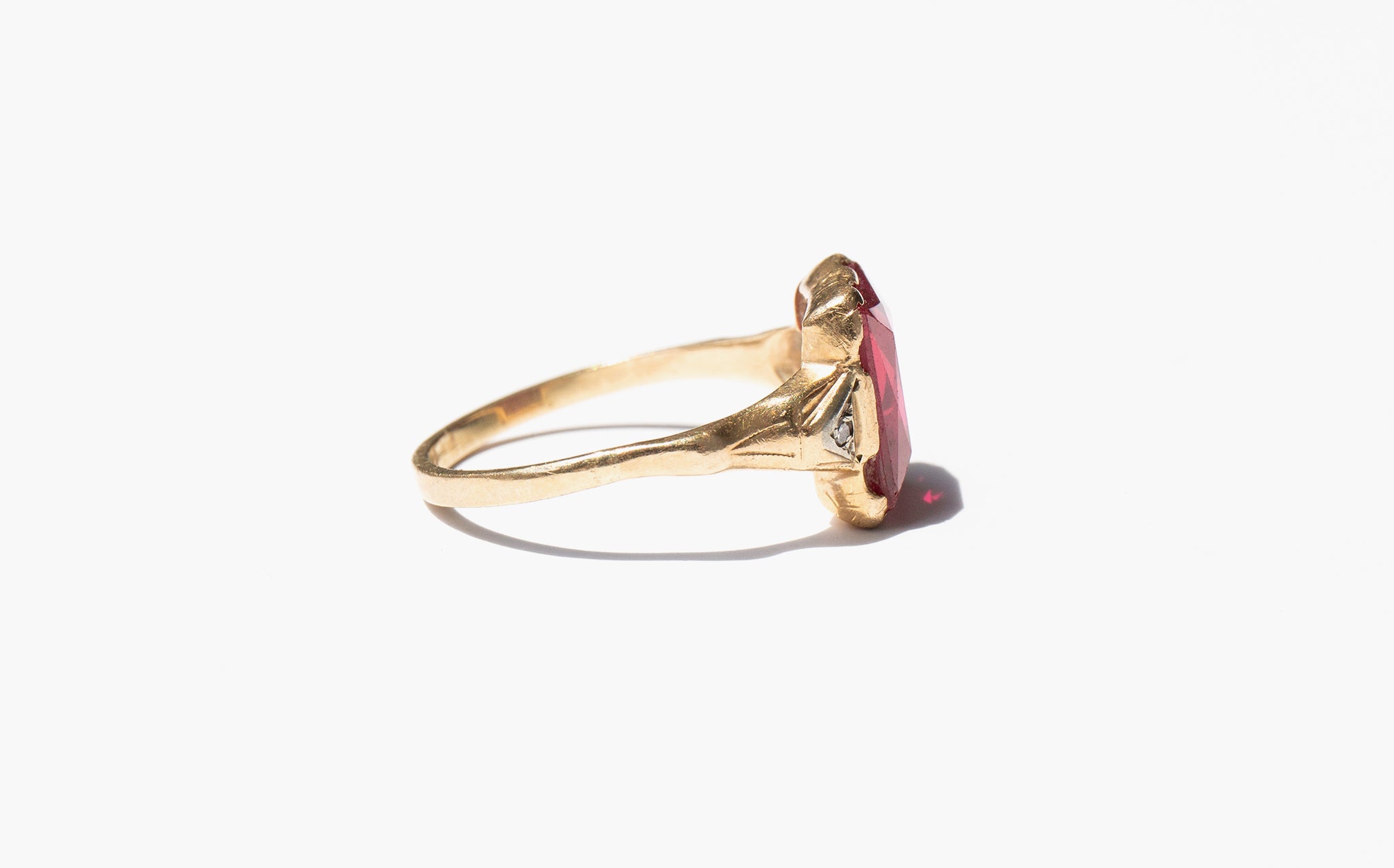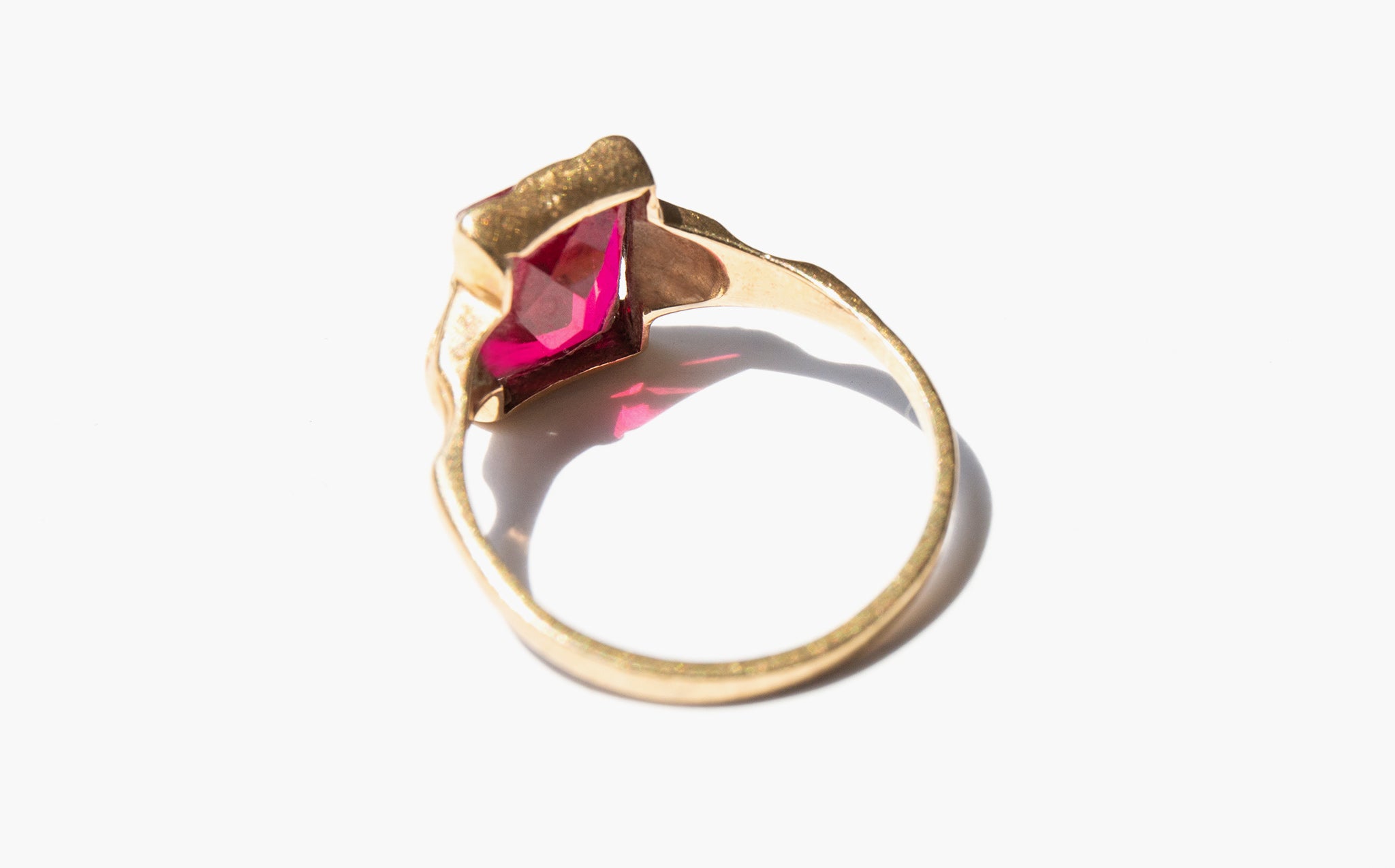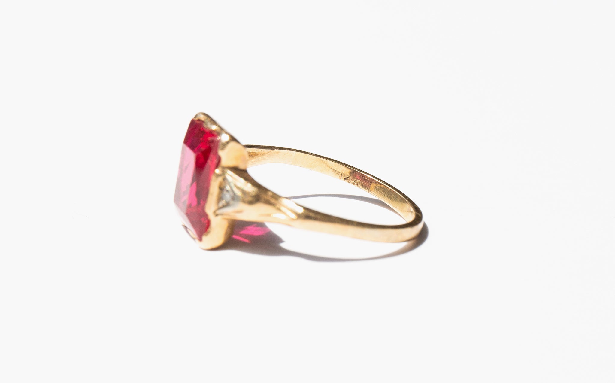 Beautiful blood red glass stone in a refined 14K gold setting.