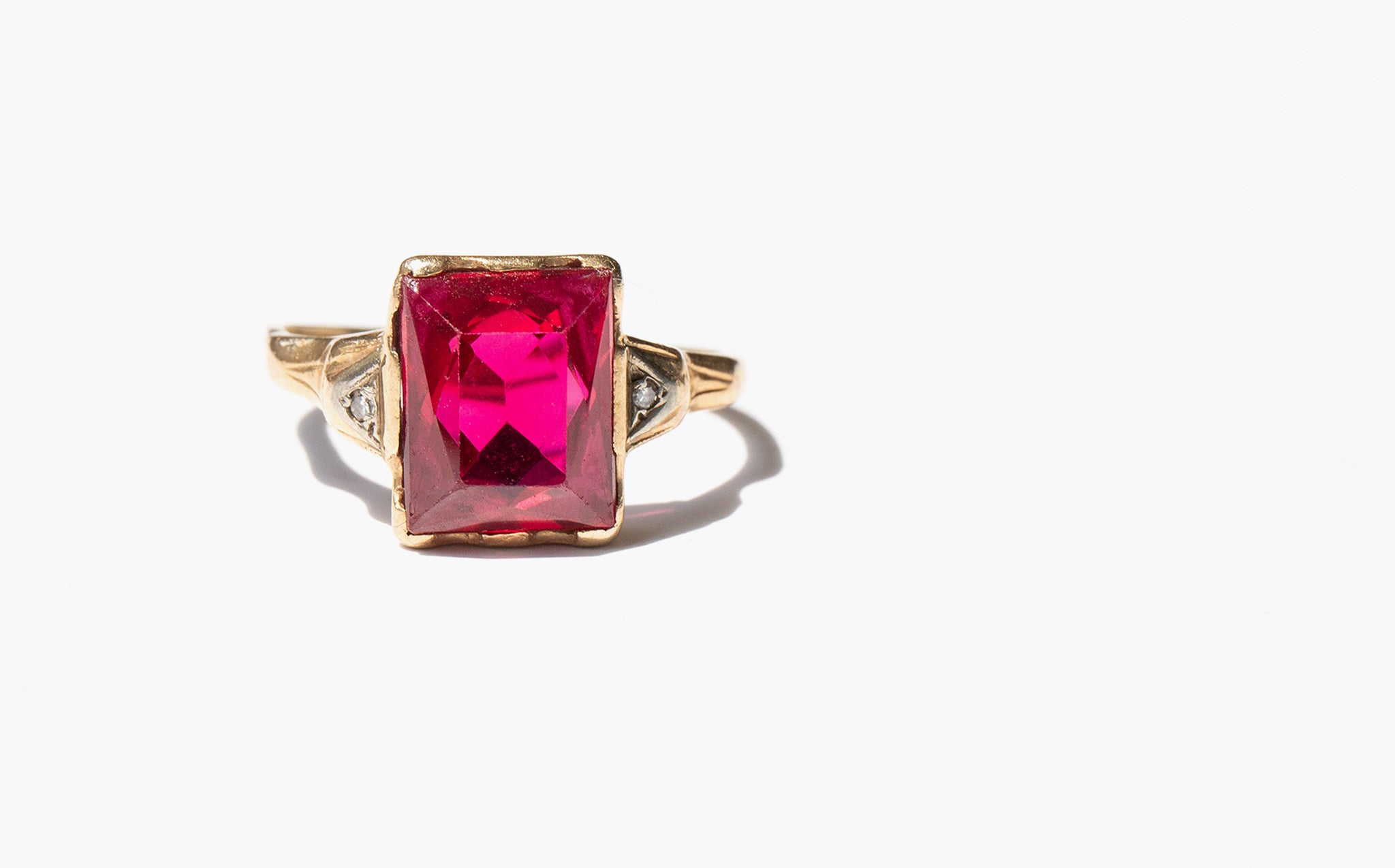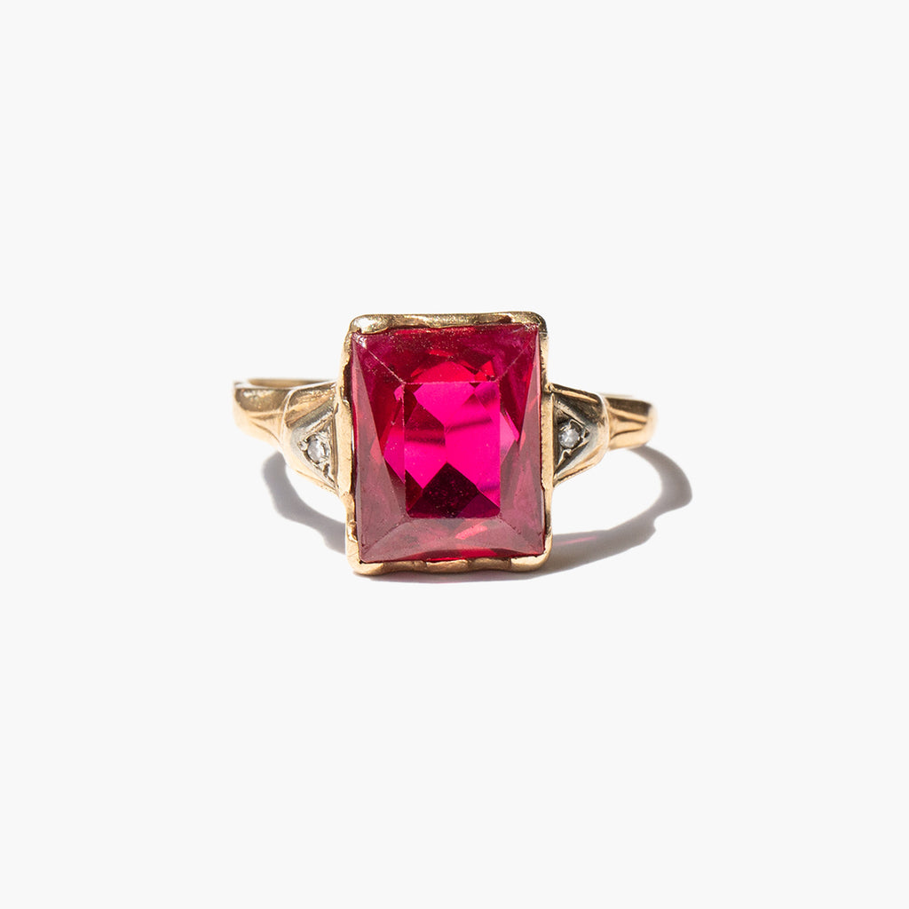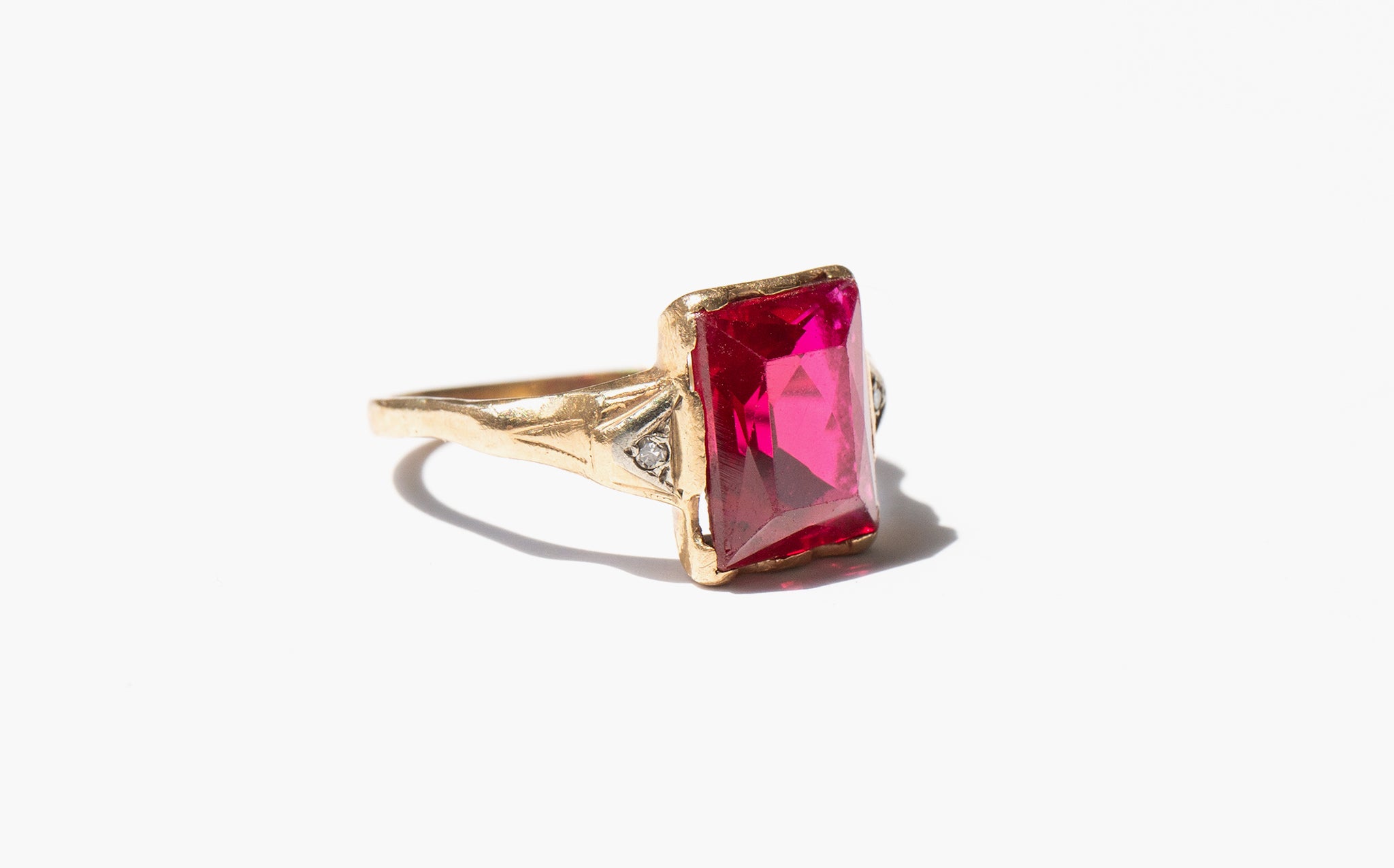 Beautiful blood red glass stone in a refined 14K gold setting.