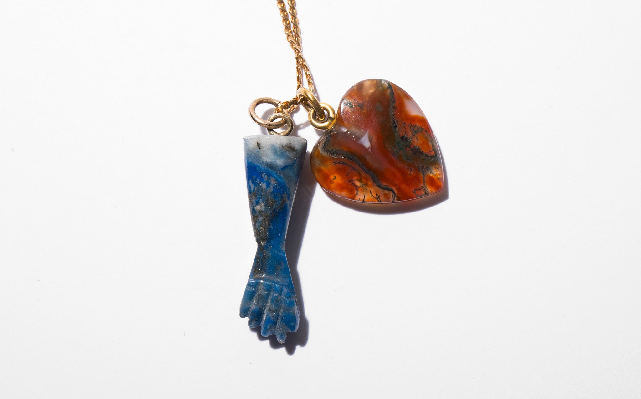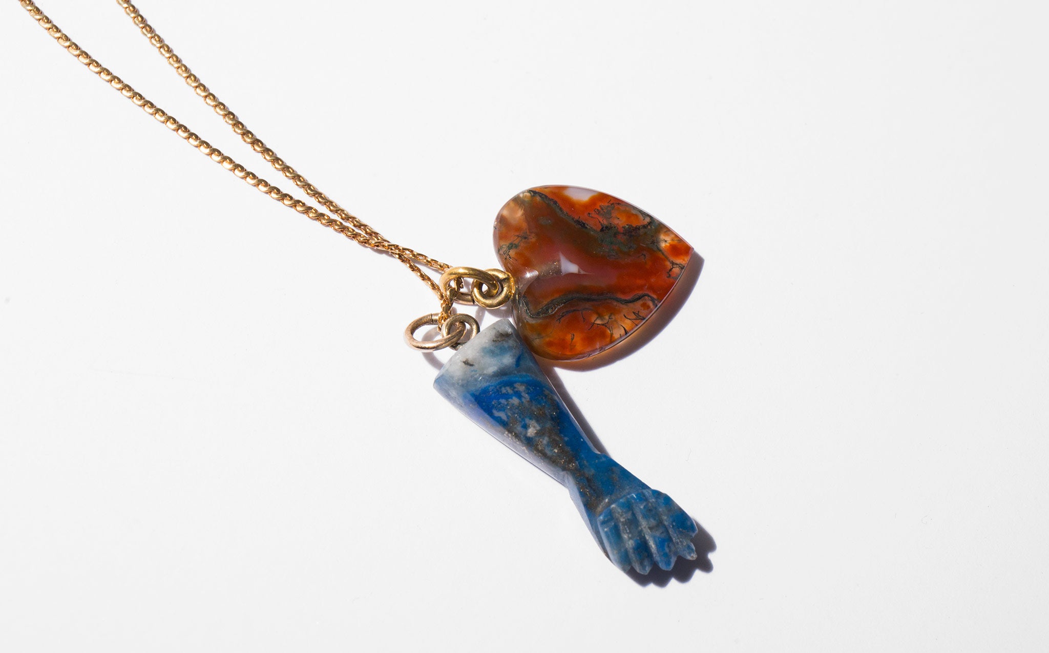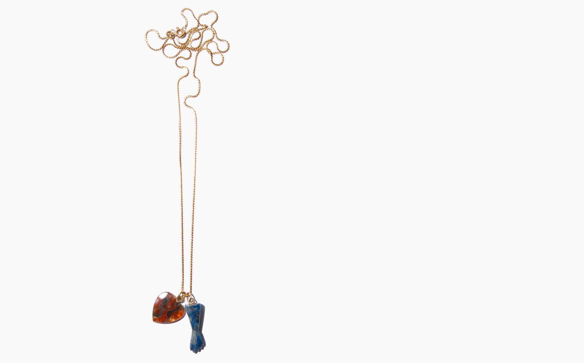 Elegant and long 18k gold chain with a deep blood red agate heart and blue stone figa. Charms symbolic of love and protection – a mano figa is an ancient magically protective talisman to ward off evil curses and bad energy.