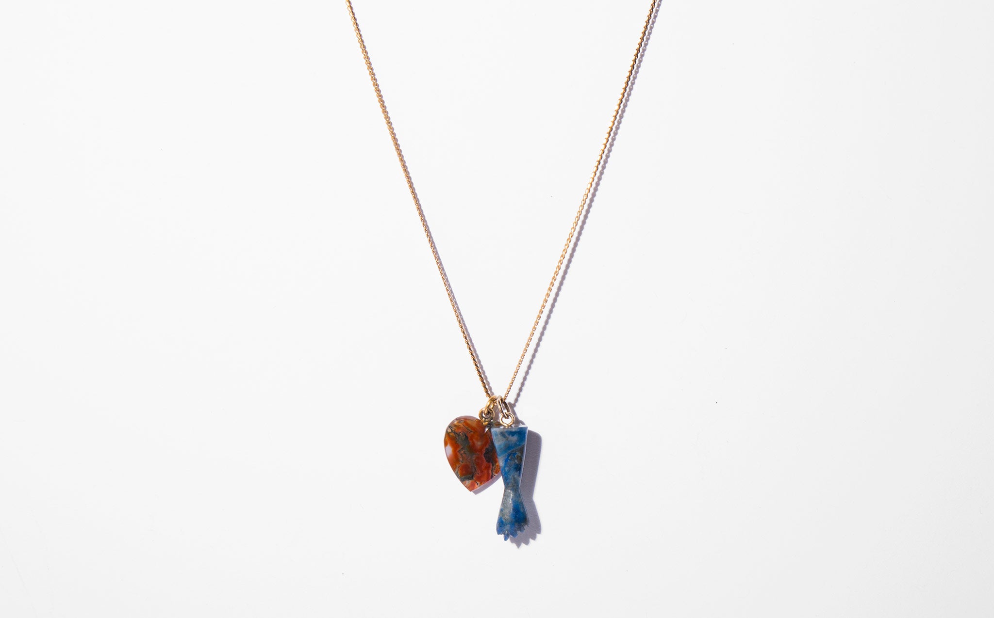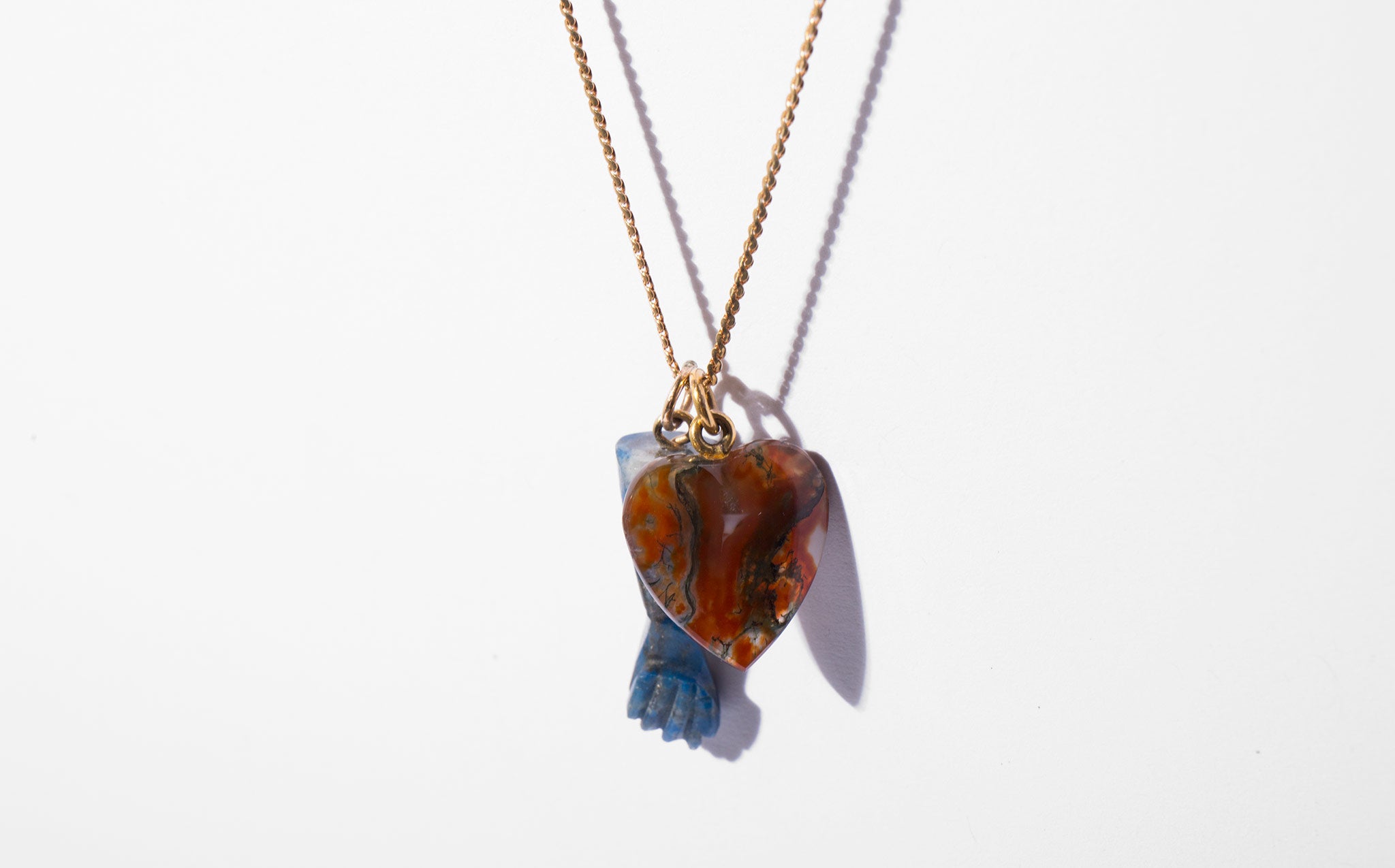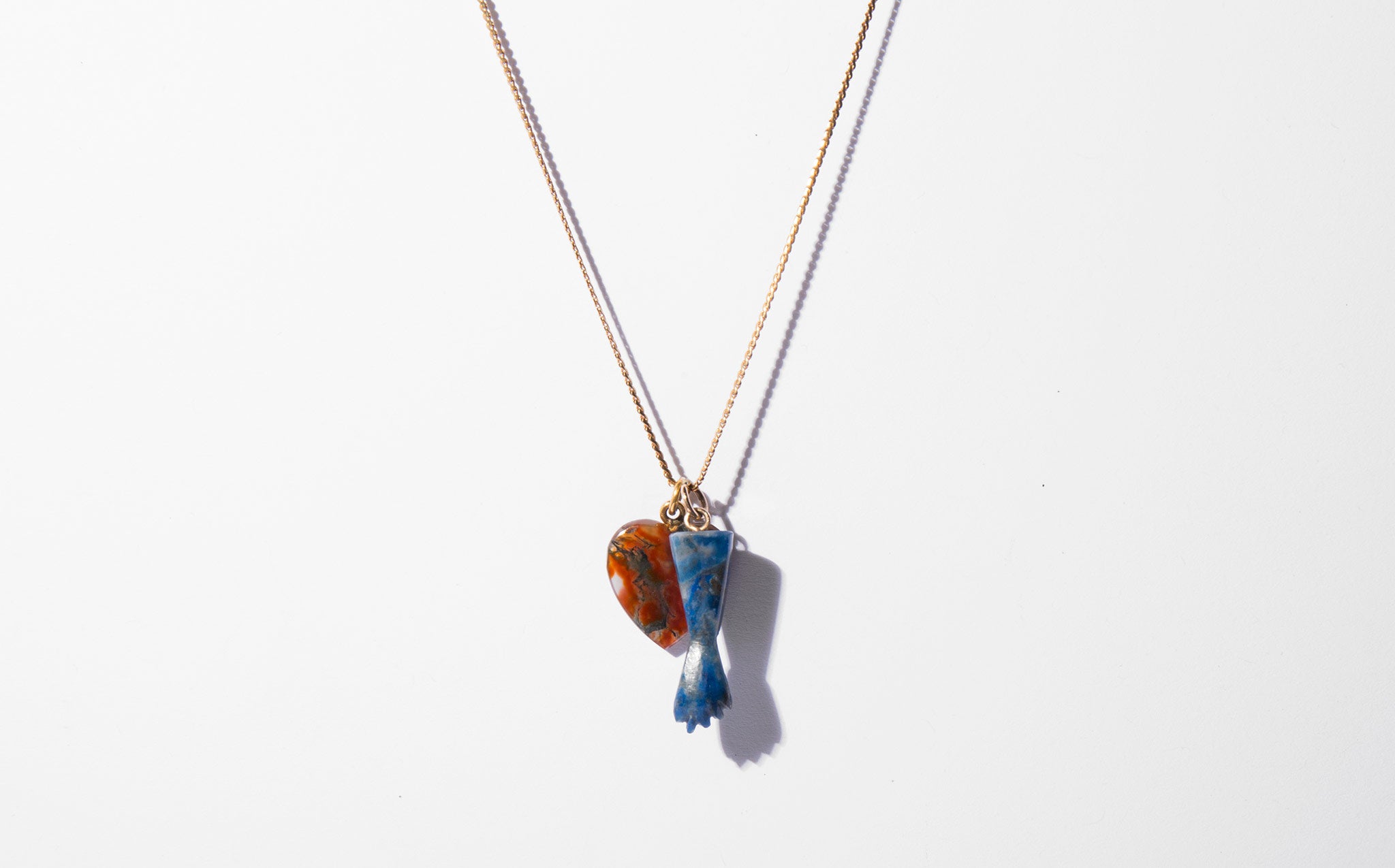 Elegant and long 18k gold chain with a deep blood red agate heart and blue stone figa. Charms symbolic of love and protection – a mano figa is an ancient magically protective talisman to ward off evil curses and bad energy.