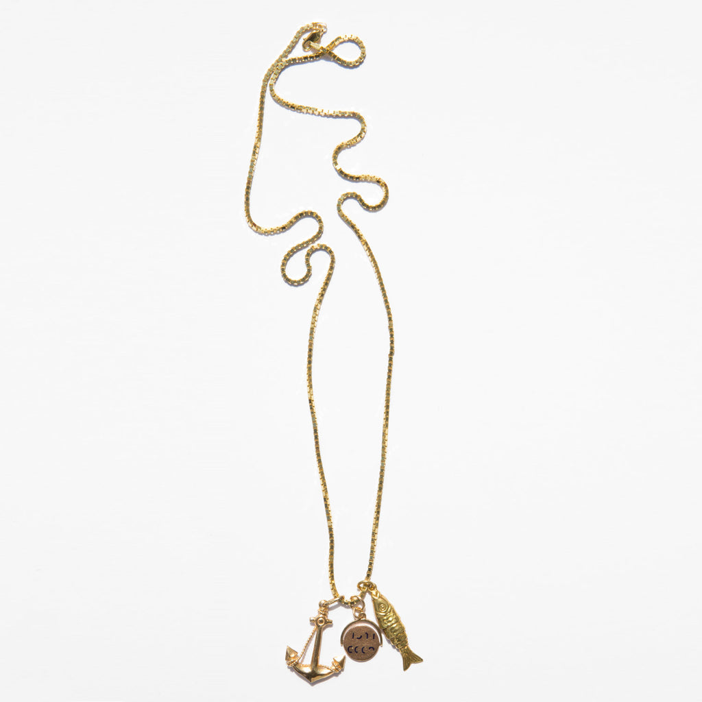 For the irrepressible wanderer, tokens of luck and godspeed. A thick 14k gold box chain with a trio of charms – a vintage 9k gold anchor denoting the high seas and far away places, a vintage 9k spinner charm that says "good luck" when rotating, and an 18k gold fish, Buddhist symbols of happiness and freedom.