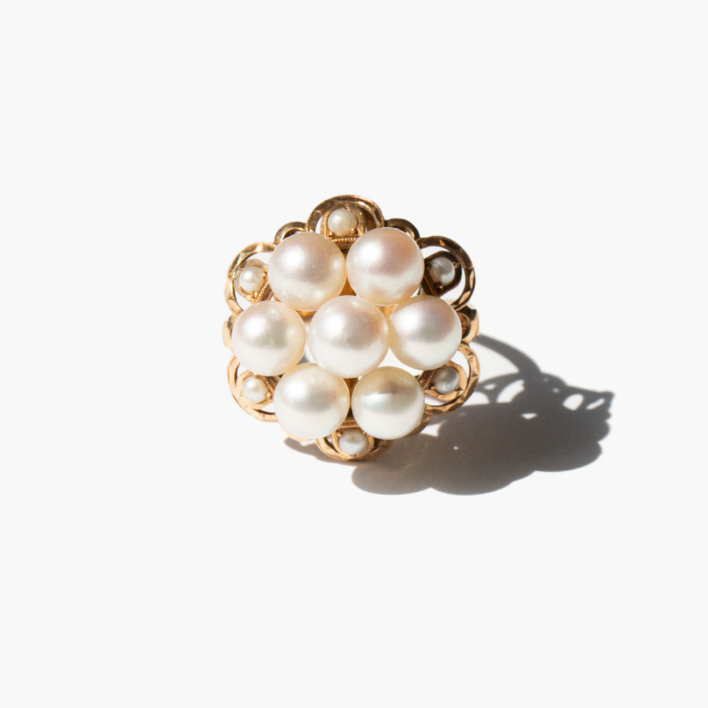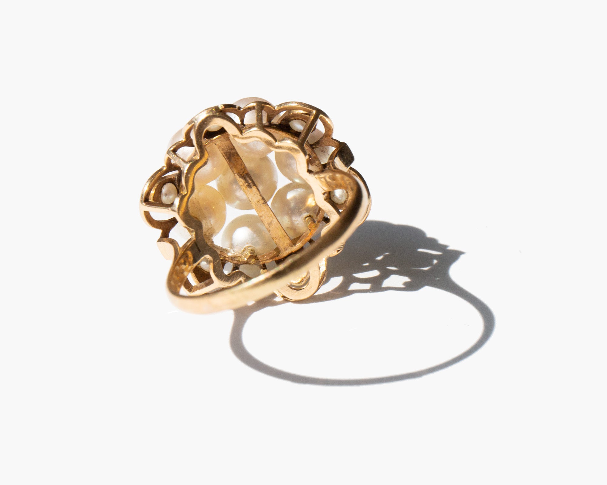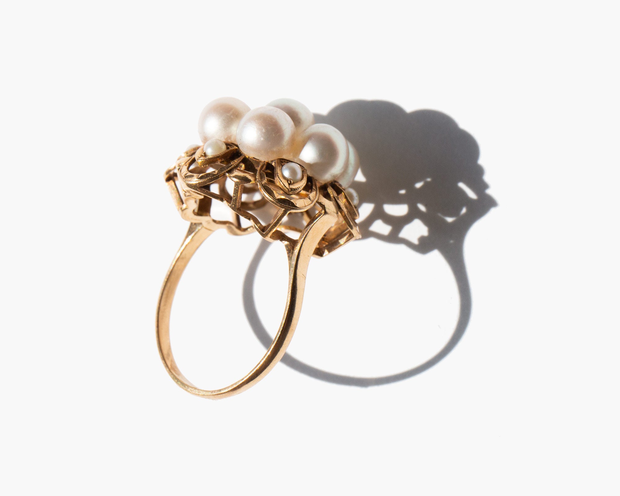 Mid-century cocktail ring with cultured pearls in a floral pattern set in 14k gold.