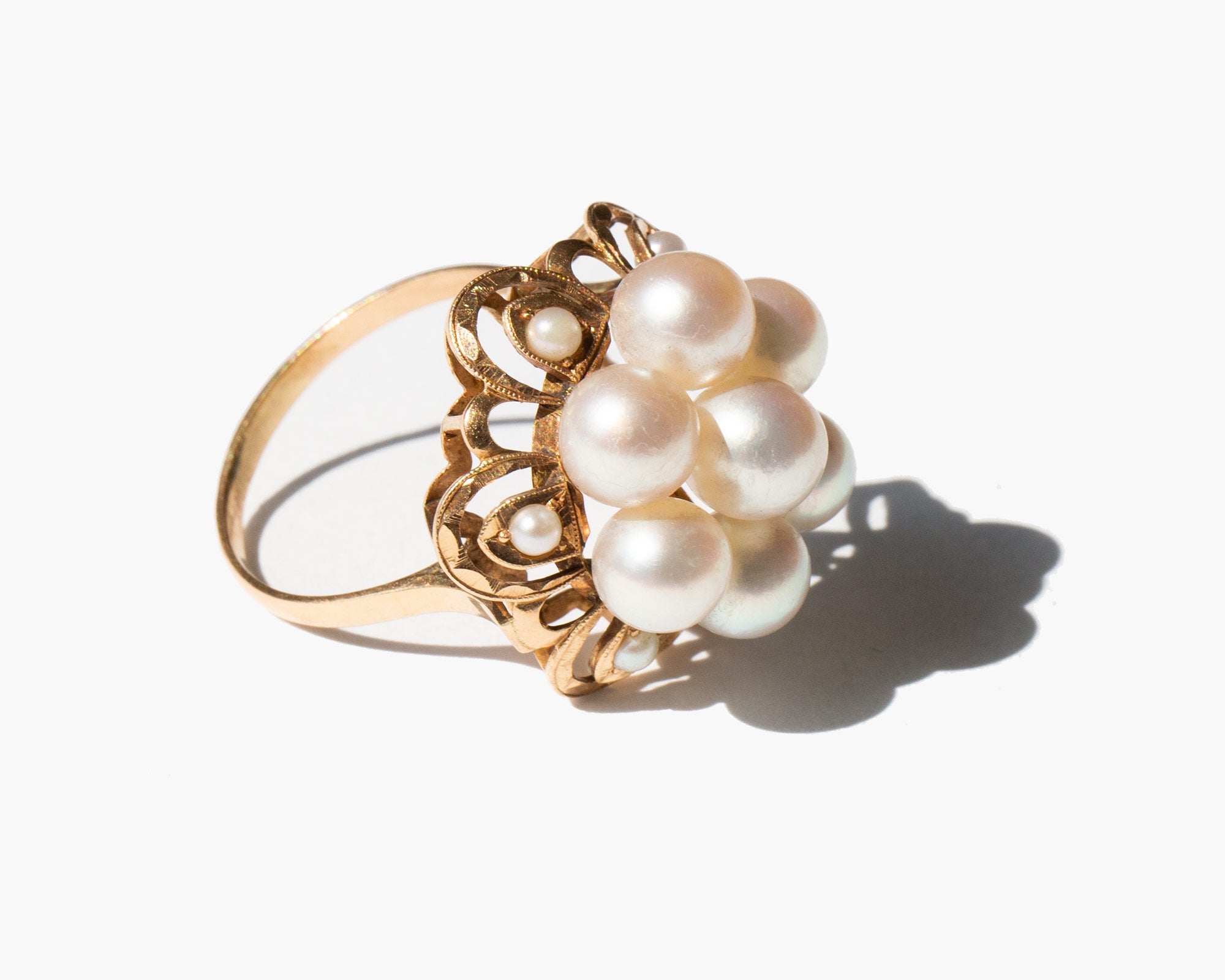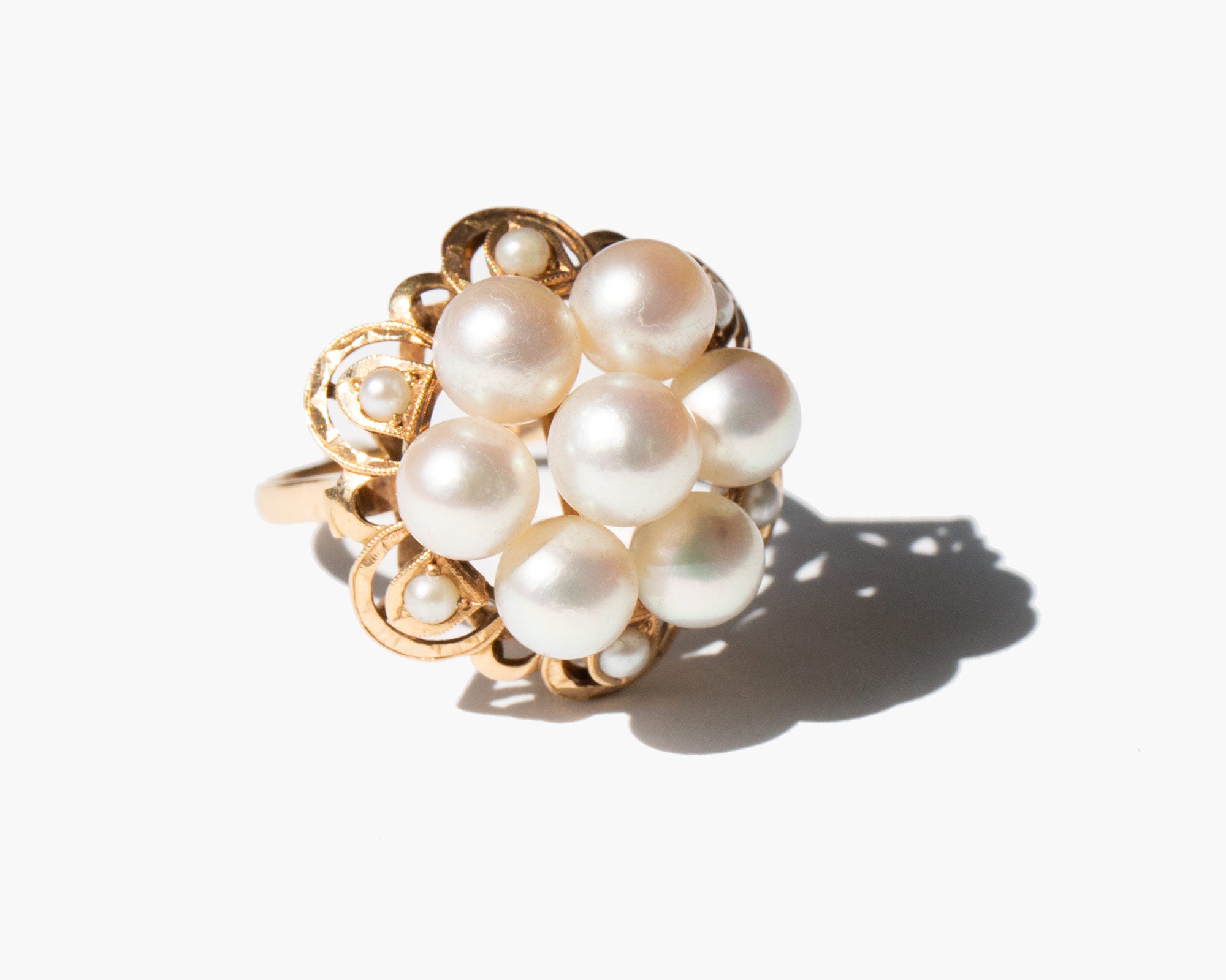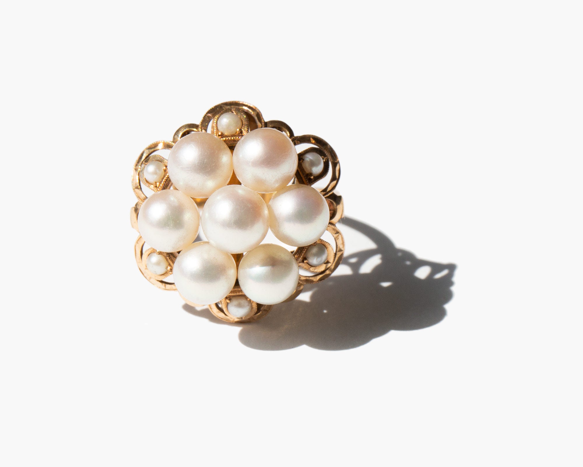 Mid-century cocktail ring with cultured pearls in a floral pattern set in 14k gold.