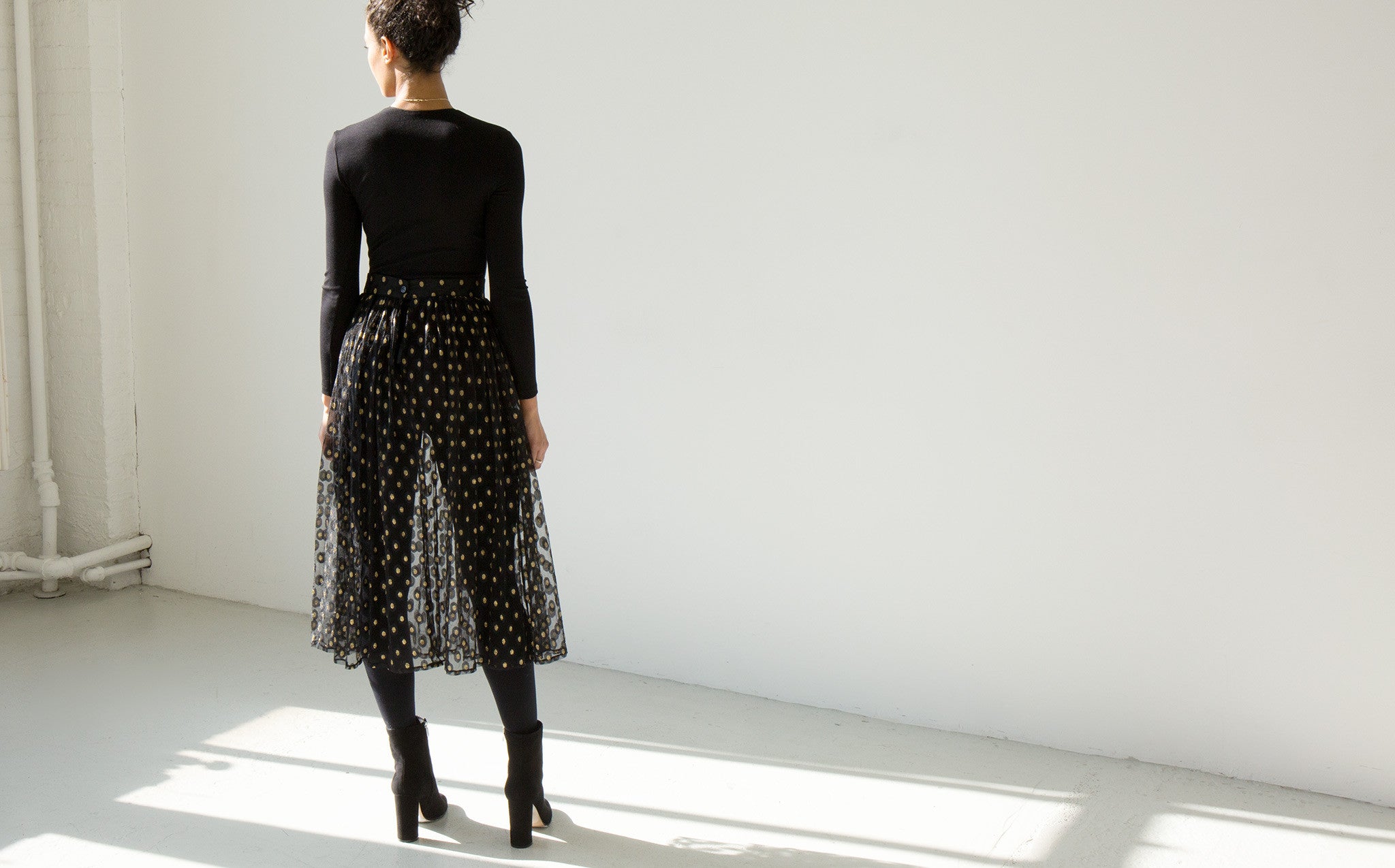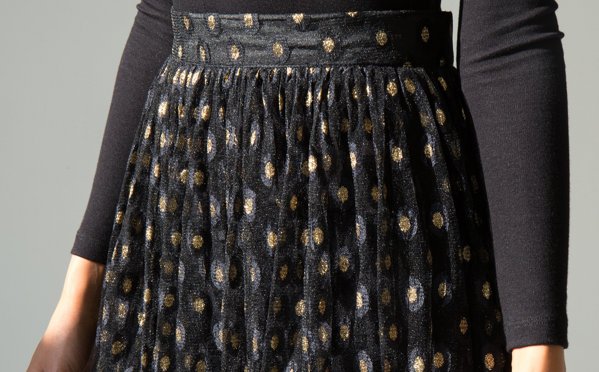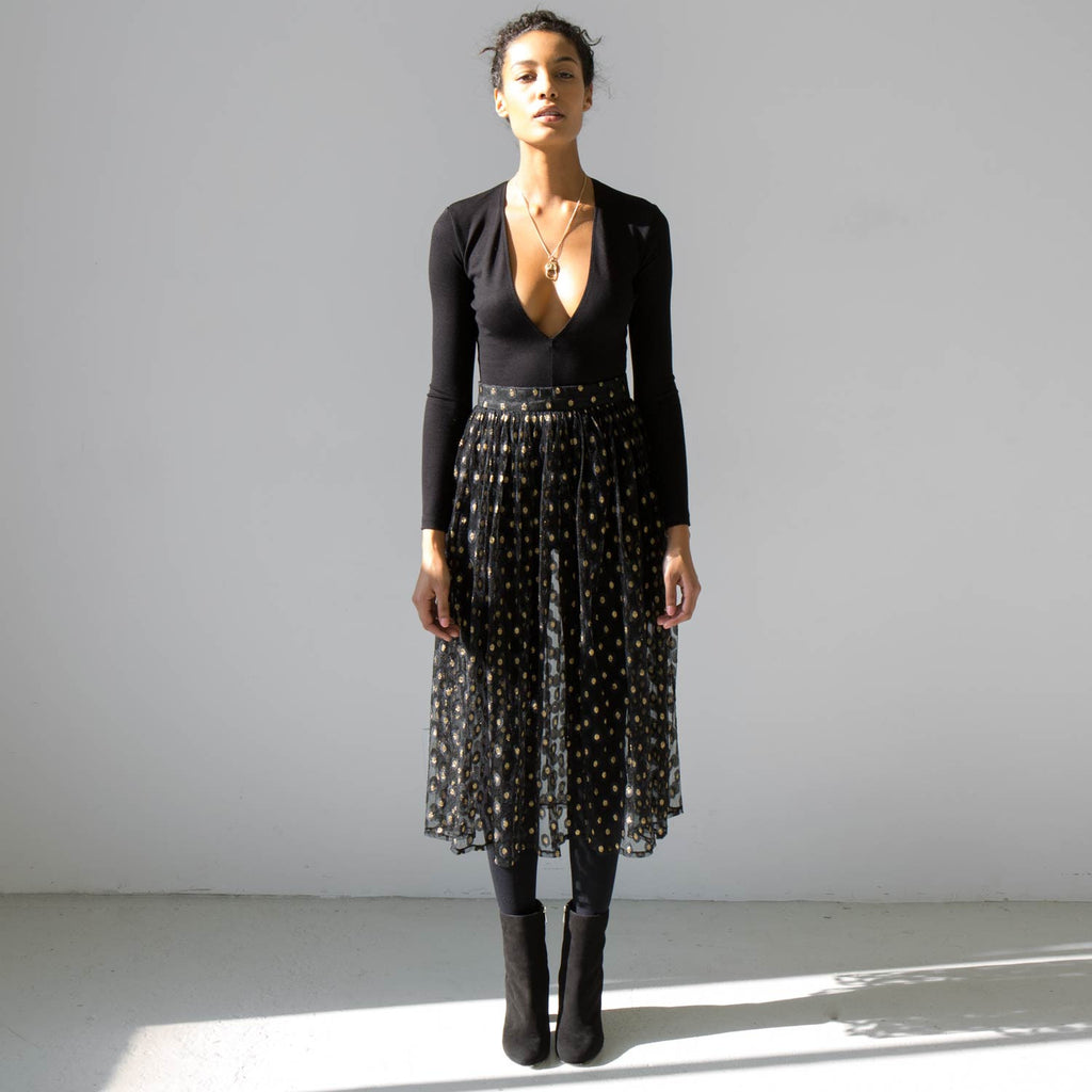 Long and voluminous sheer tulle skirt with gold embroidered accents.