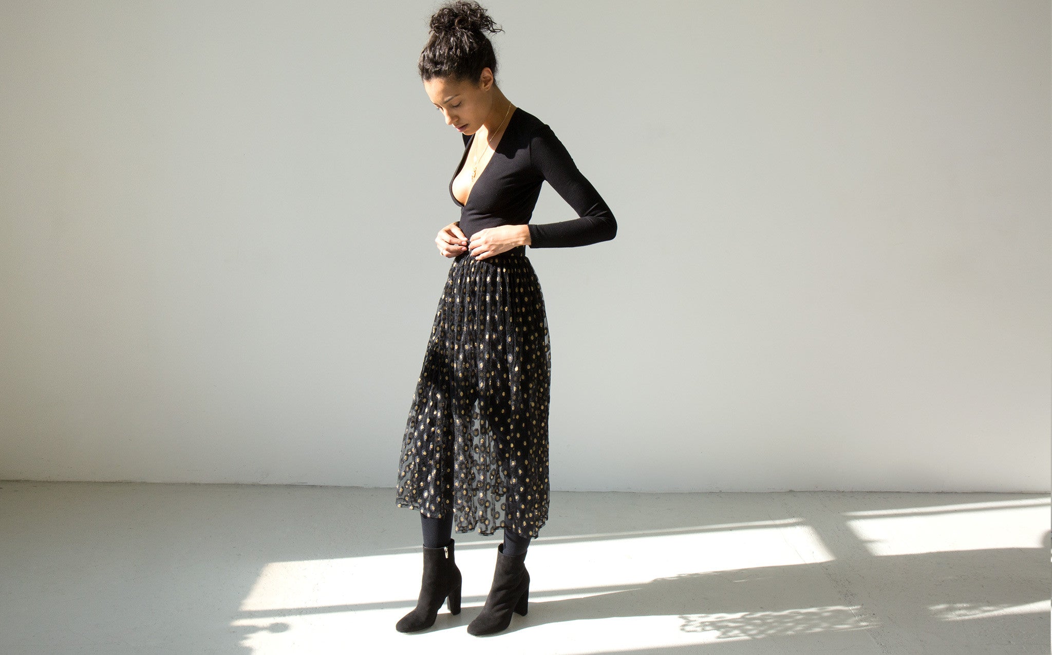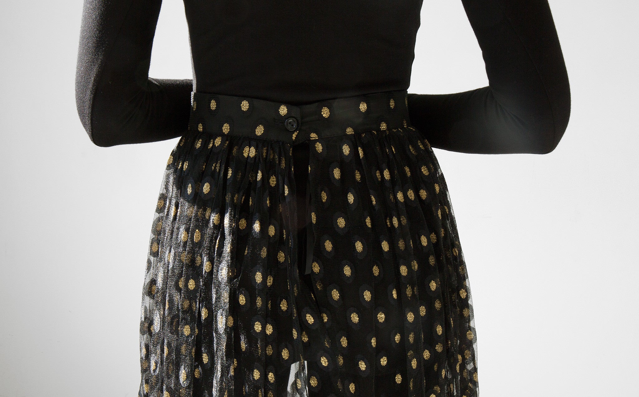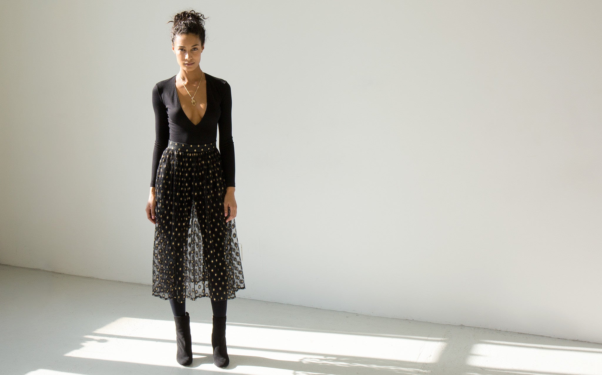 Long and voluminous sheer tulle skirt with gold embroidered accents.