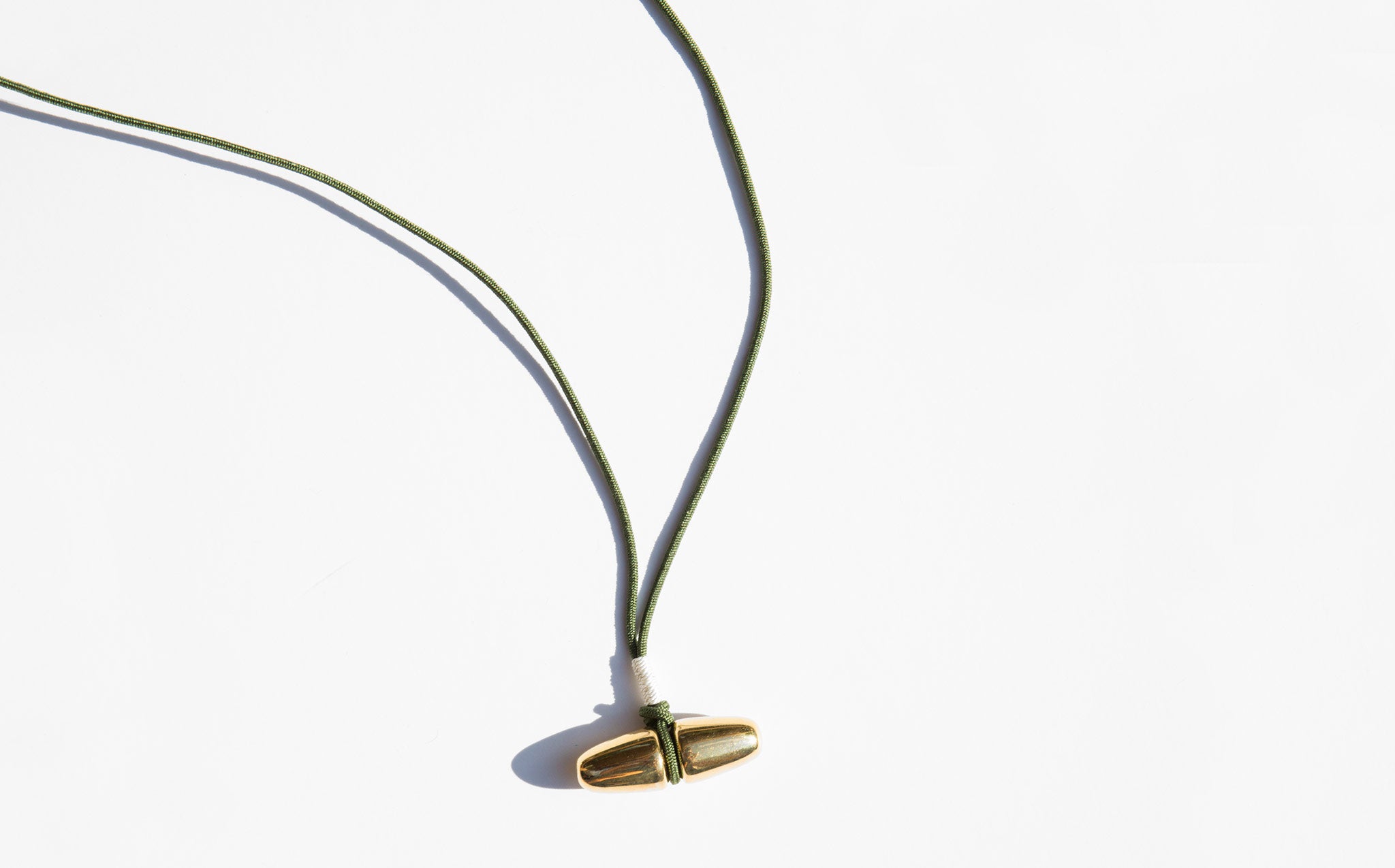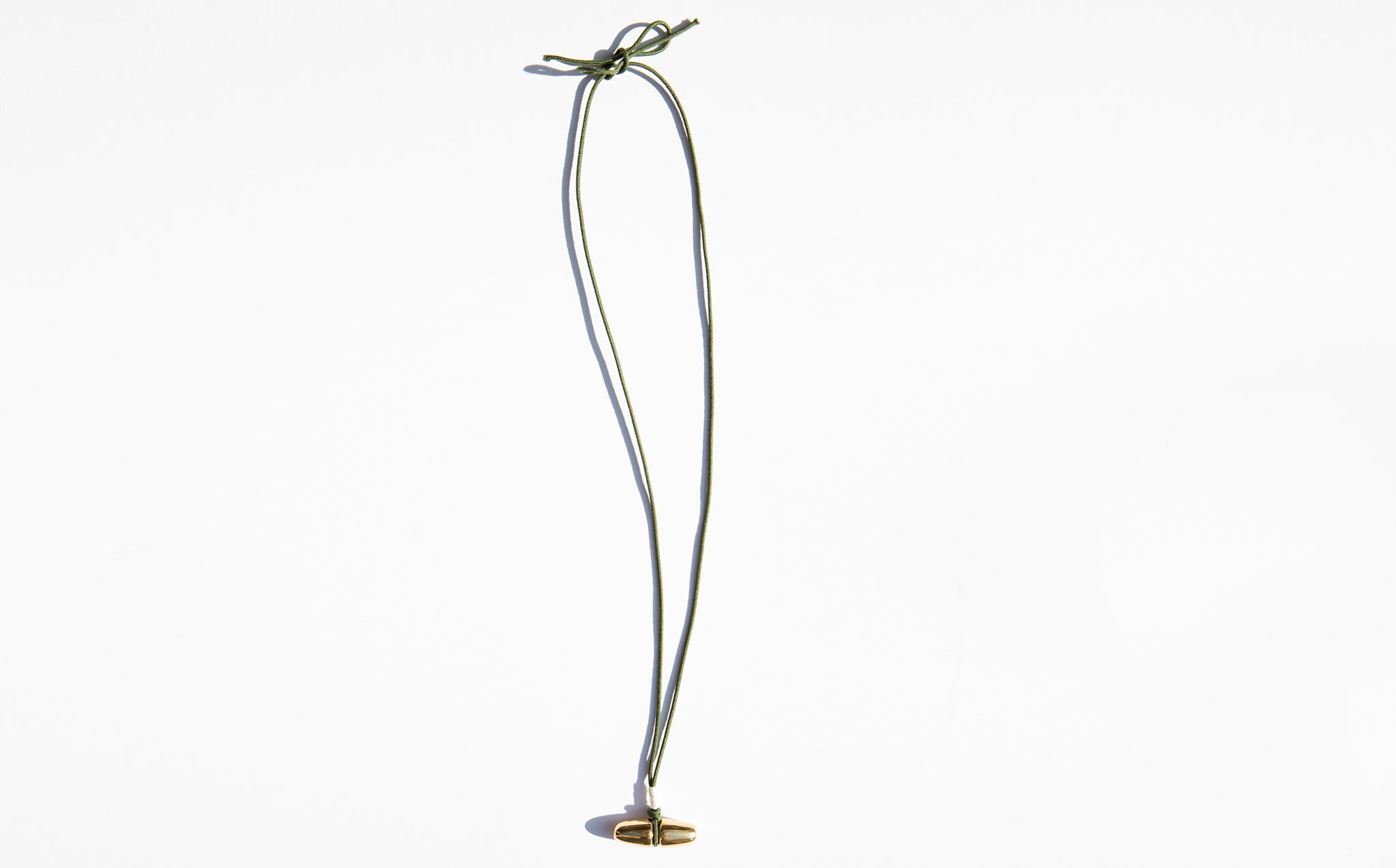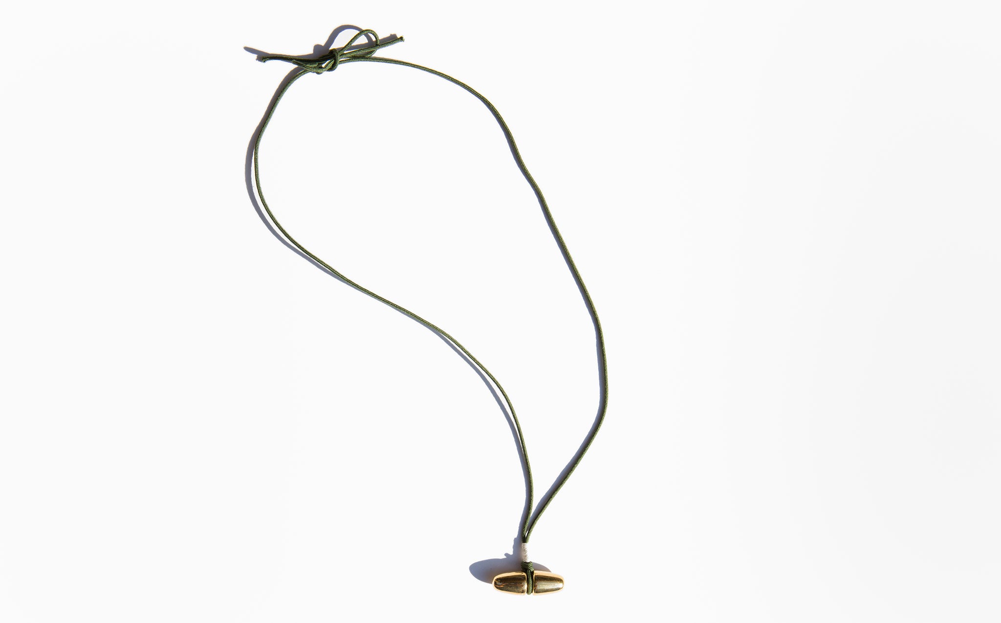 A chic pendant necklace paying homage to the Japanese hand blown glass fishing buoys that wash up on the shore of the Pacific Northwest coast. Pendant is luxuriously plated in gold and finished off with the help of Maine jeweler, Cat Bates, known for his sophisticated cord work. The Japanese silk/nylon cord is open ended and can be adjusted and tied to any length.