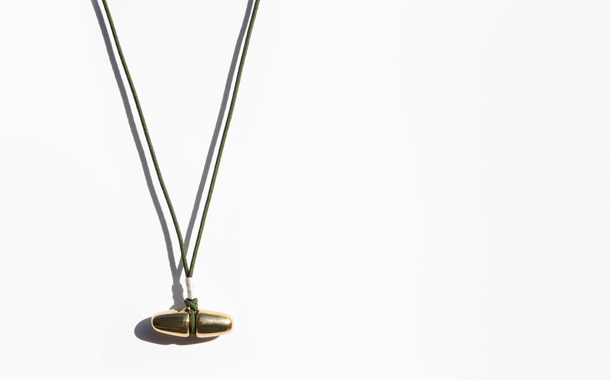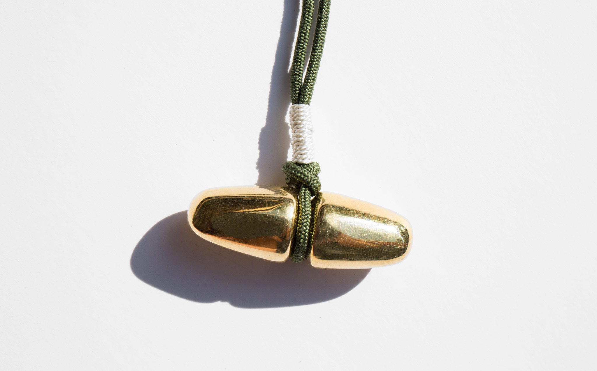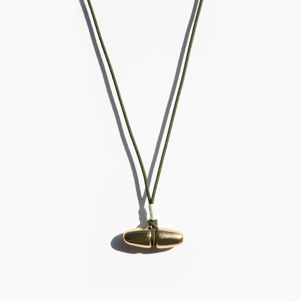 A chic pendant necklace paying homage to the Japanese hand blown glass fishing buoys that wash up on the shore of the Pacific Northwest coast. Pendant is luxuriously plated in gold and finished off with the help of Maine jeweler, Cat Bates, known for his sophisticated cord work. The Japanese silk/nylon cord is open ended and can be adjusted and tied to any length.