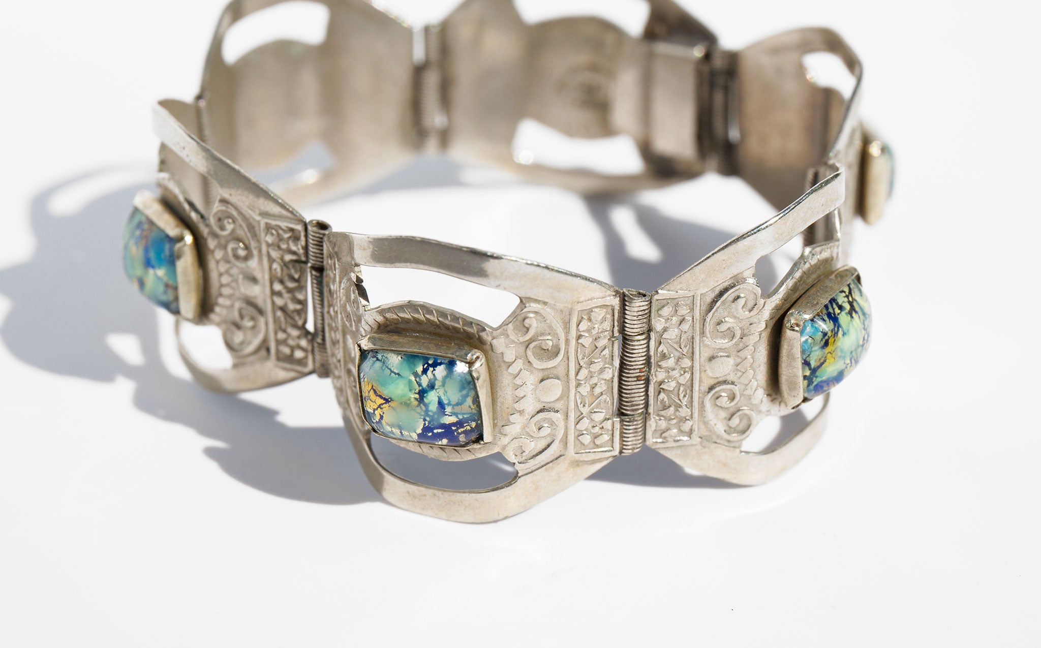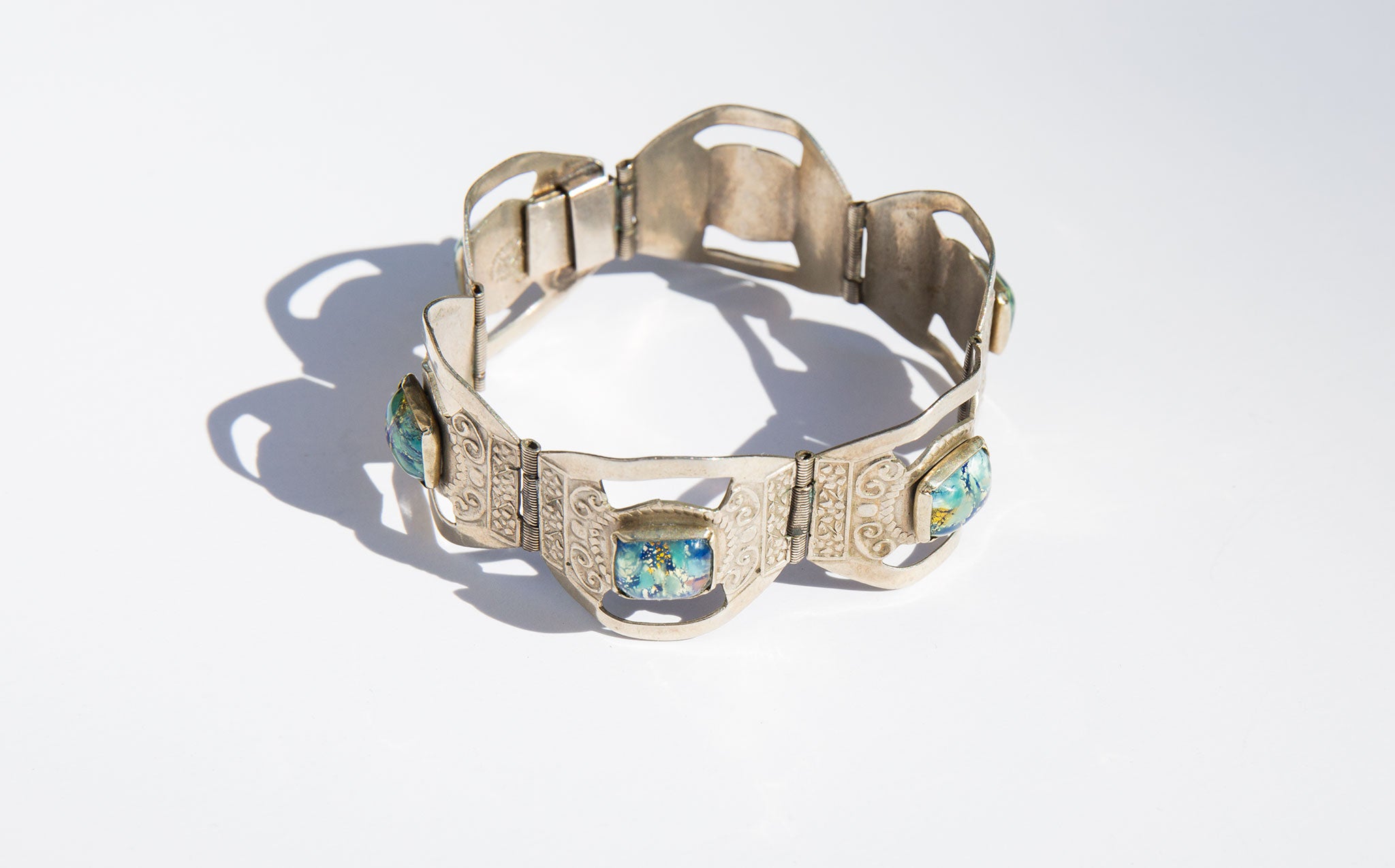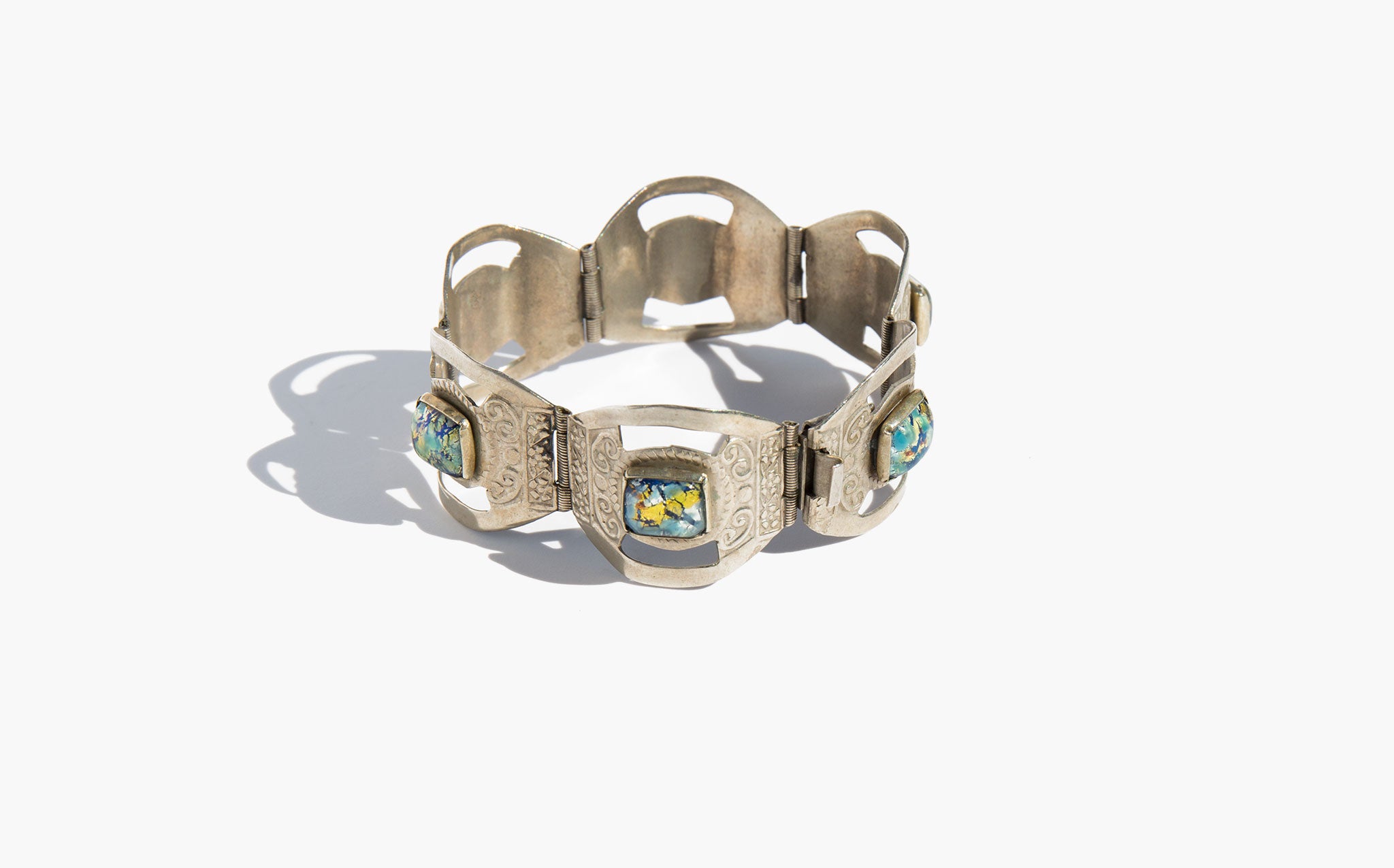 Vintage Mexican sterling silver articulated bracelet with handmade colored glass accents.