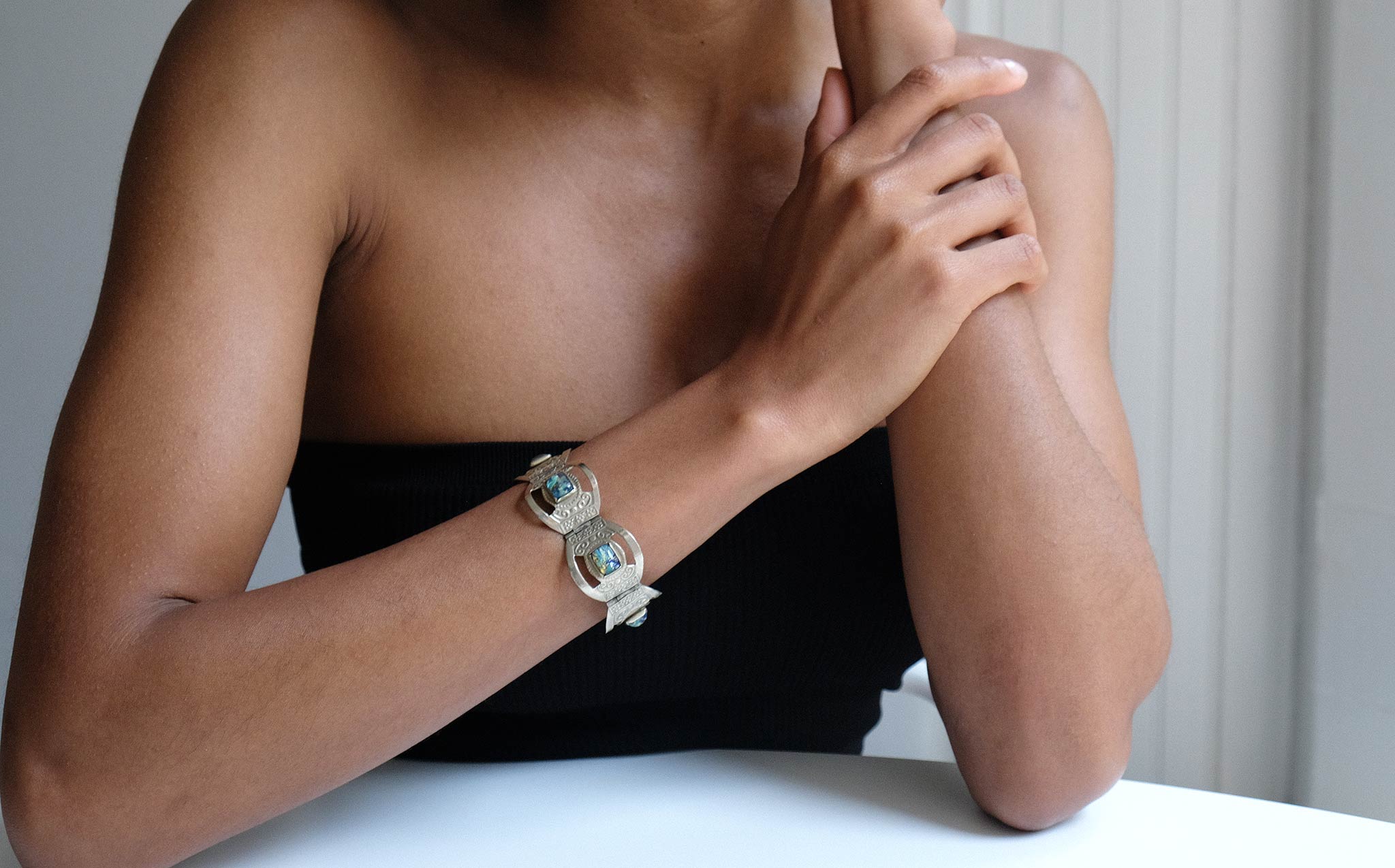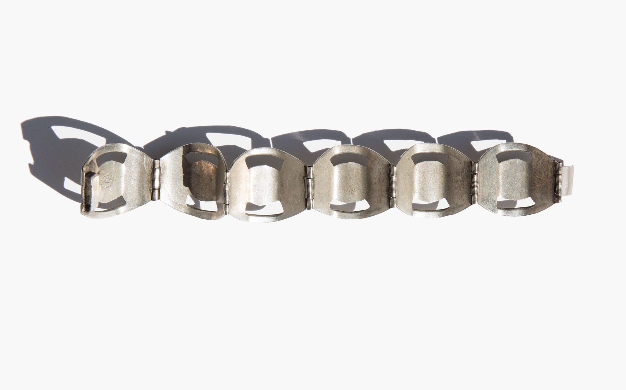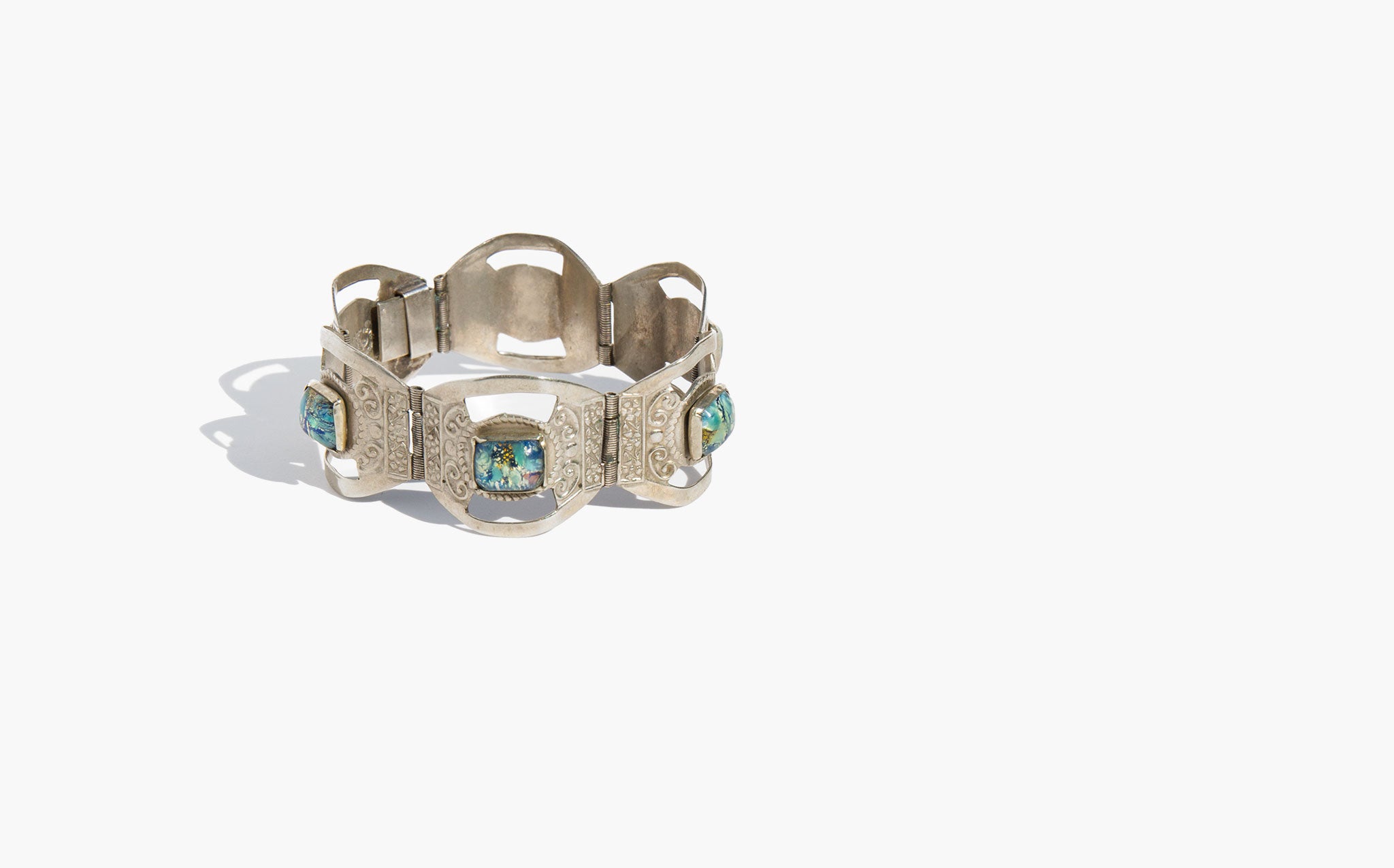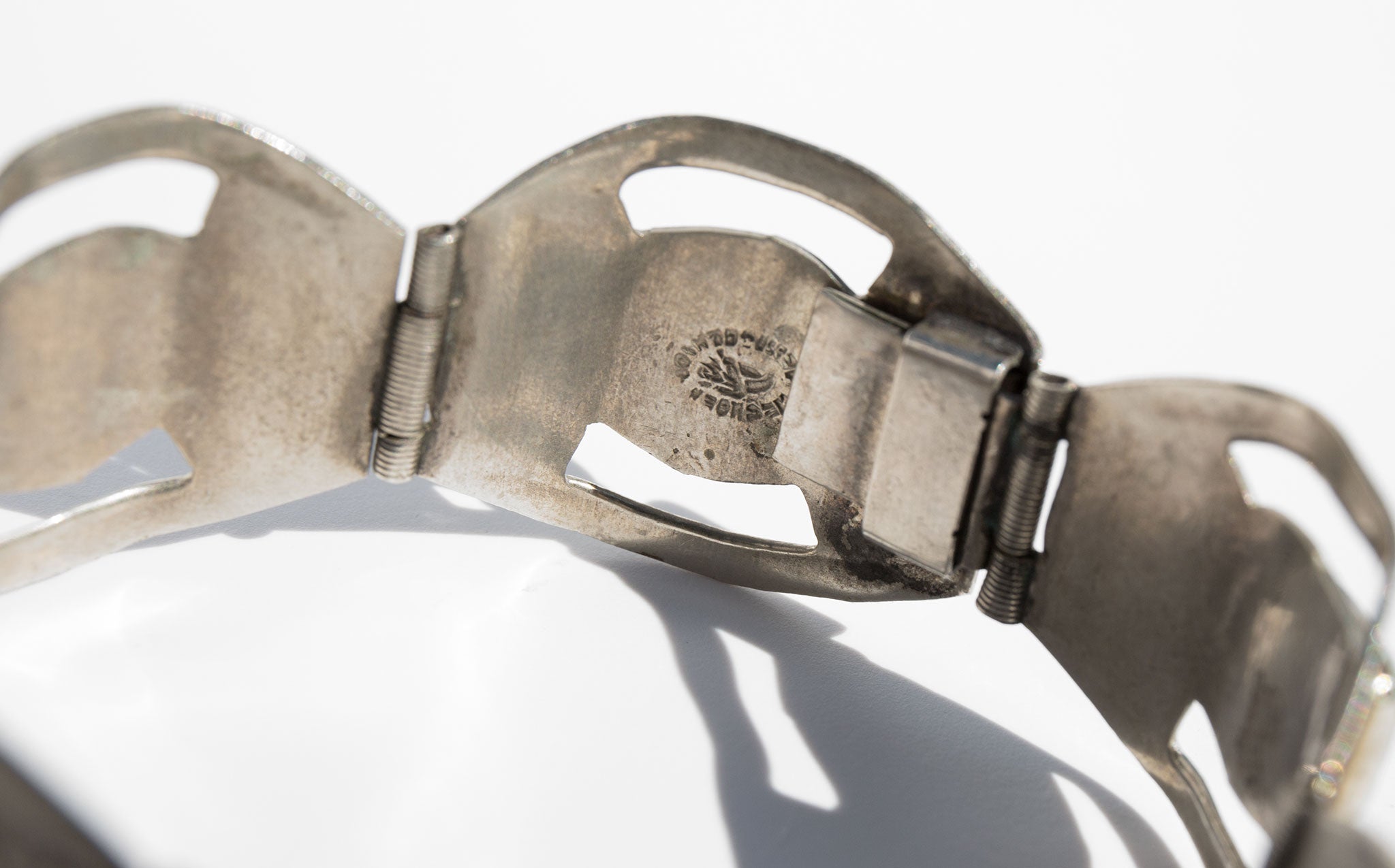 Vintage Mexican sterling silver articulated bracelet with handmade colored glass accents.