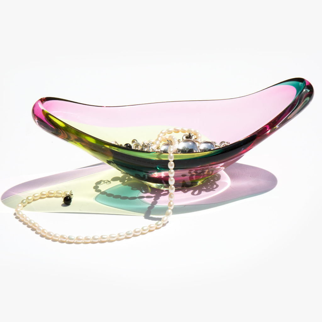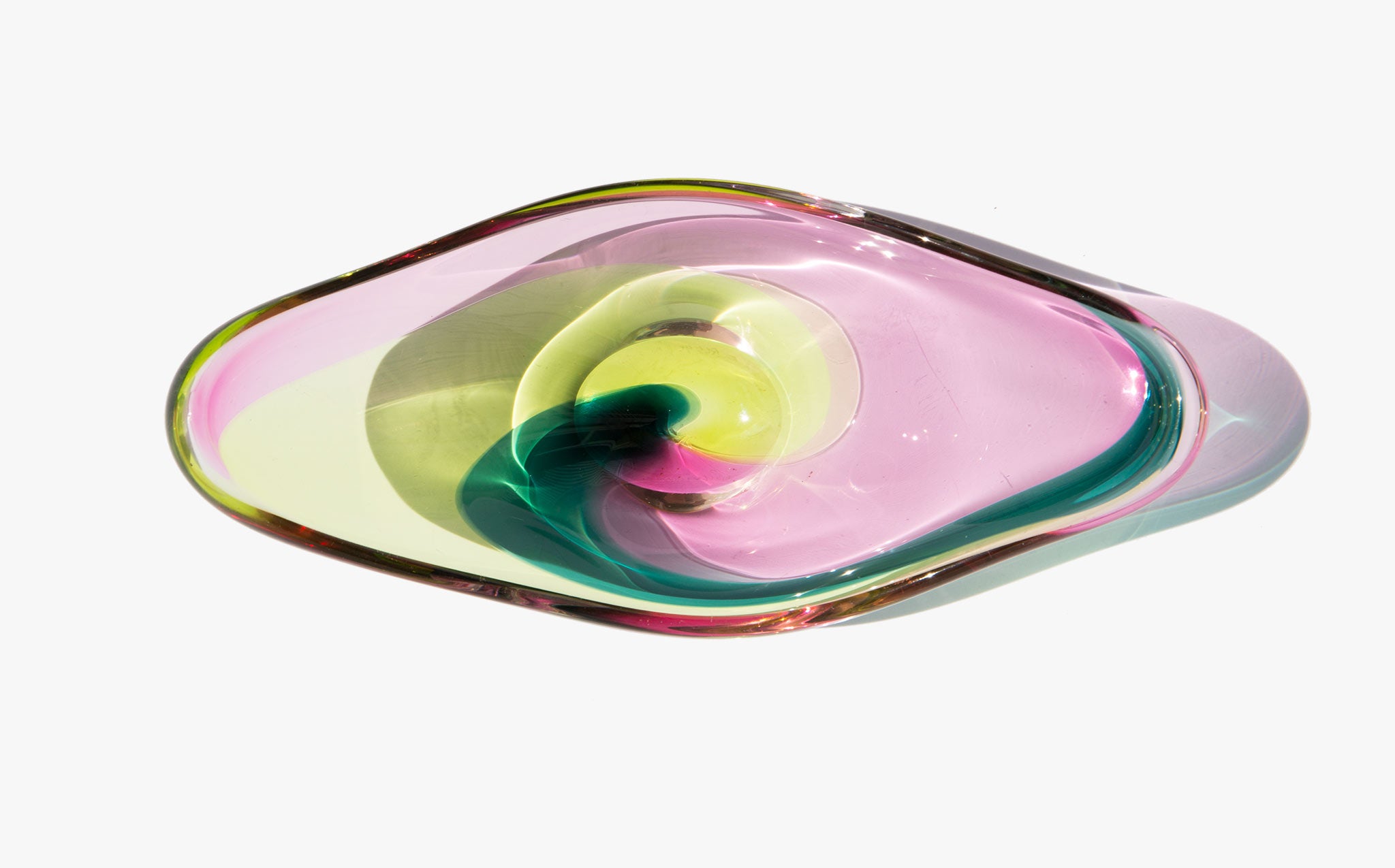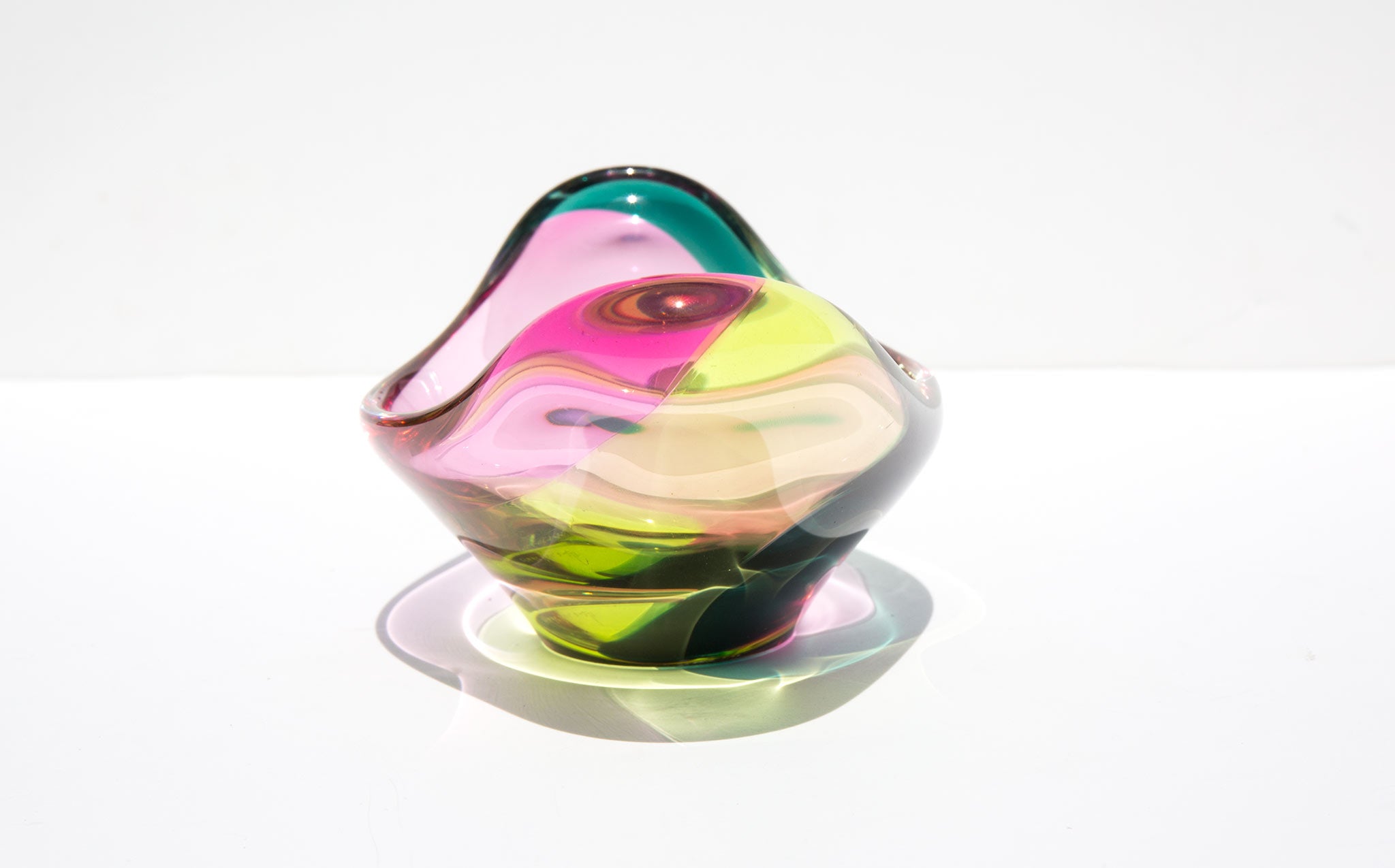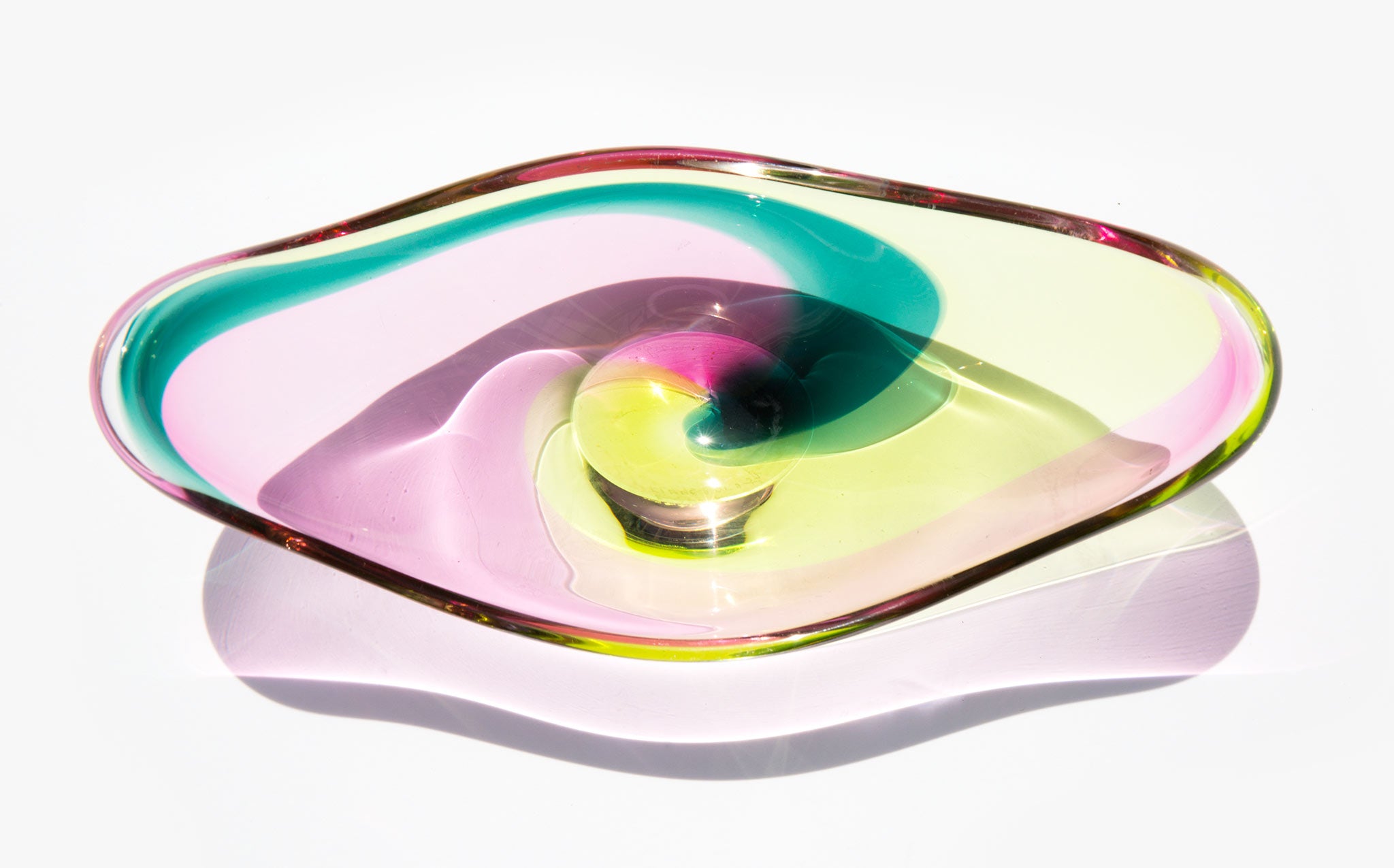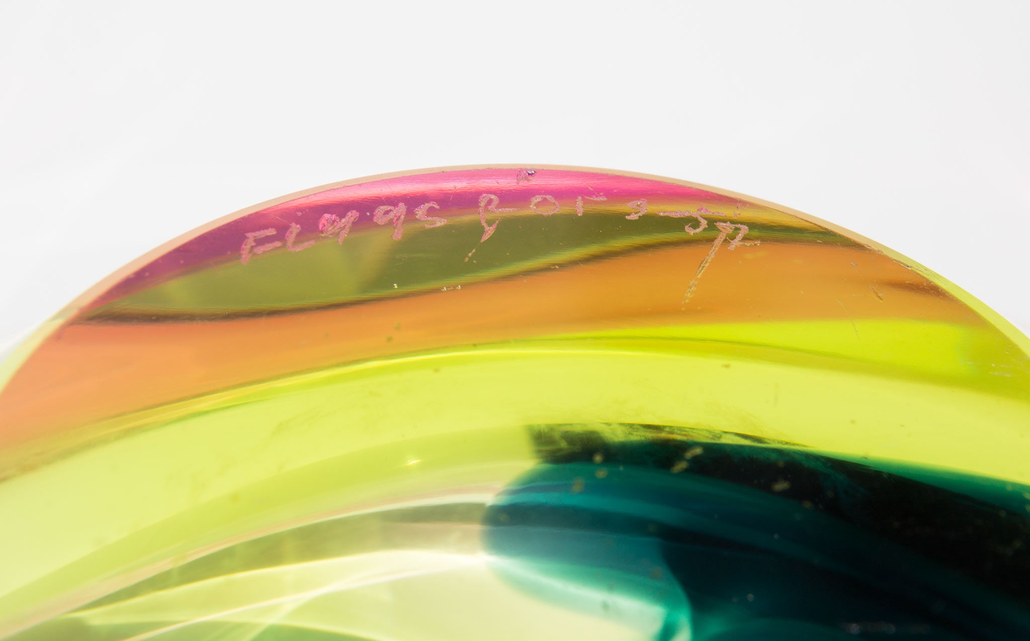 Signed glass trinket or ring dish in ethereal, translucent swirls of candy colors.