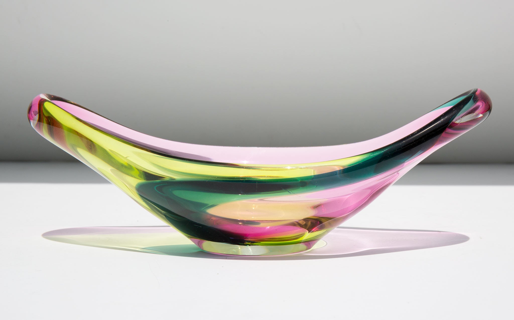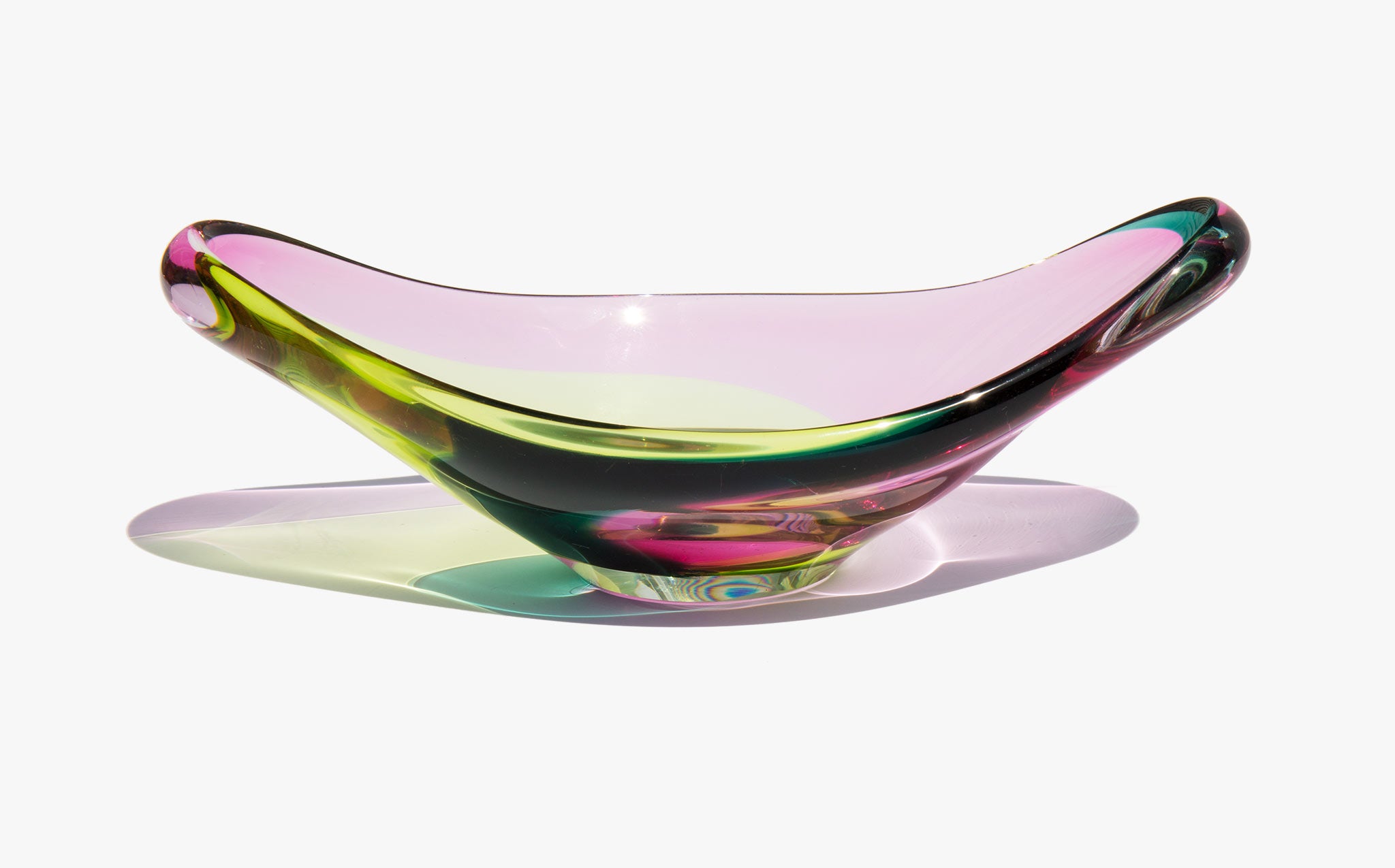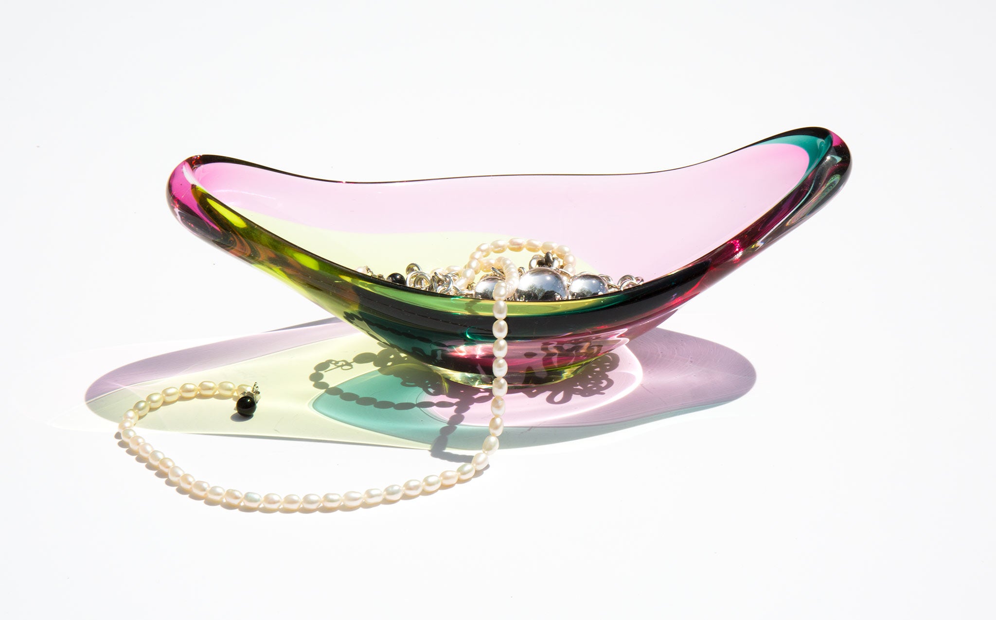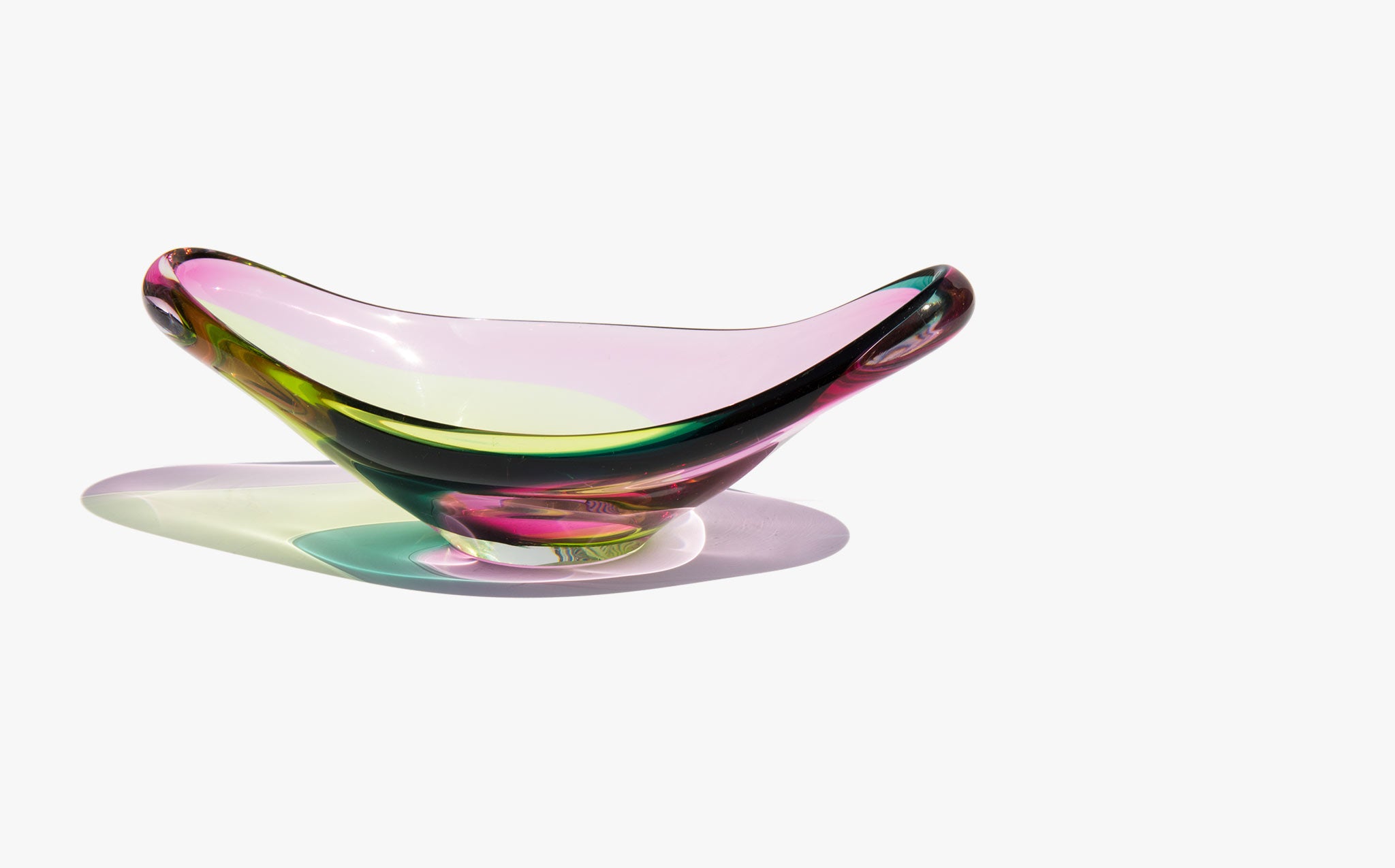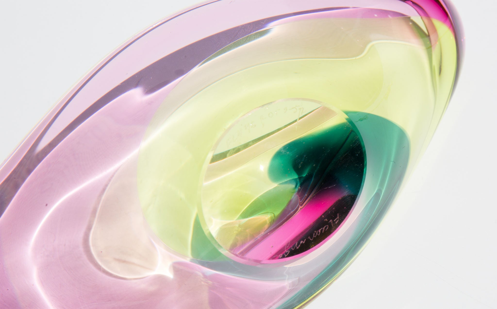 Signed glass trinket or ring dish in ethereal, translucent swirls of candy colors.