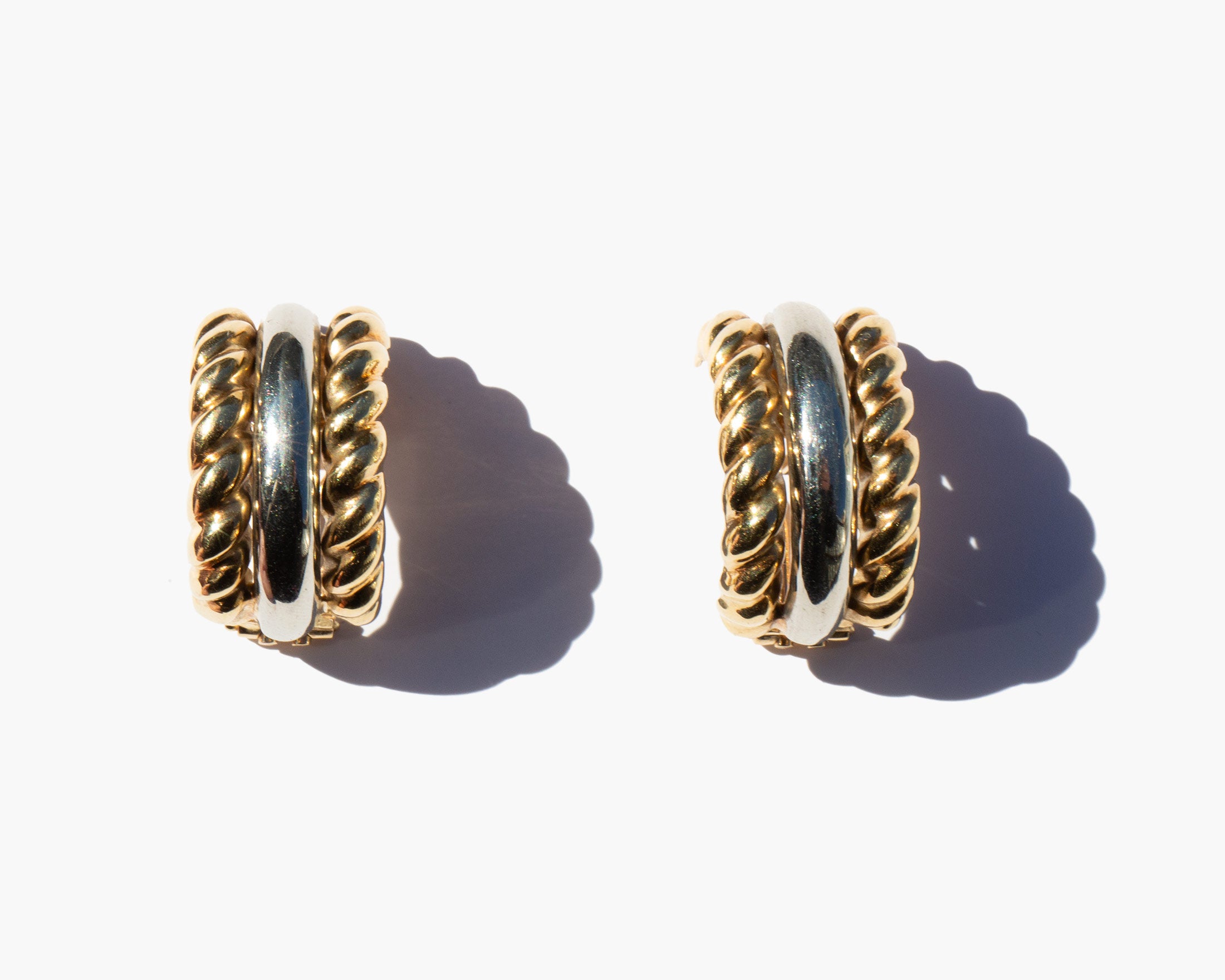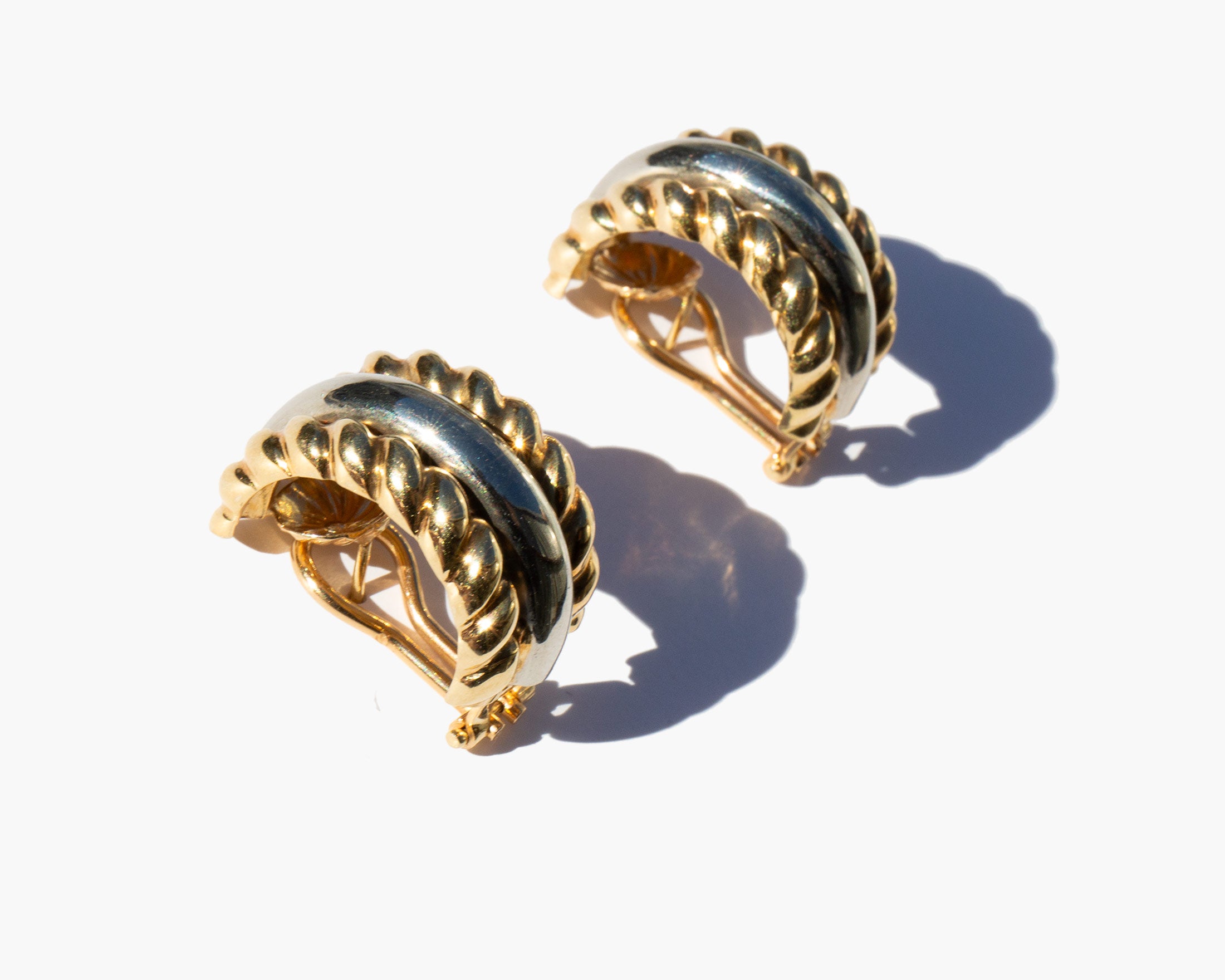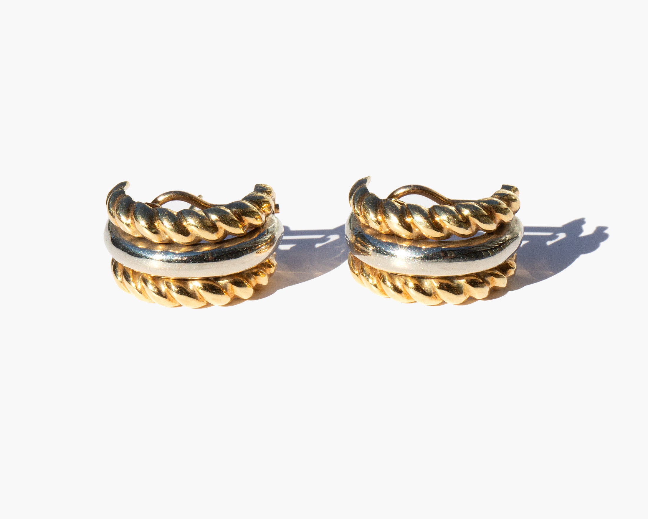 Ornate 14k white and yellow gold hoop earrings, made in Italy.