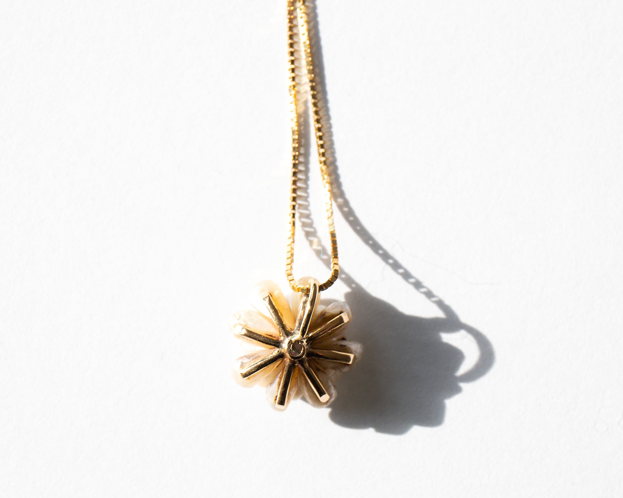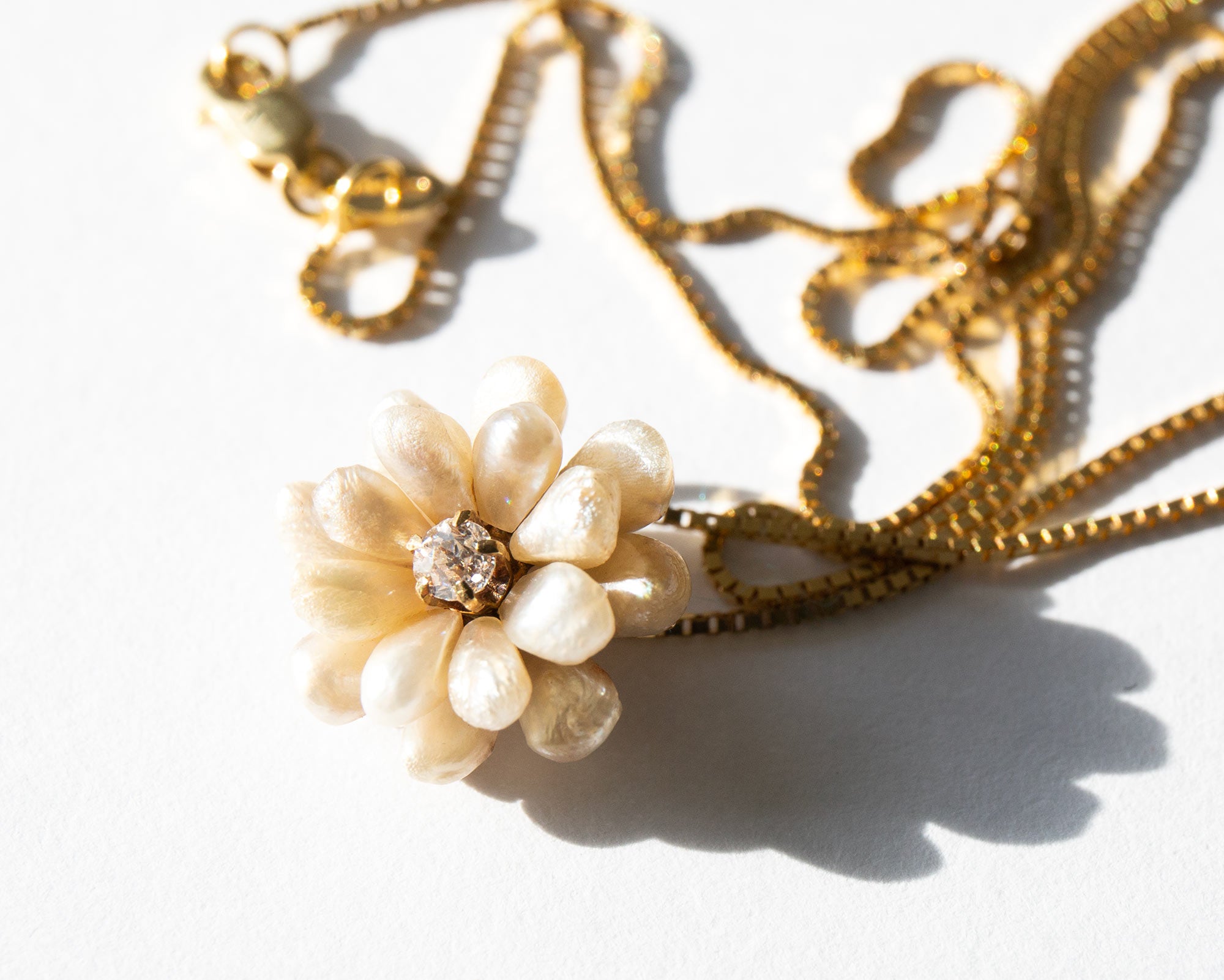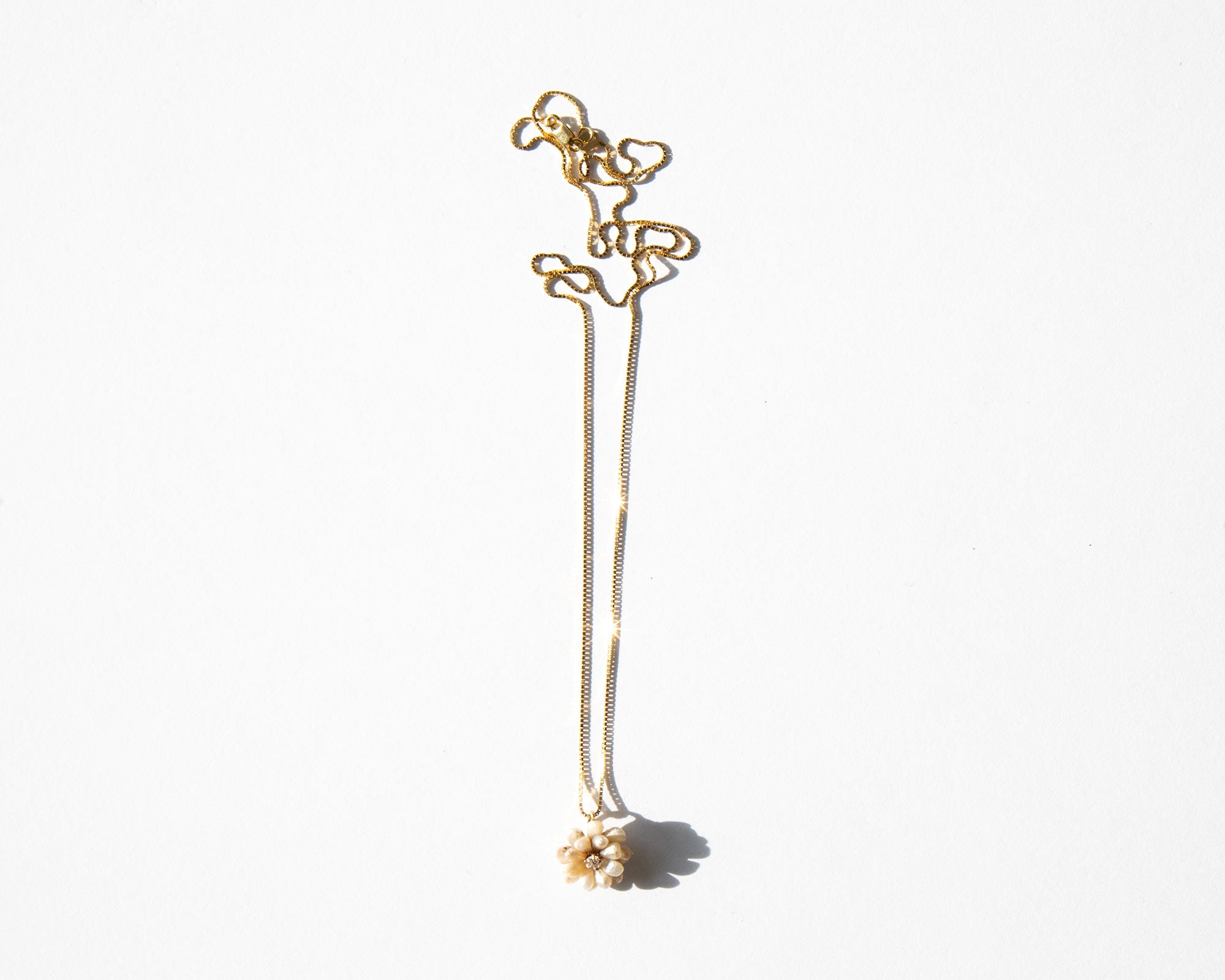 Elegant antique pearl flower pendant with a diamond center on a 14k gold chain.