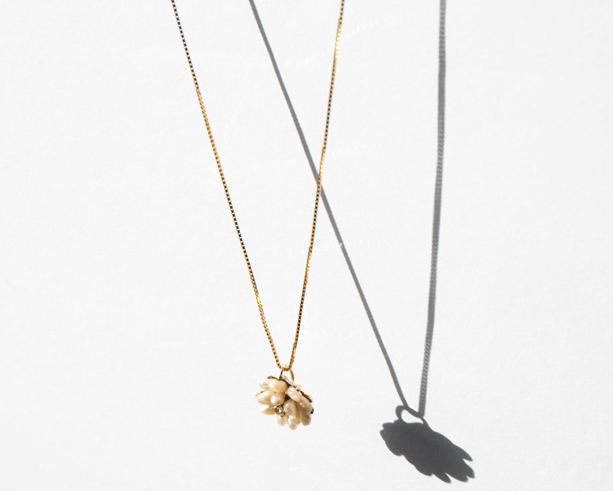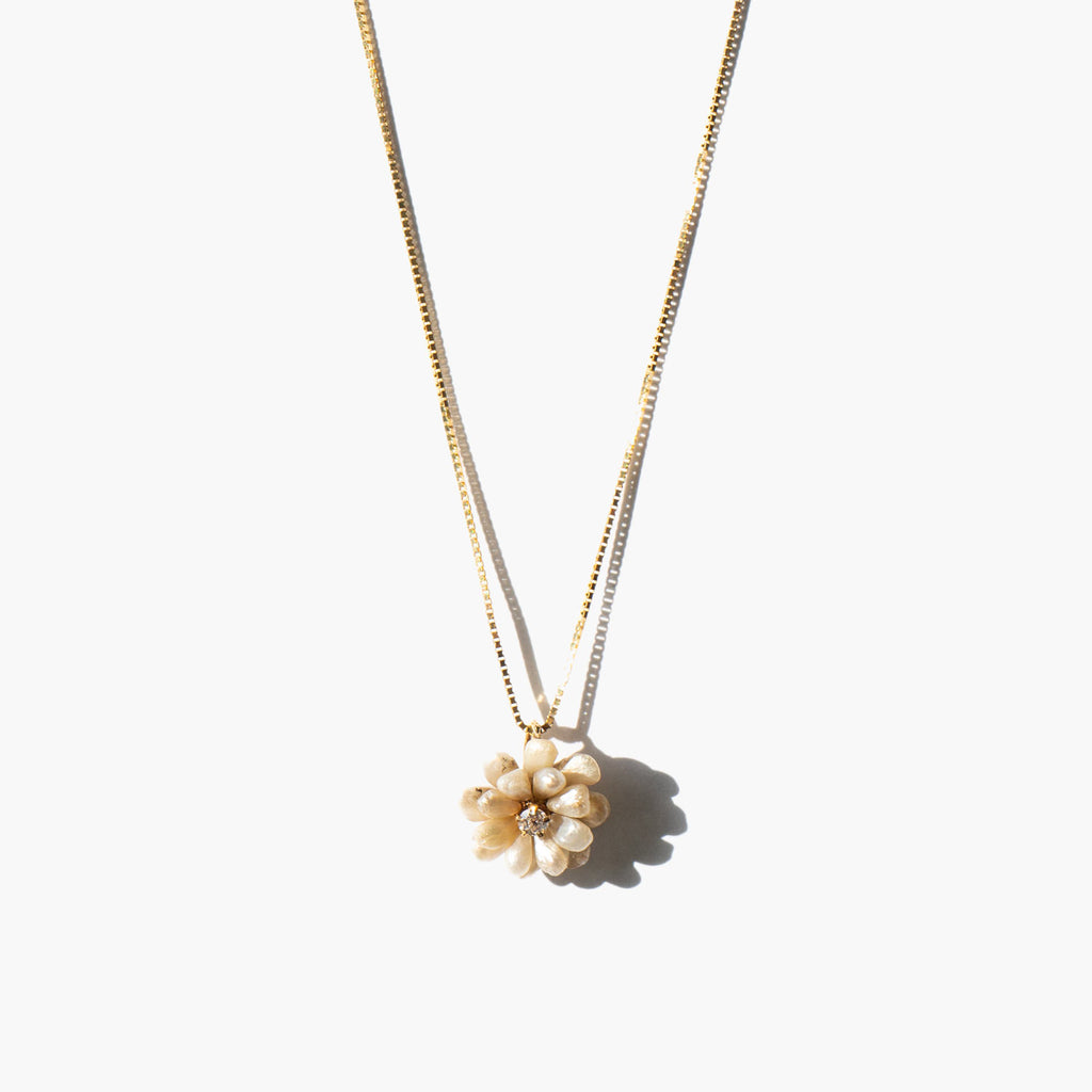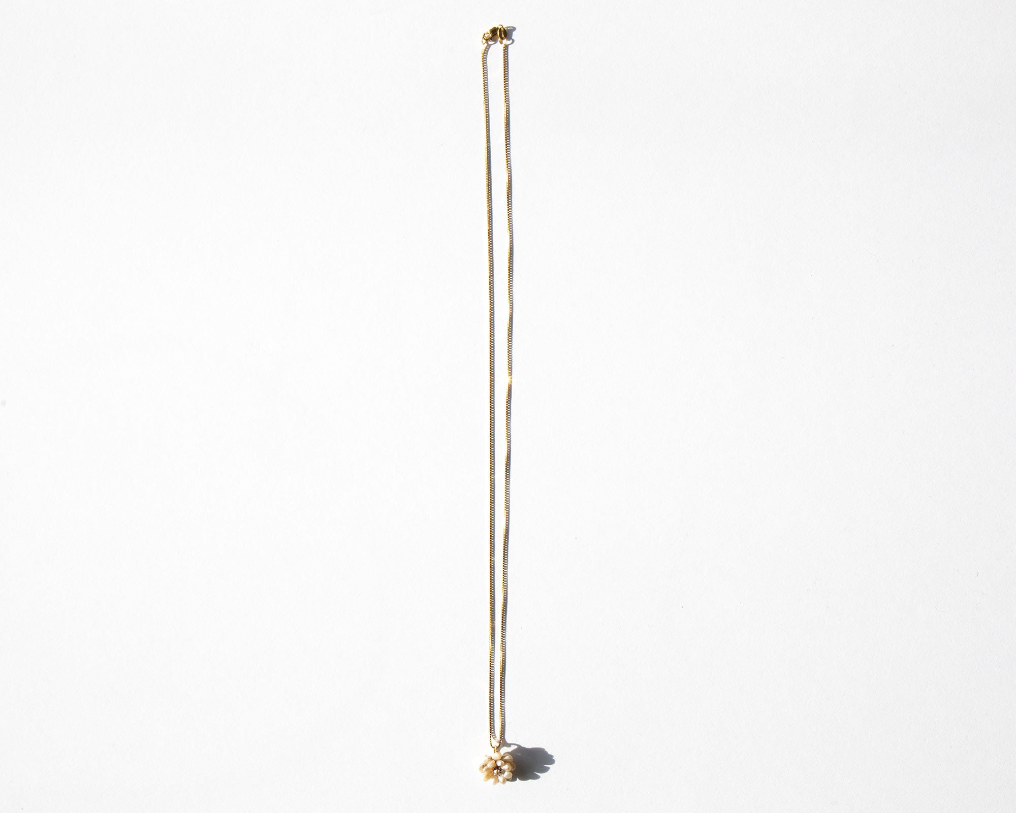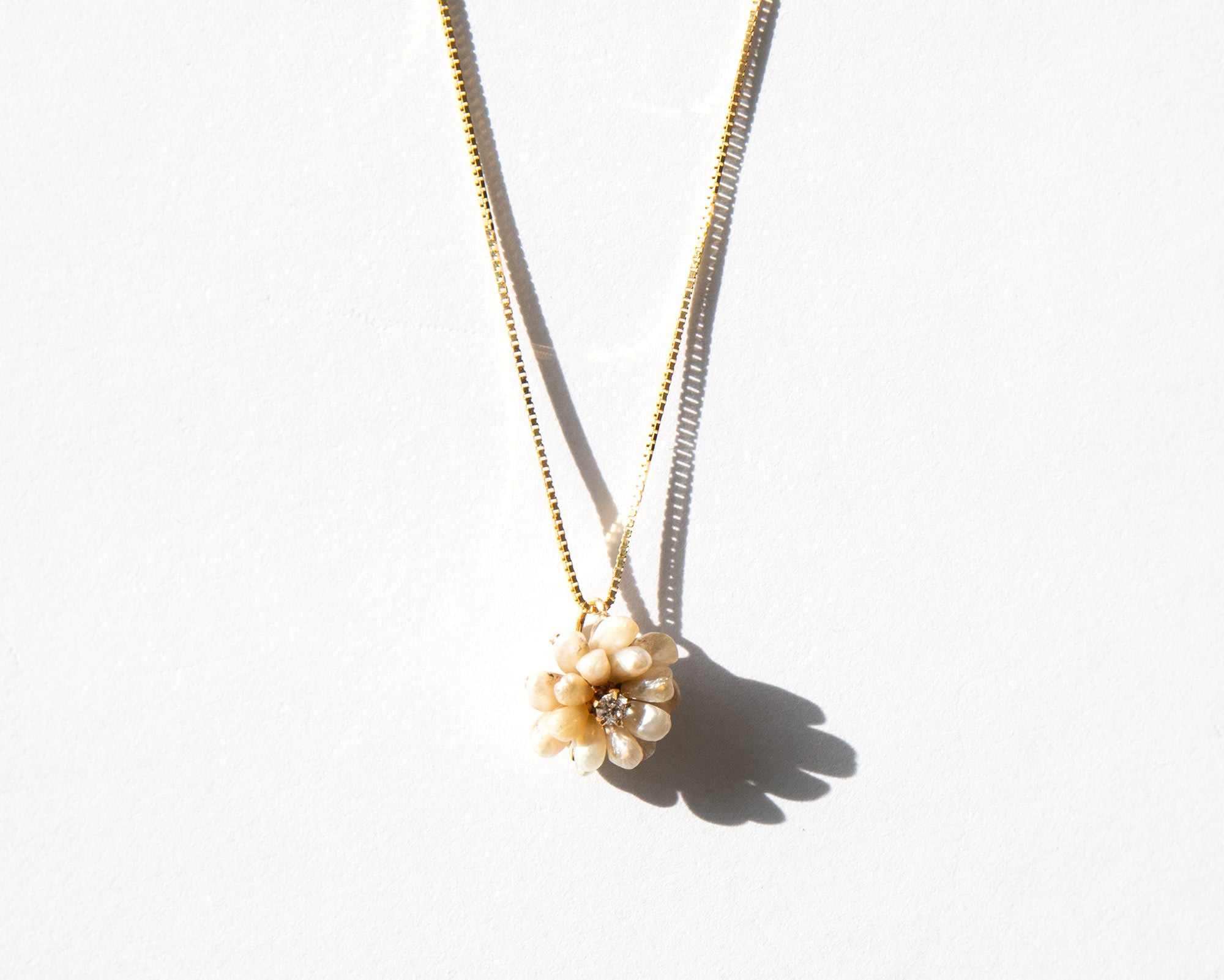 Elegant antique pearl flower pendant with a diamond center on a 14k gold chain.