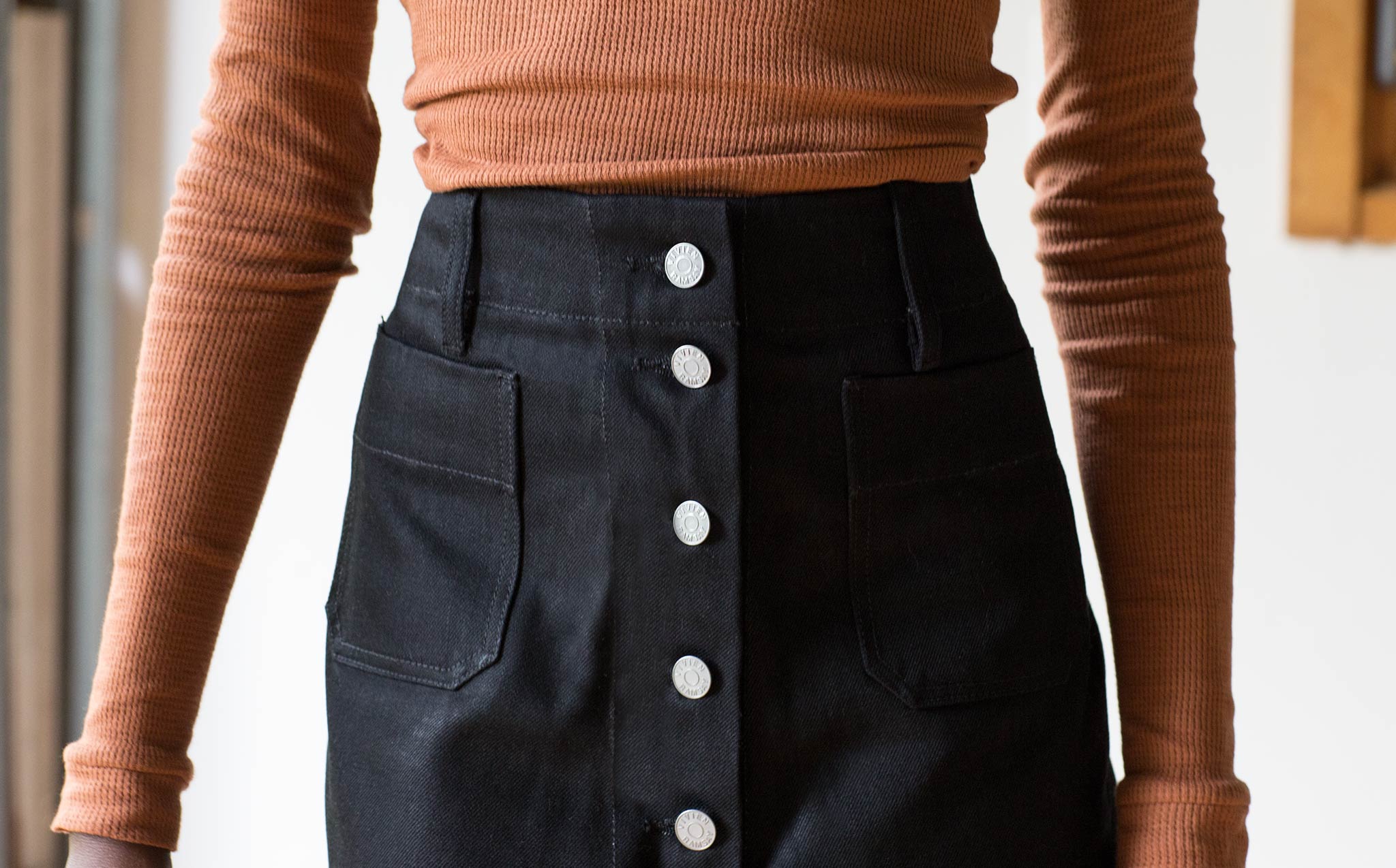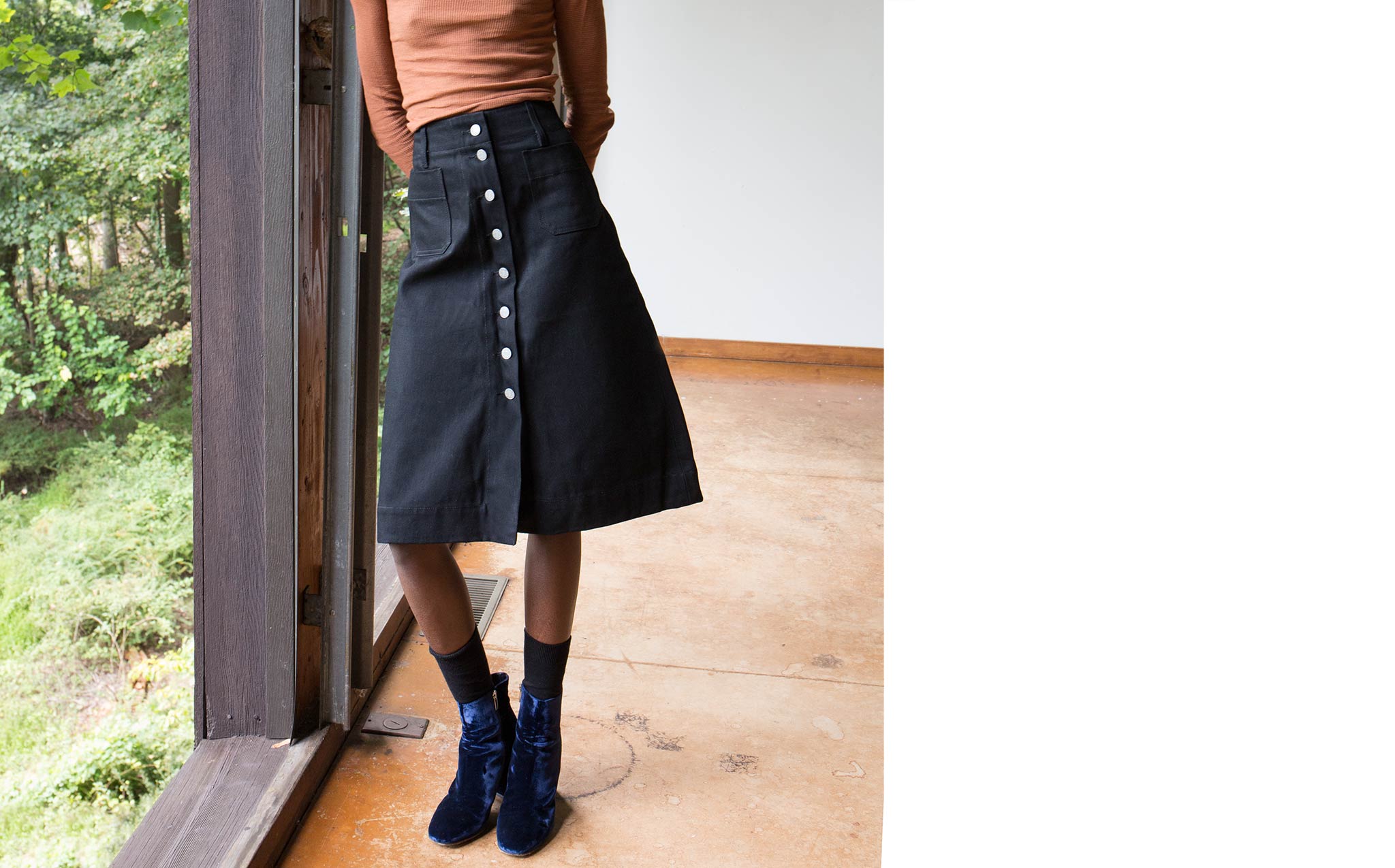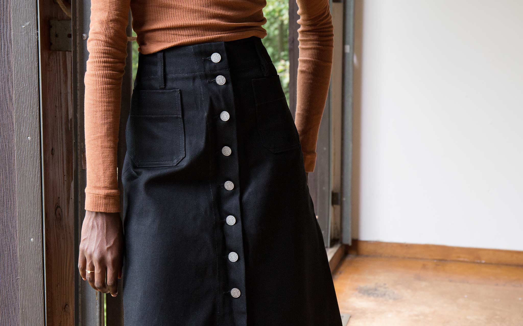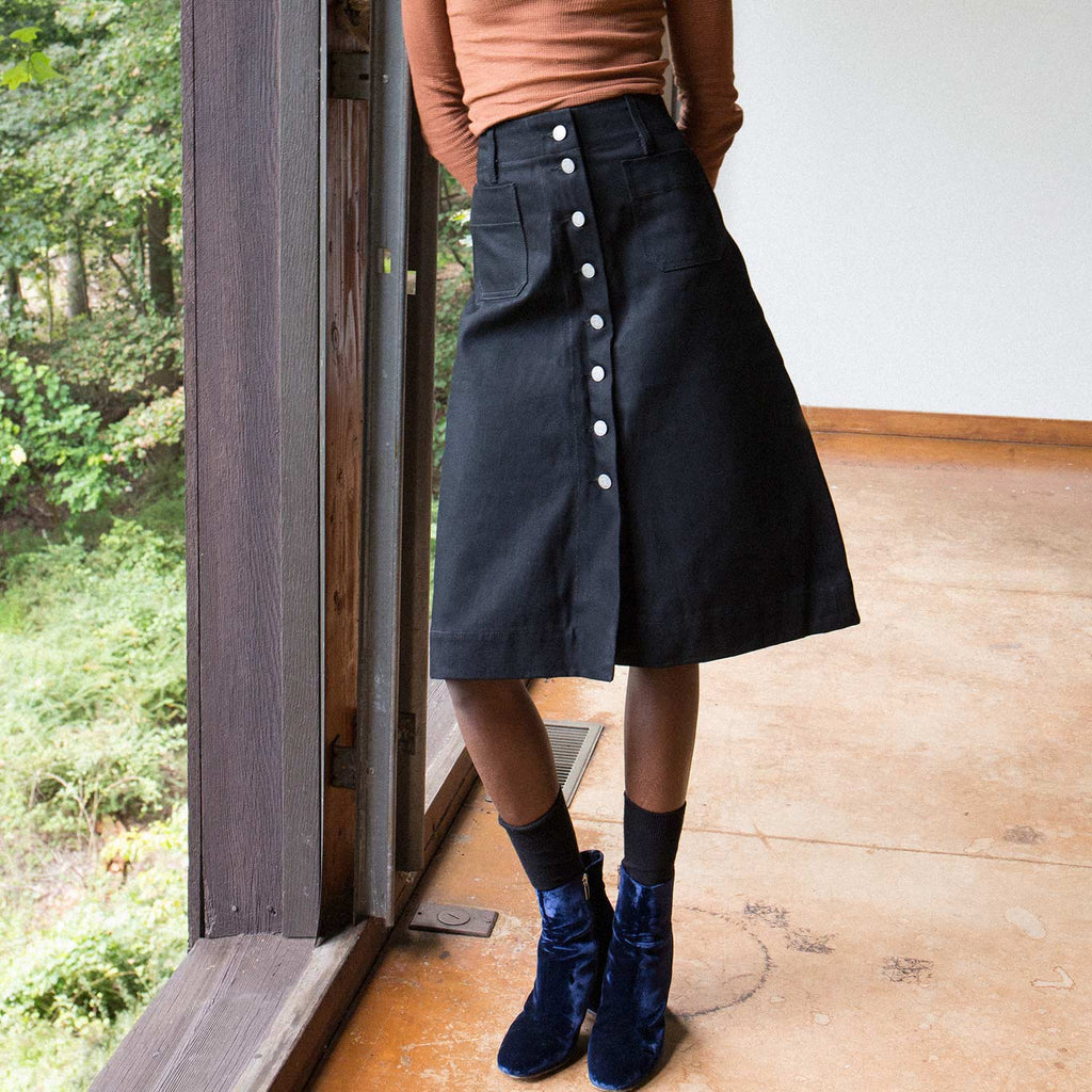 The Vivien Ramsay Black Denim Standard Skirt is designed and perfected by Vivien Ramsay. The former Design Director for Levi's, Ramsay's denim is the product of years of tinkering and experimentation. A perfectly flattering, classic, high waisted, A-line skirt with button down front.