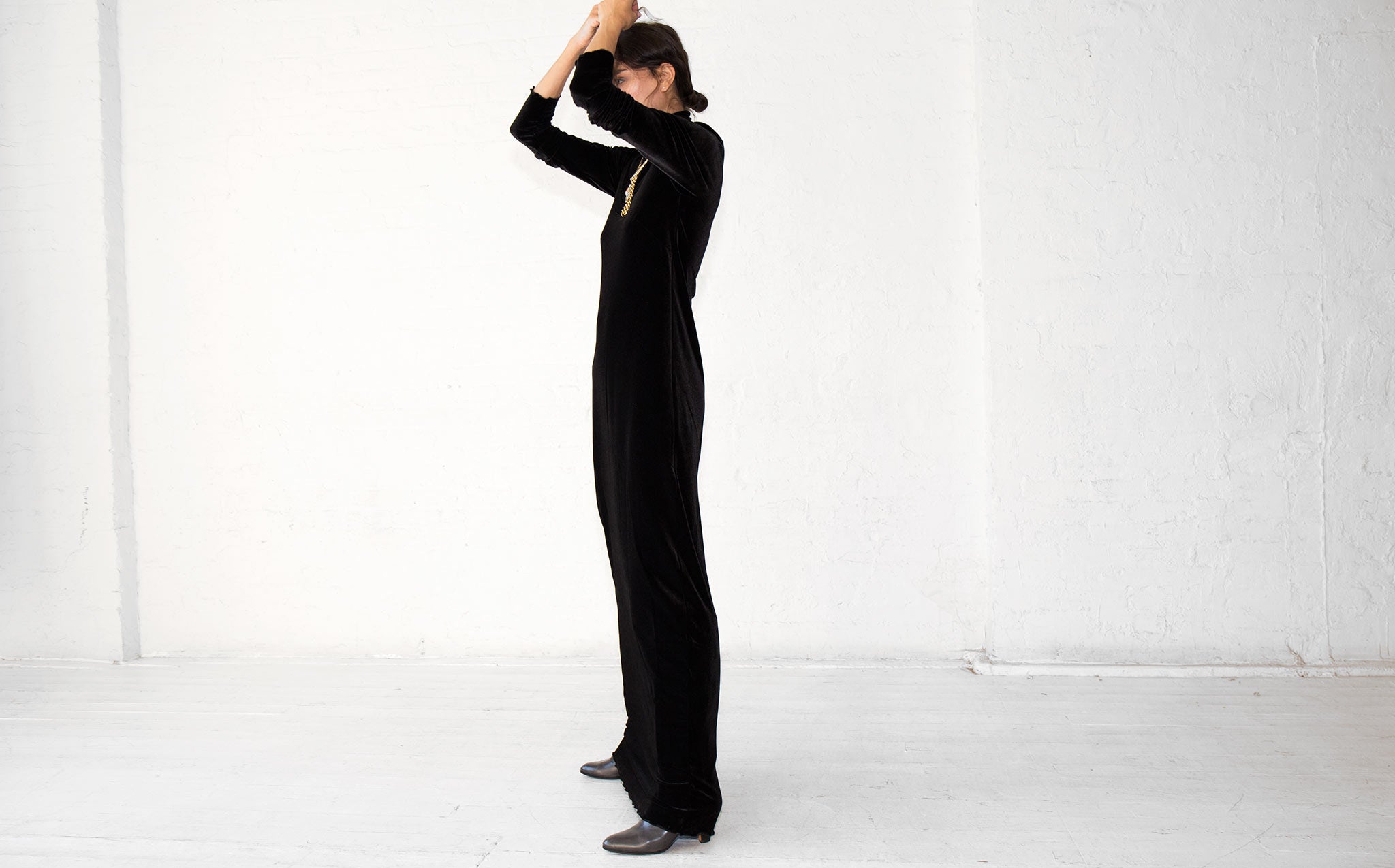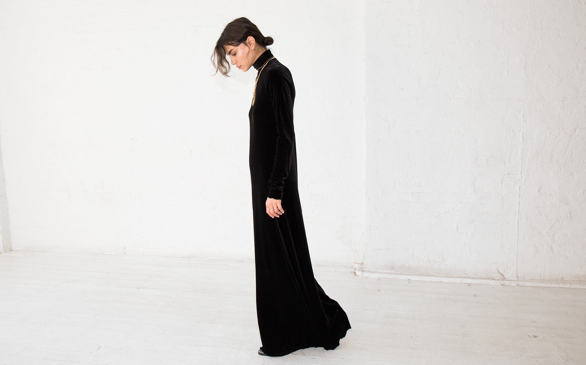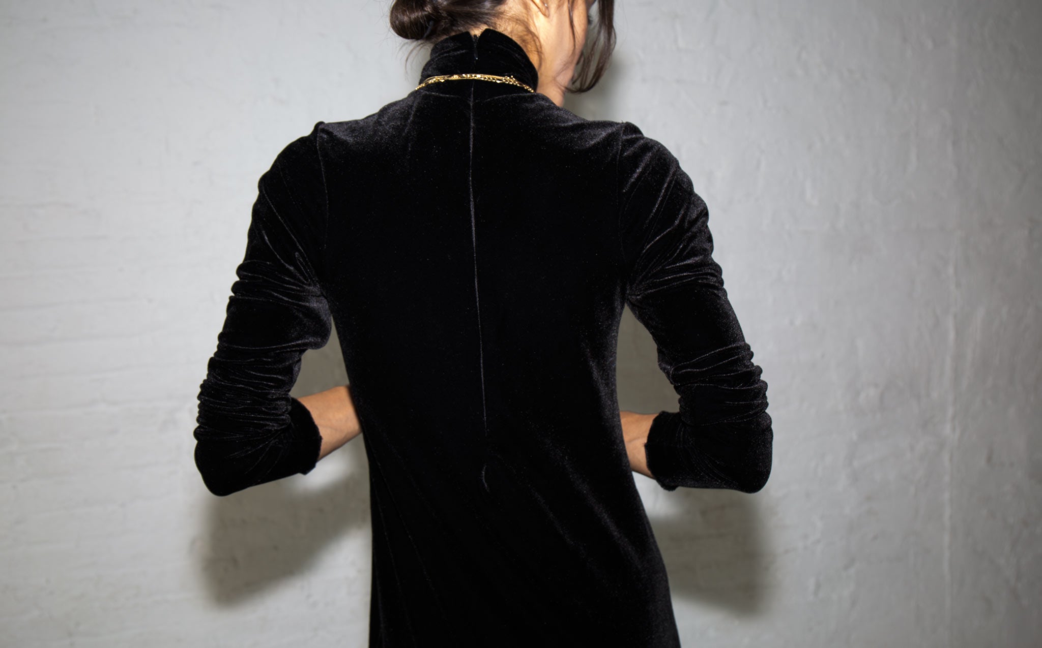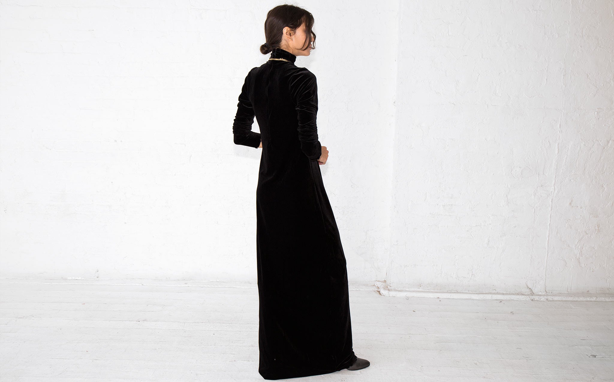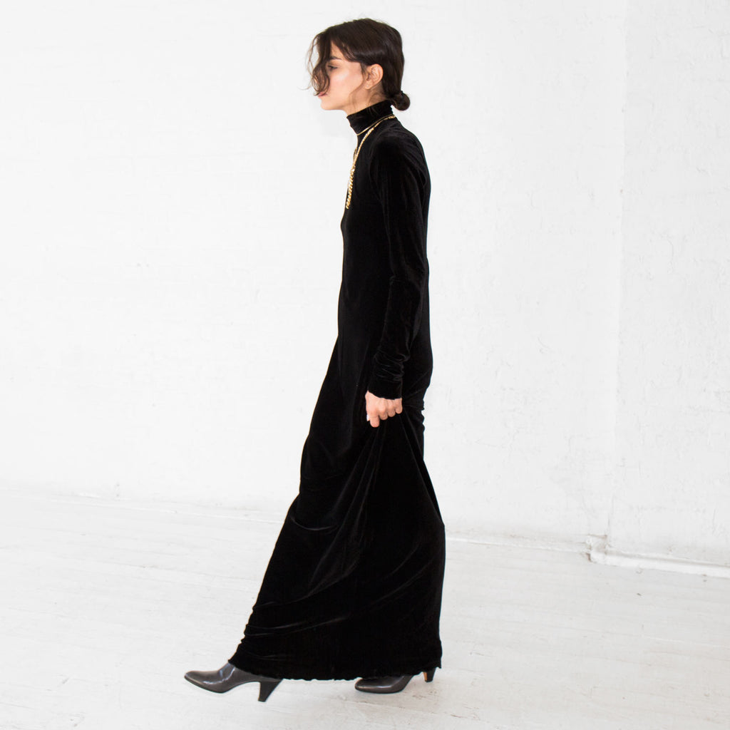 The Vivien Ramsay Tee Neck Gown is a dramatically cut, turtleneck style maxi dress. Made of beautifully soft and thick black stretch velvet, this dress is a sleek choice for formal occasions and can be easily dressed down with a leather motorcycle jacket and flat boots for a more casual look. *This item is FINAL SALE.