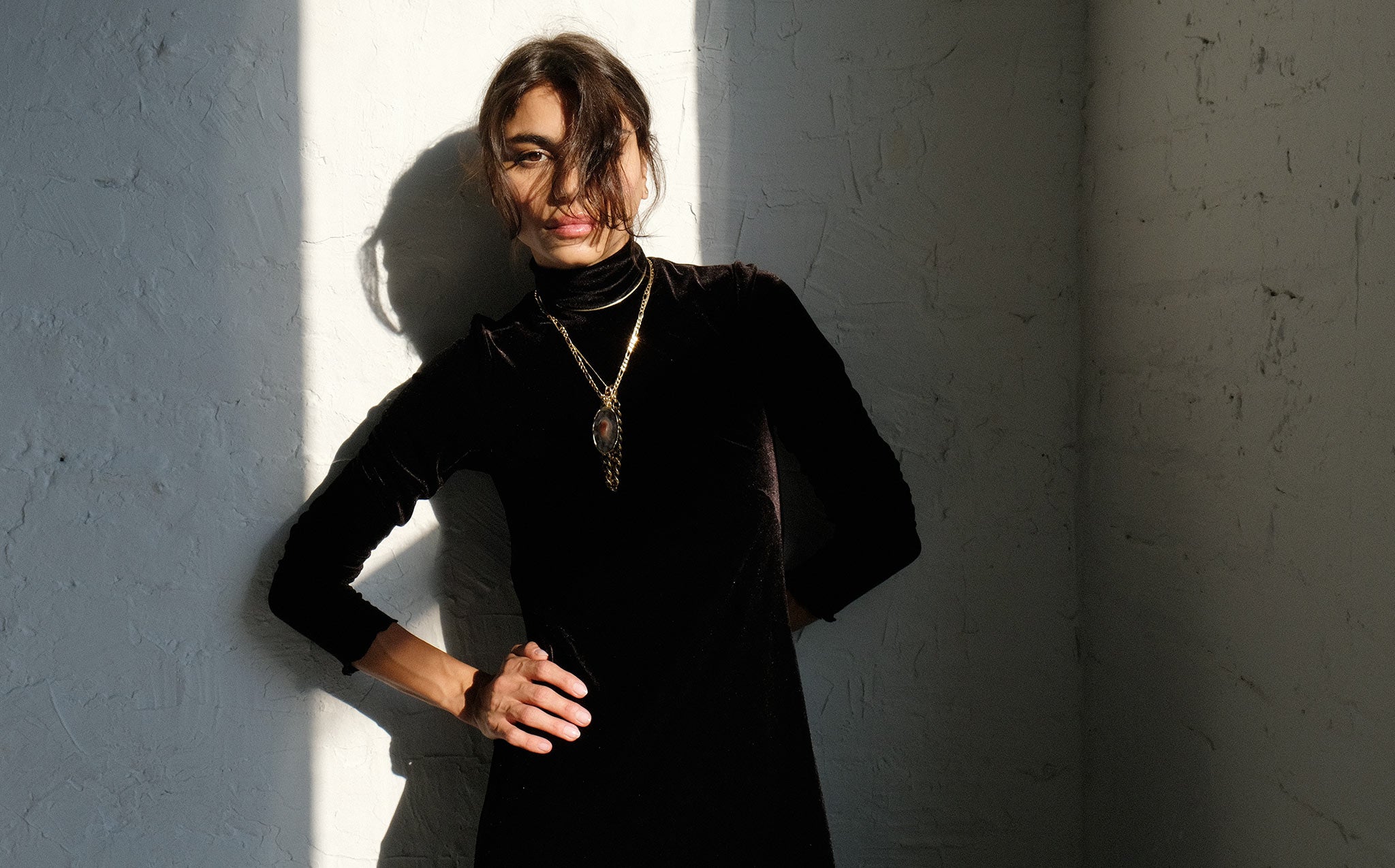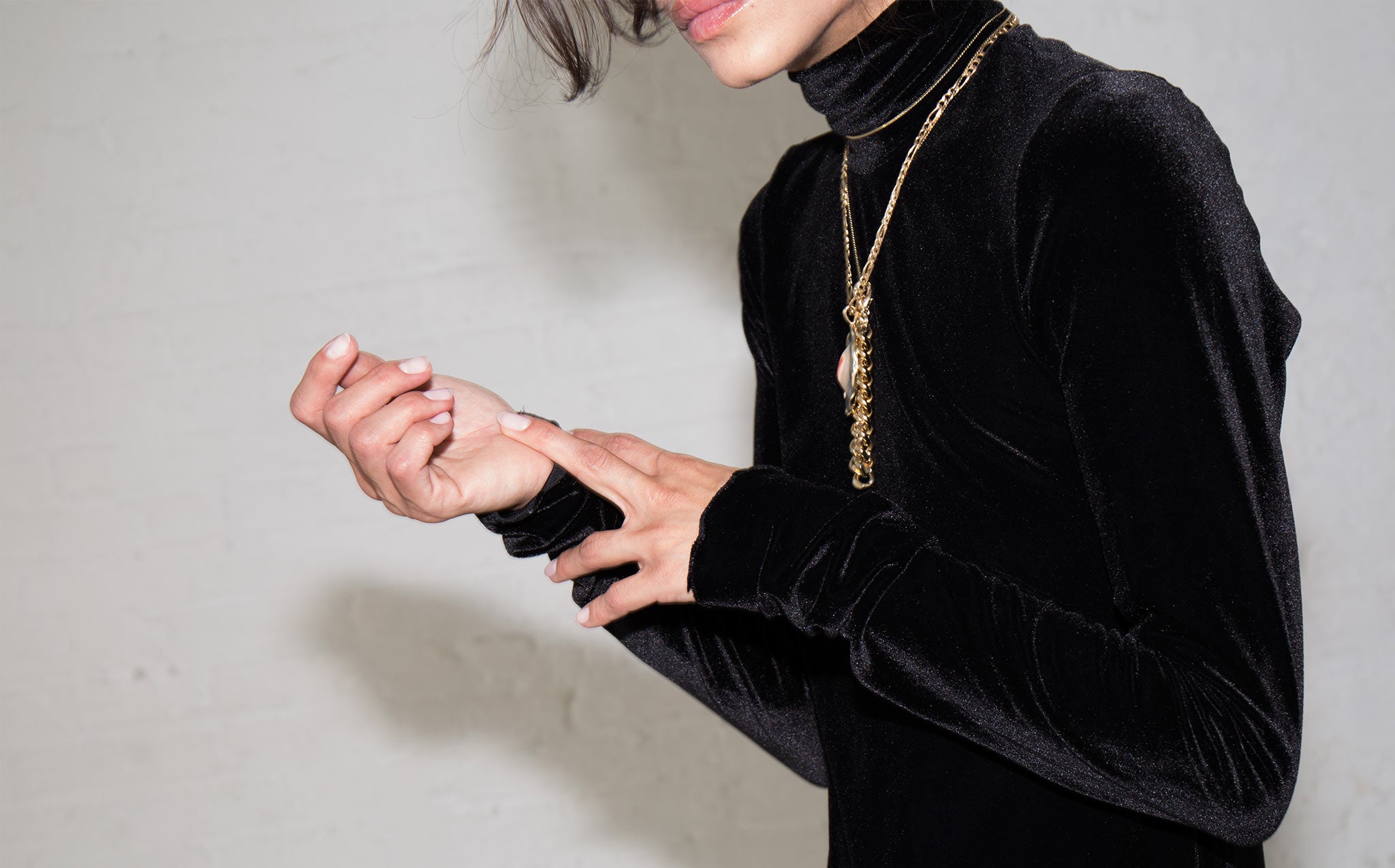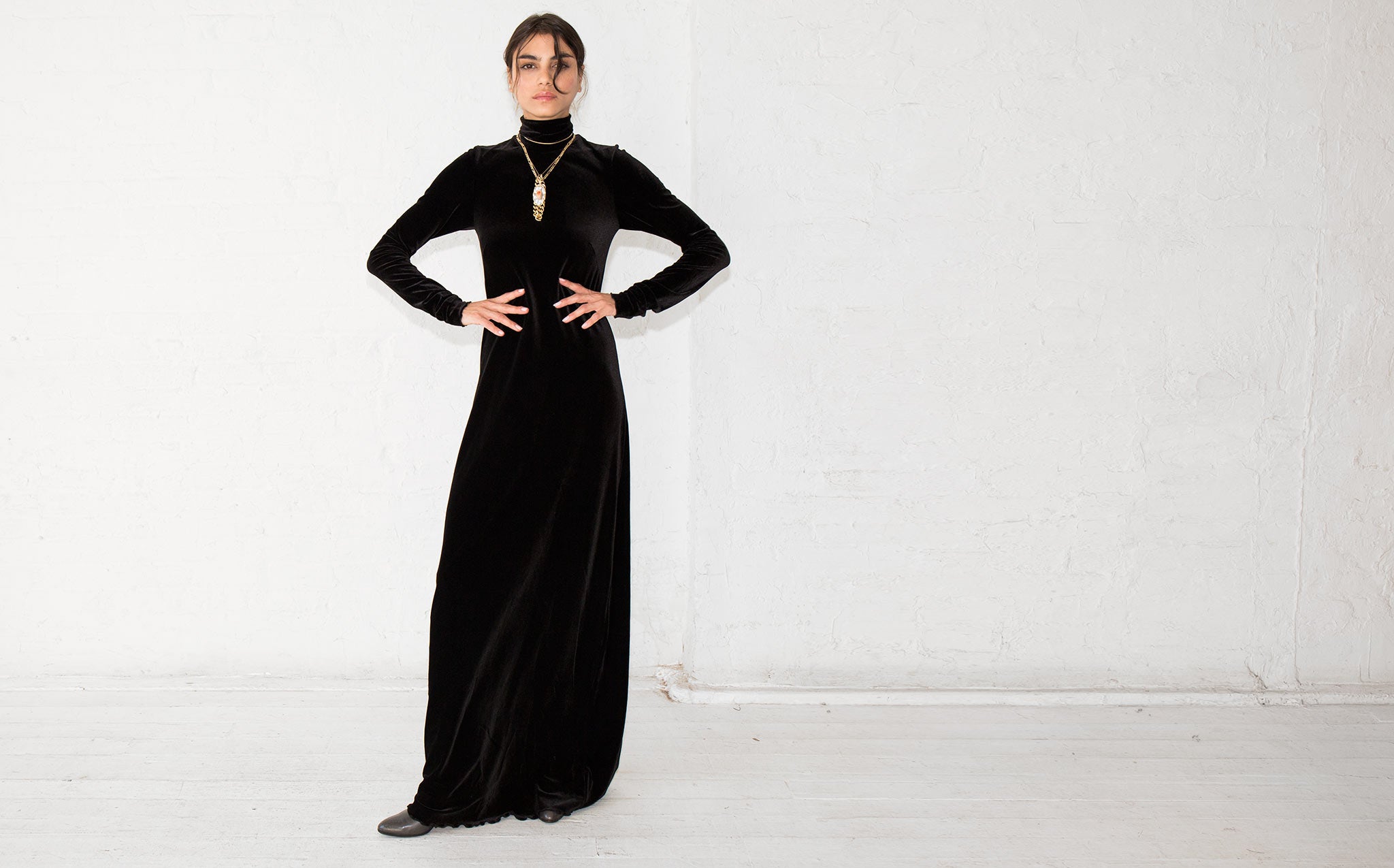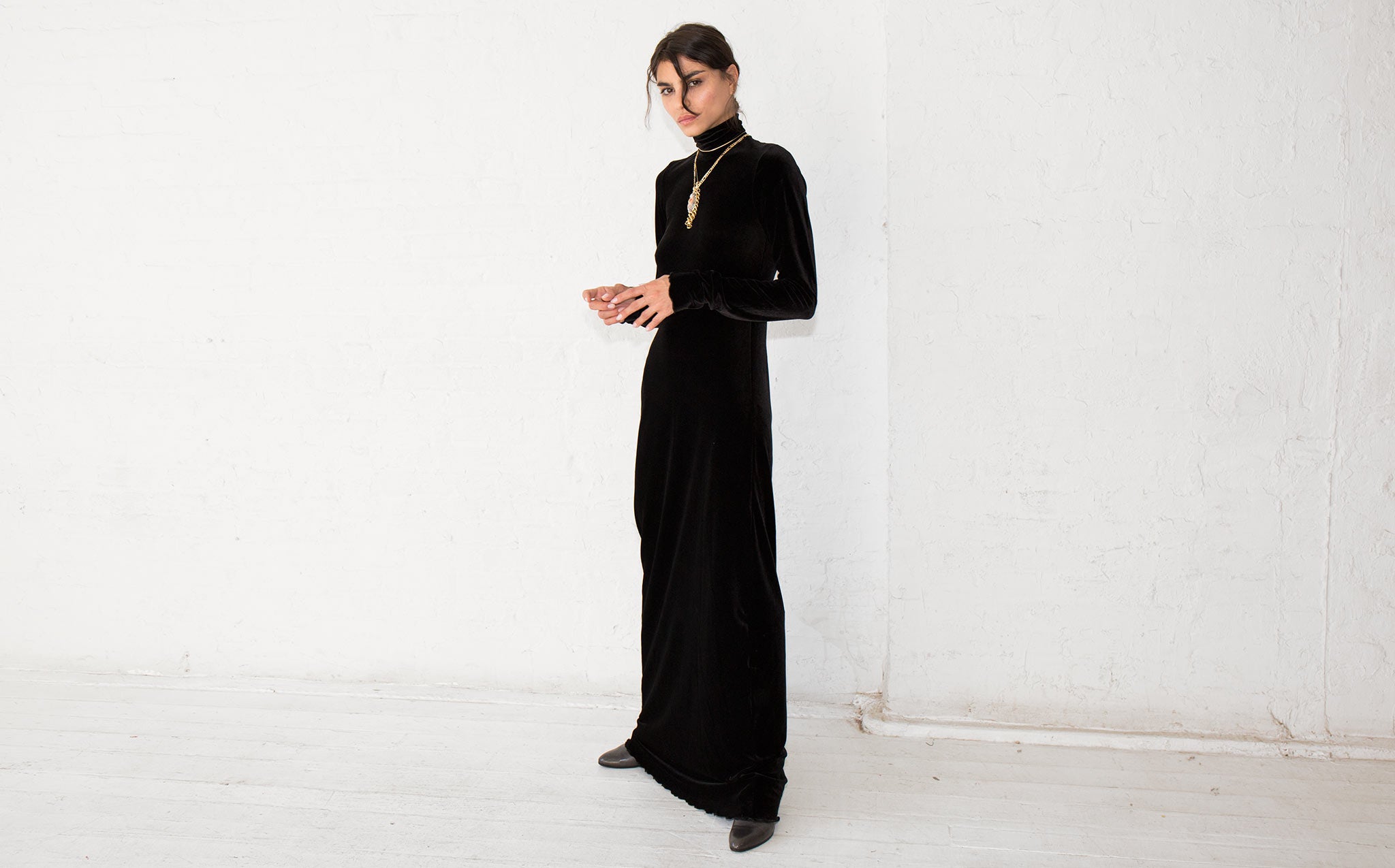 The Vivien Ramsay Tee Neck Gown is a dramatically cut, turtleneck style maxi dress. Made of beautifully soft and thick black stretch velvet, this dress is a sleek choice for formal occasions and can be easily dressed down with a leather motorcycle jacket and flat boots for a more casual look. *This item is FINAL SALE.