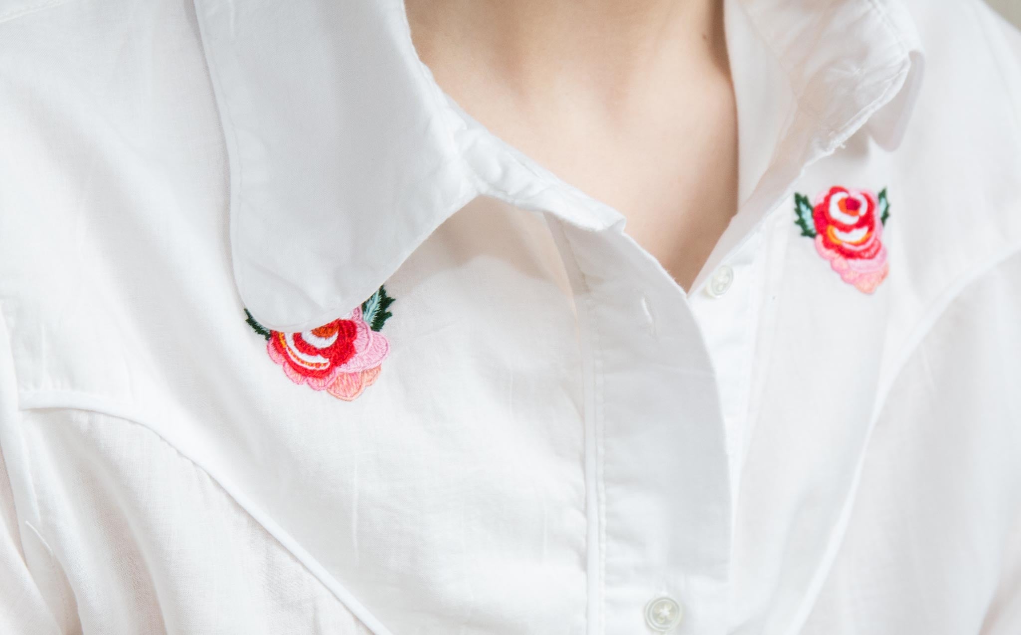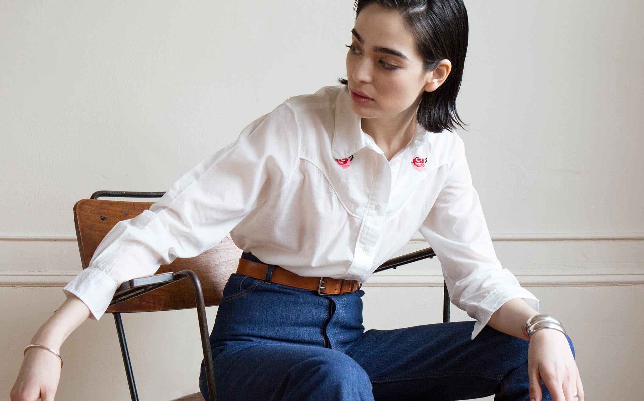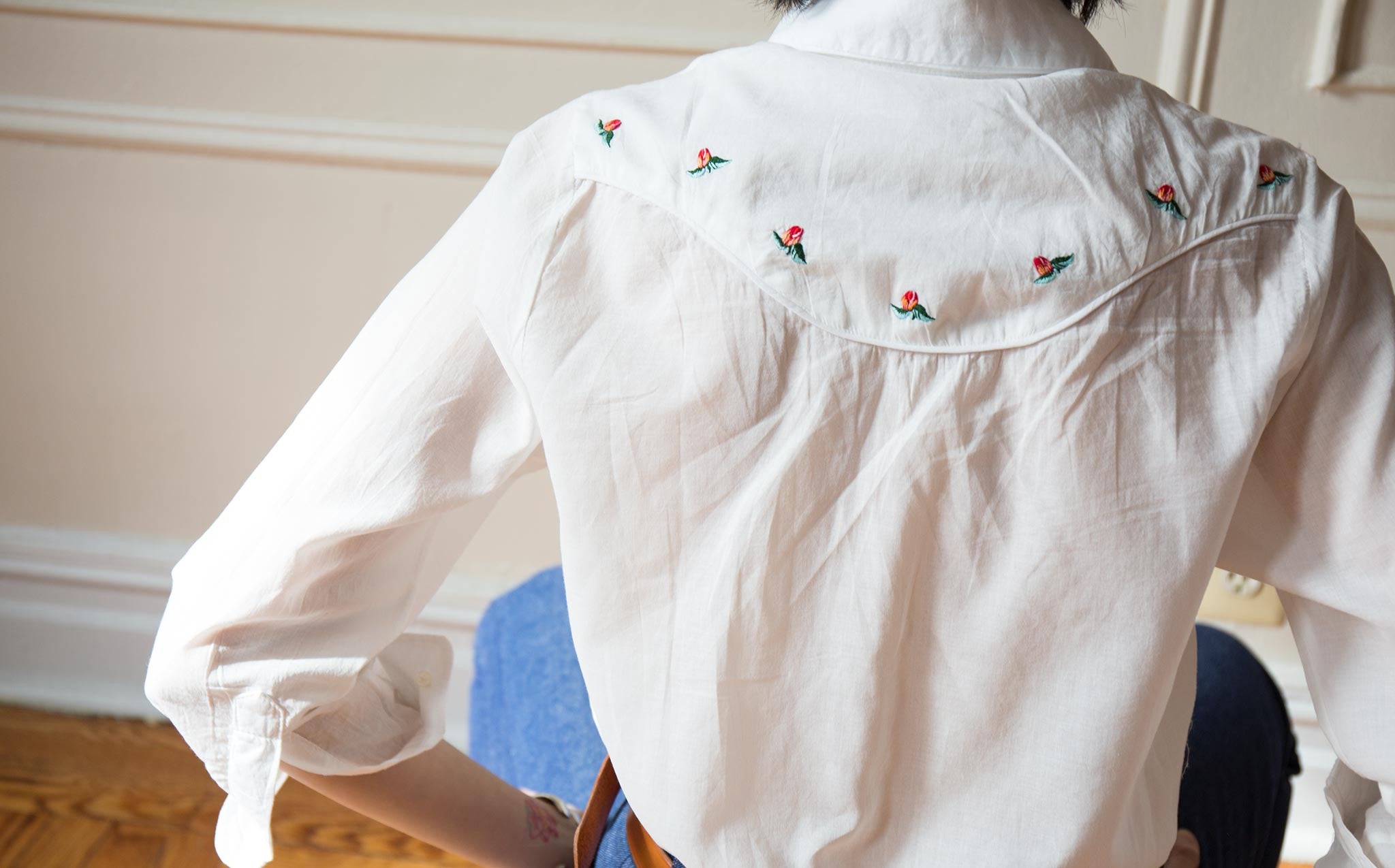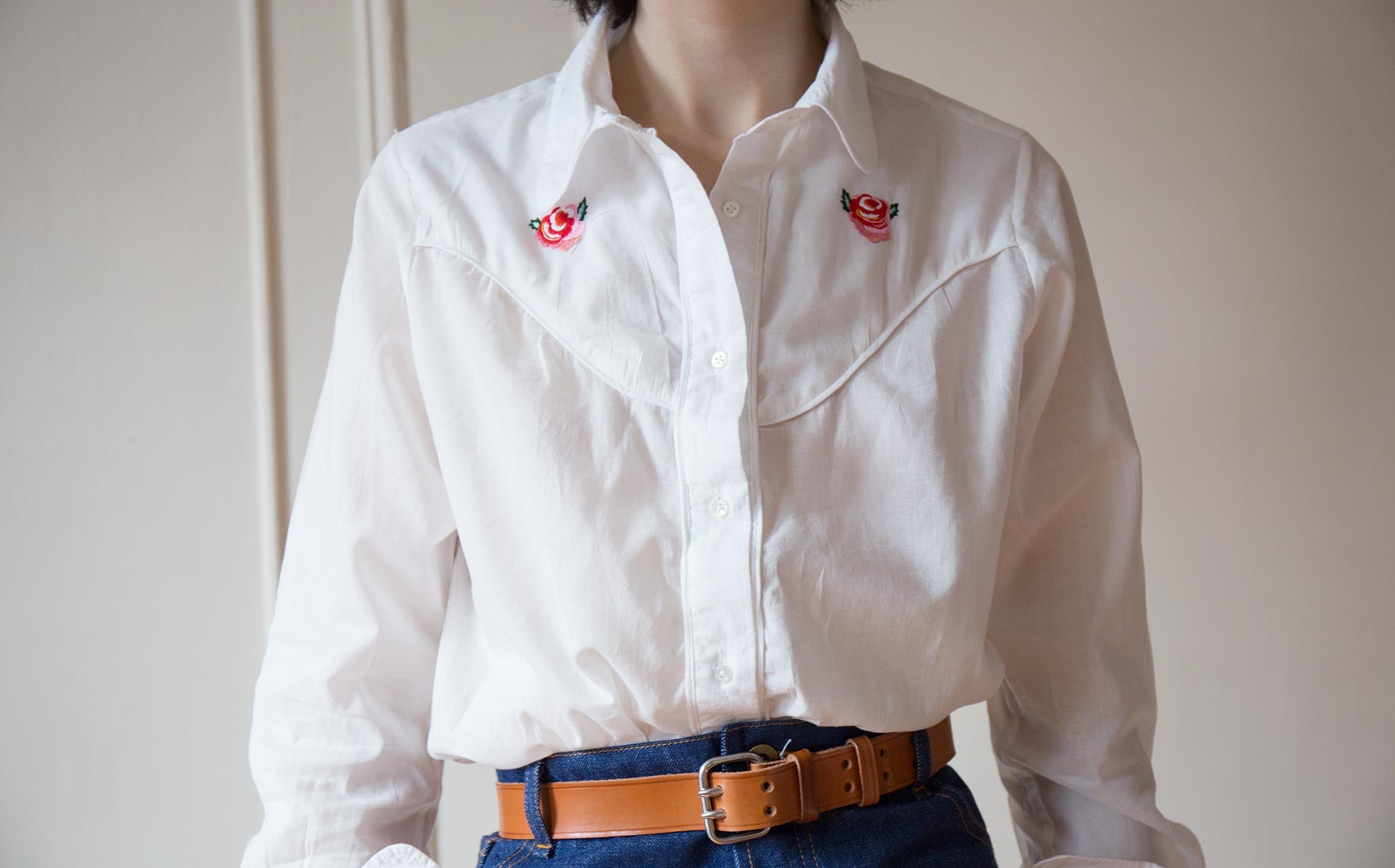 The Vivien Ramsay SS17 Rodeo Cowboy Shirt is a lightweight button-up with details reminiscent of classic embroidered western-wear. Light, crisp white cotton with small pearlized buttons, and embroidered roses. This item is FINAL SALE.