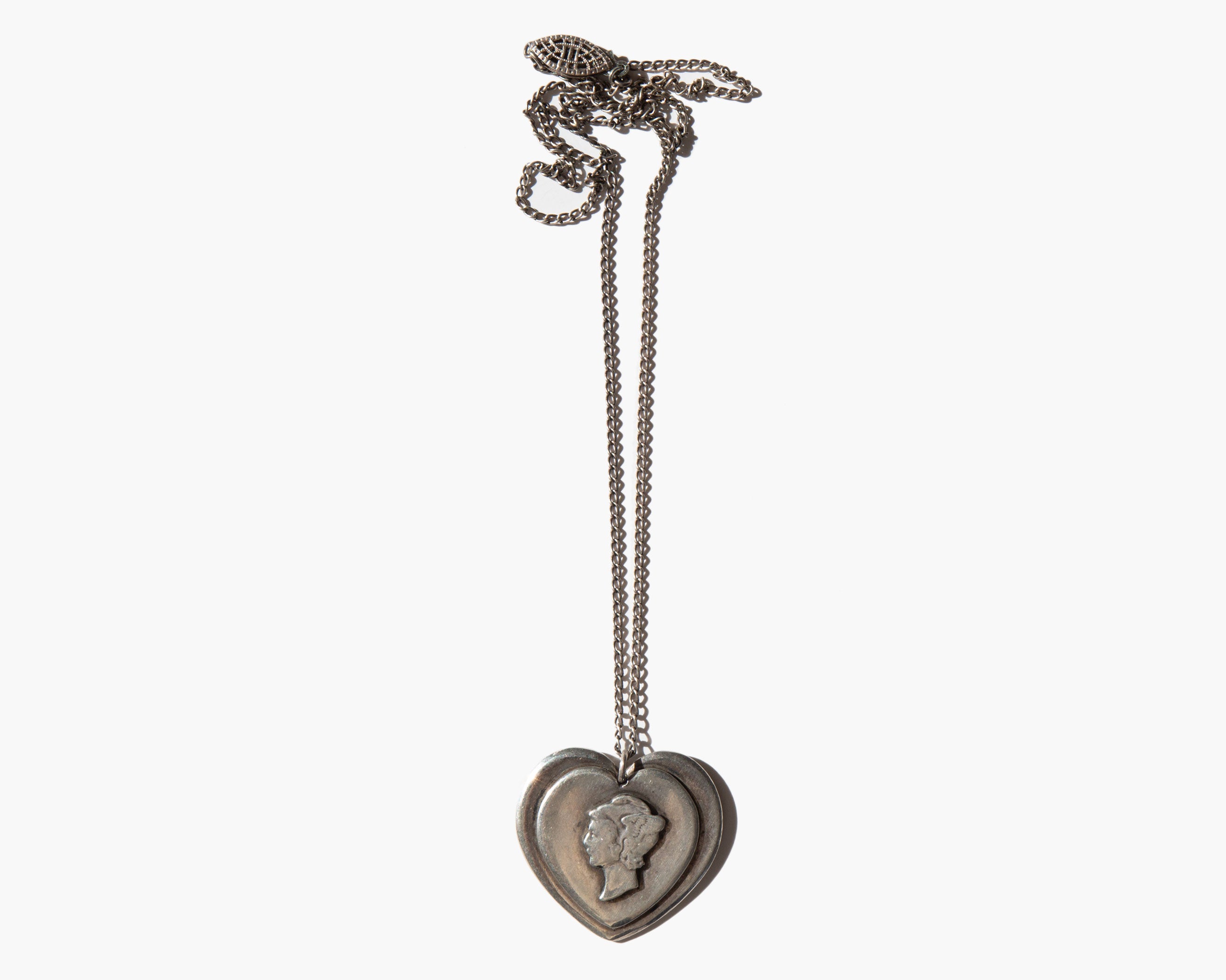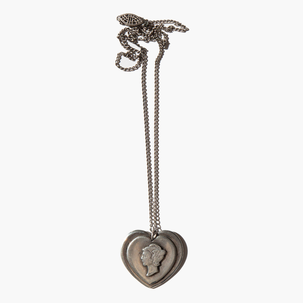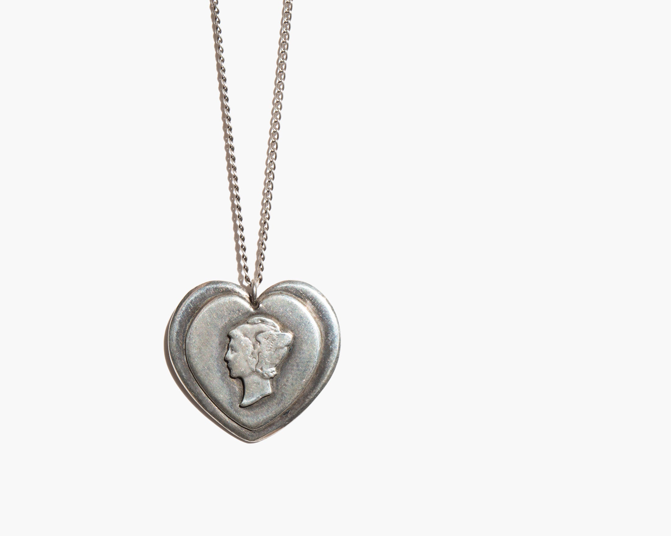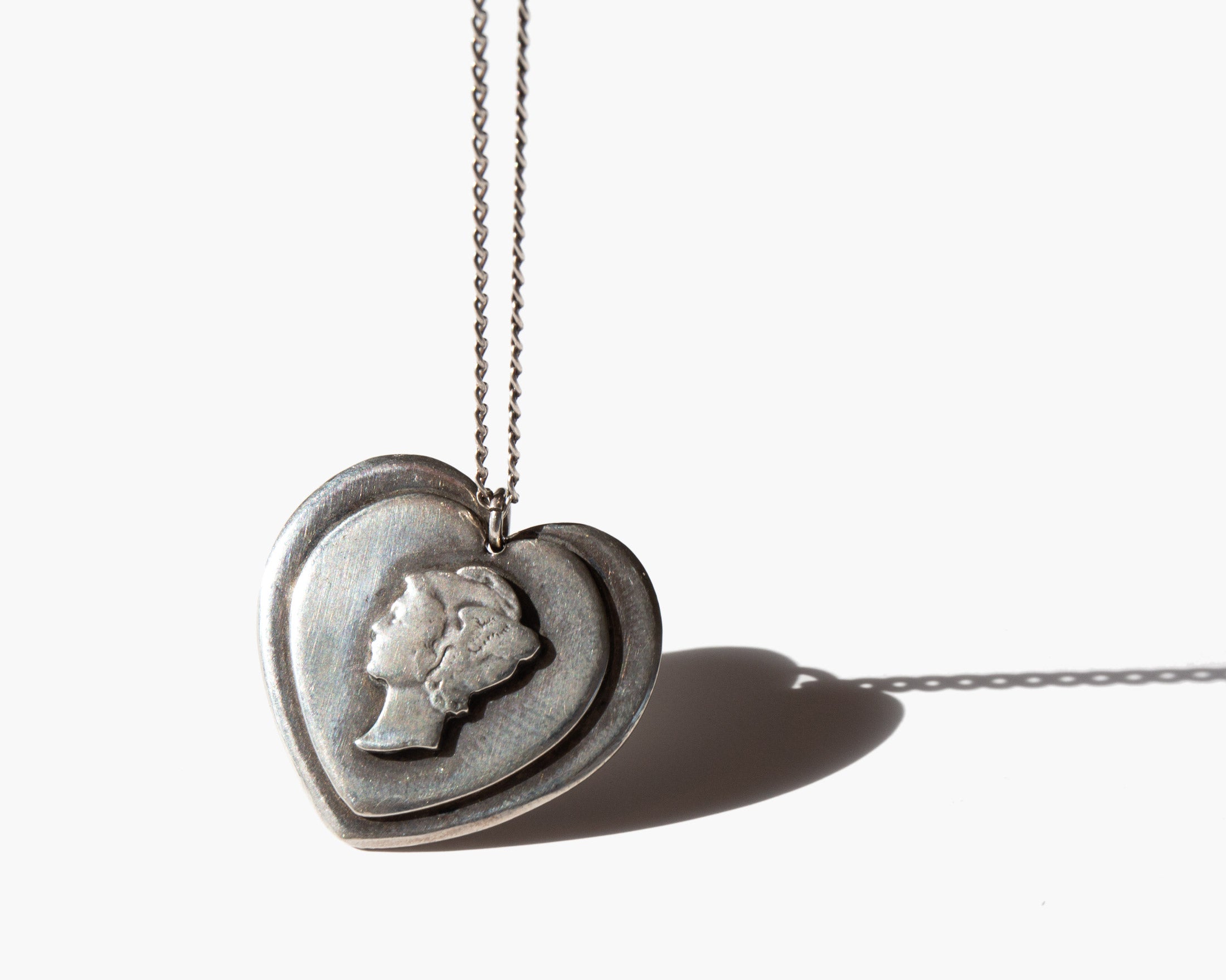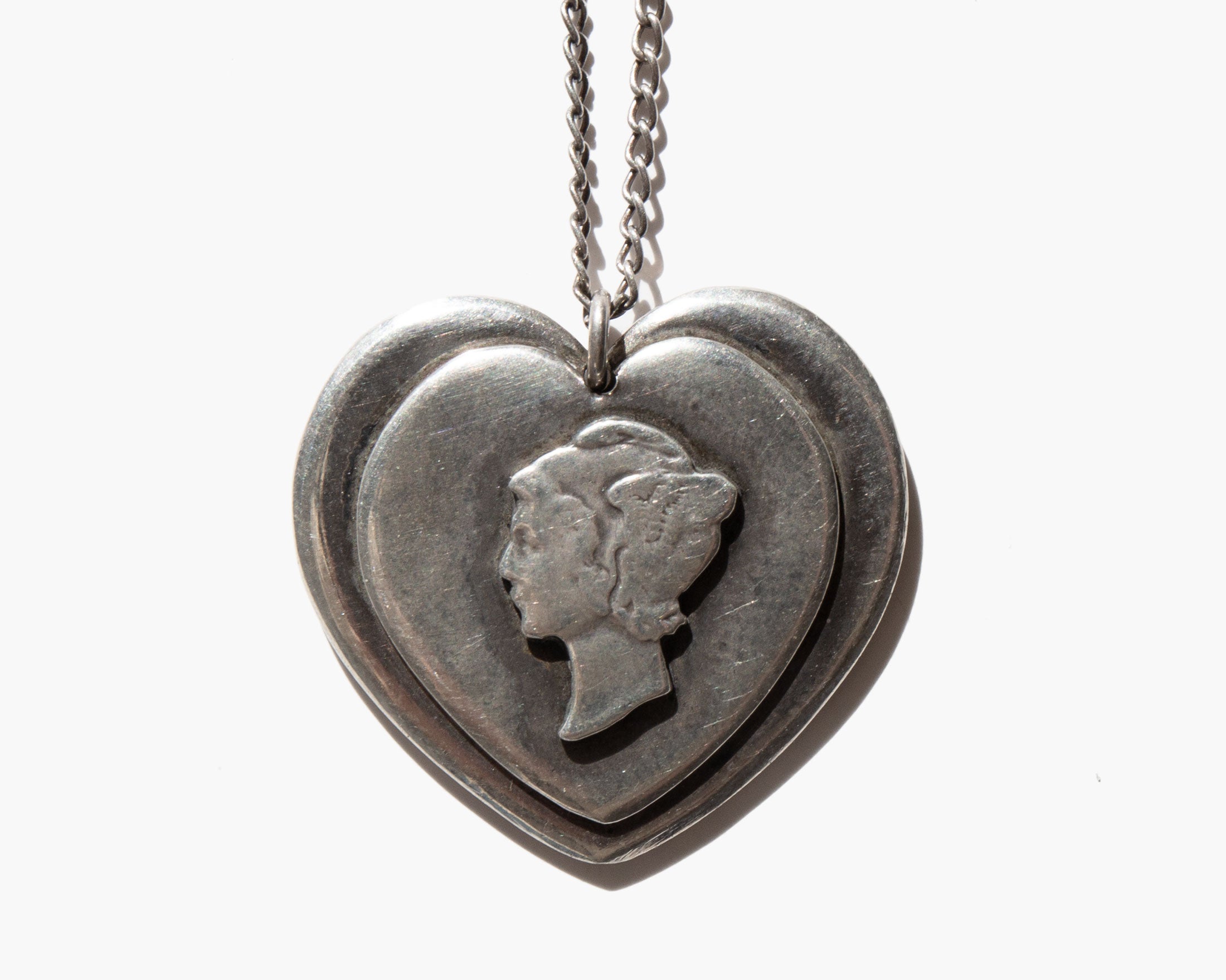 Sterling silver heart pendant with a profile of Mercury, cut out from a Mercury dime and layered onto two quarters. Mercury is the Roman god of luck and communication, and a guide for the souls of the deceased to the underworld. During WWII men assigned to machine shops would often make these types of pendants as tokens for their sweethearts. Pendant is hung on a sterling silver link chain.