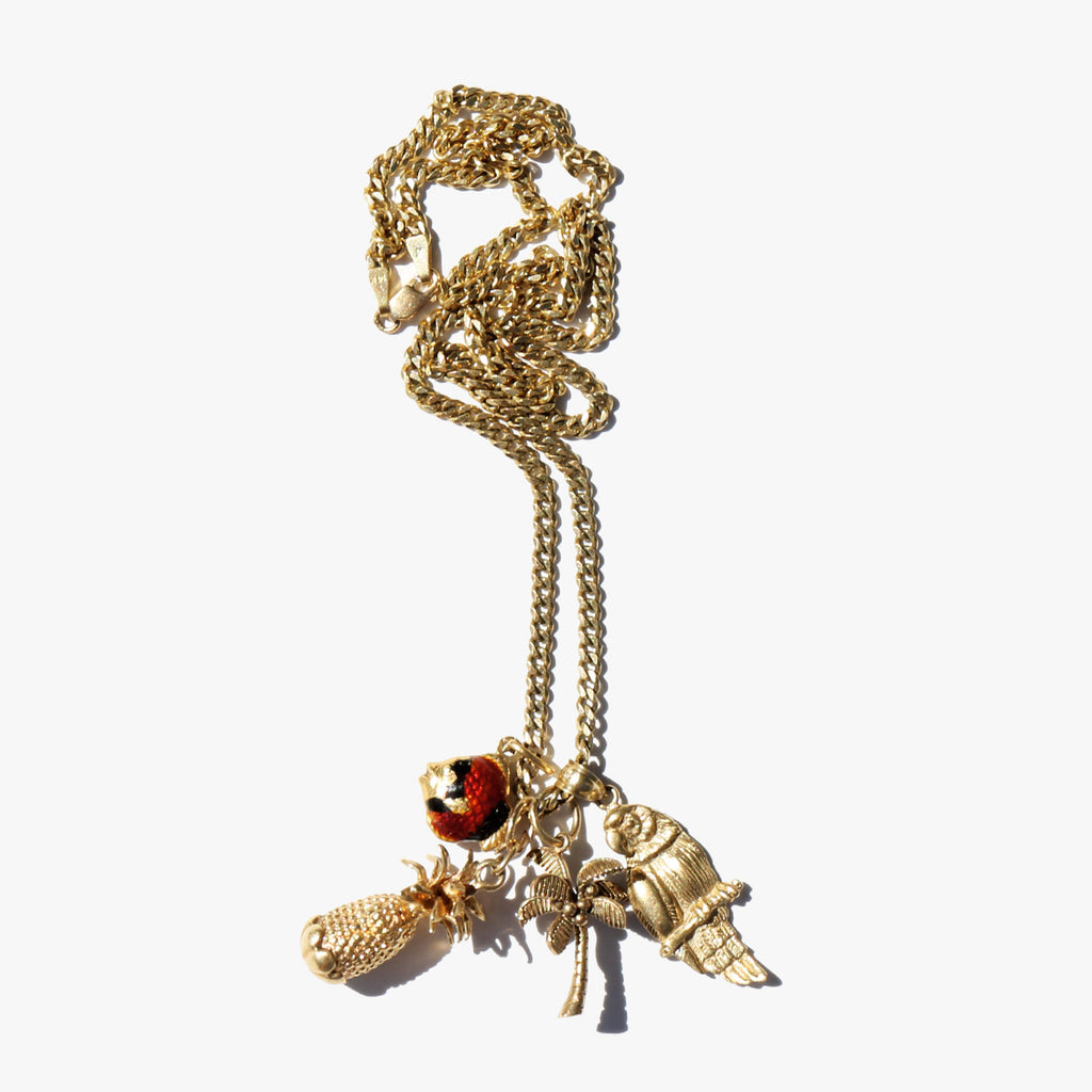 A quartet of 14k gold, breezy island-inspired charms for those of us who could use a little more sunshine in our lives. The parrot is believed to symbolize love and companionship, the fish happiness and abundance, and the palm tree and pineapple warmth, welcome, and good luck. The charms hang from a solid 14k gold tight link chain.