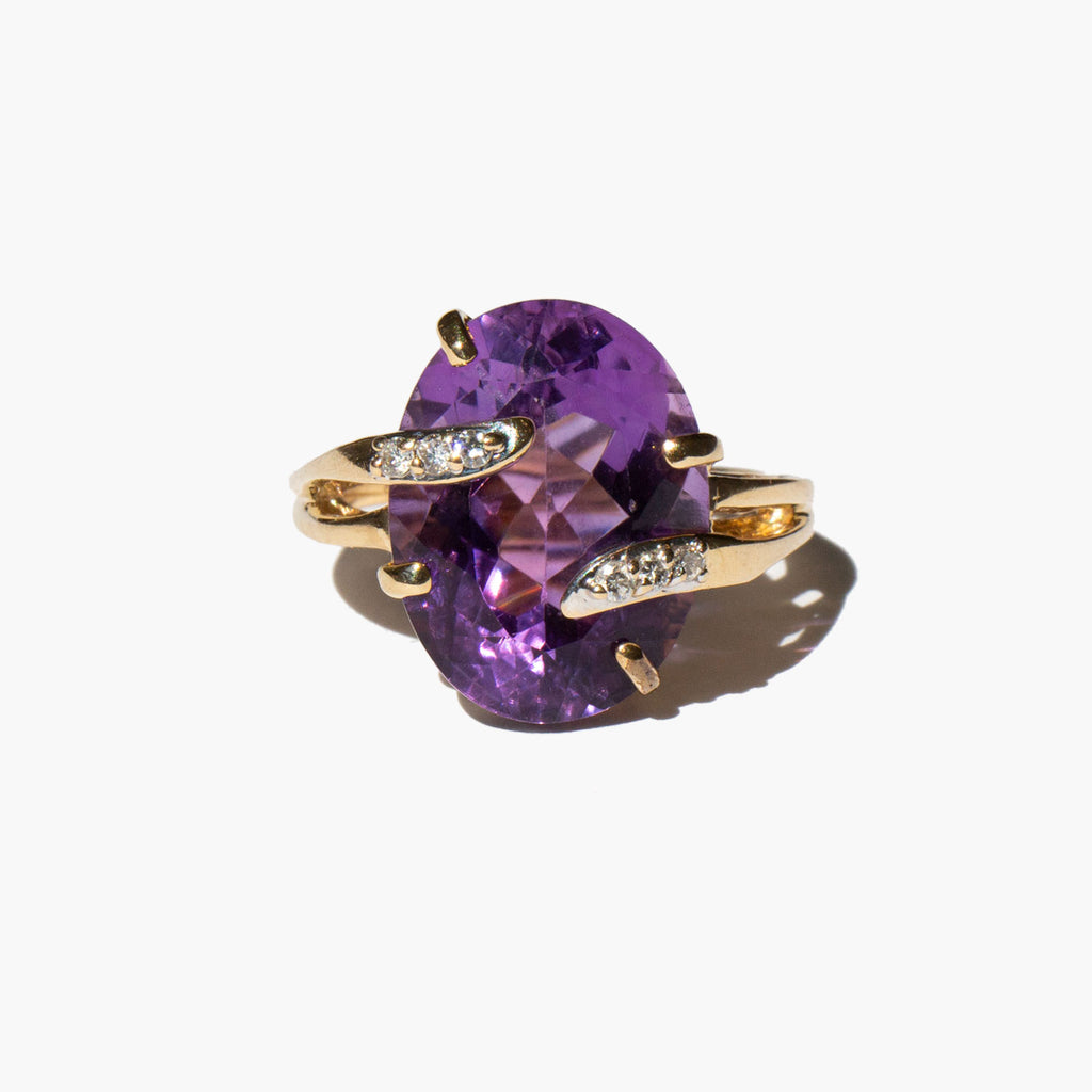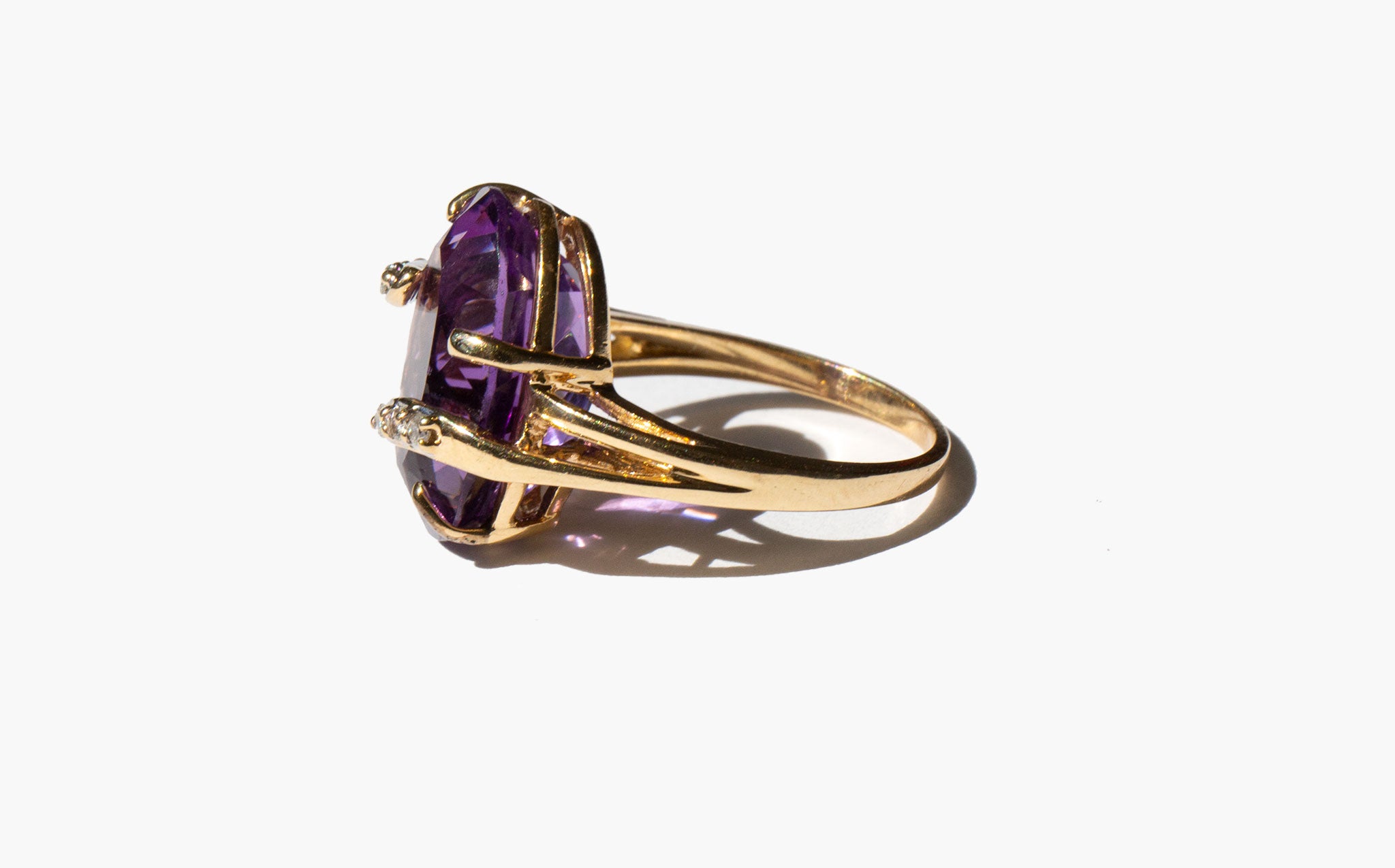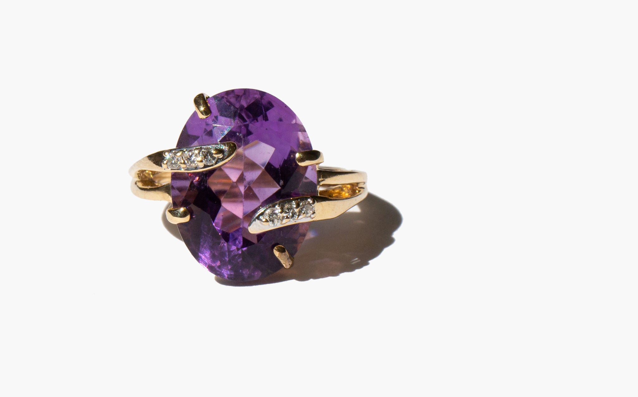 A large faceted amethyst in a vivid shade of violet set in 14k gold with sparkling diamond accents. Amethyst has been known throughout the centuries as a symbol of purity and spirituality, an amulet of protection against evil, and as a talisman of success and wealth.