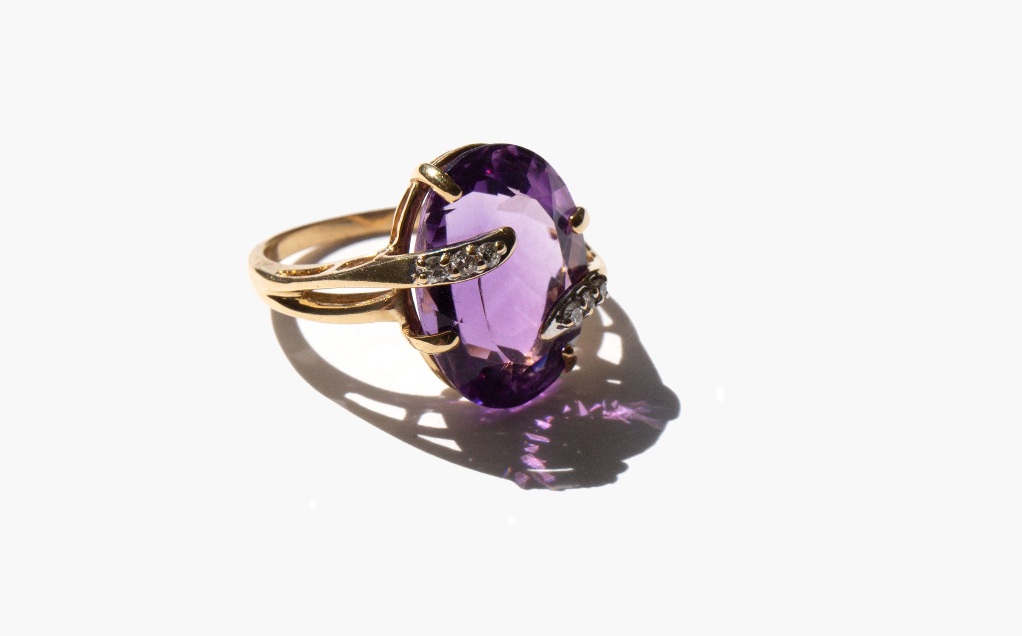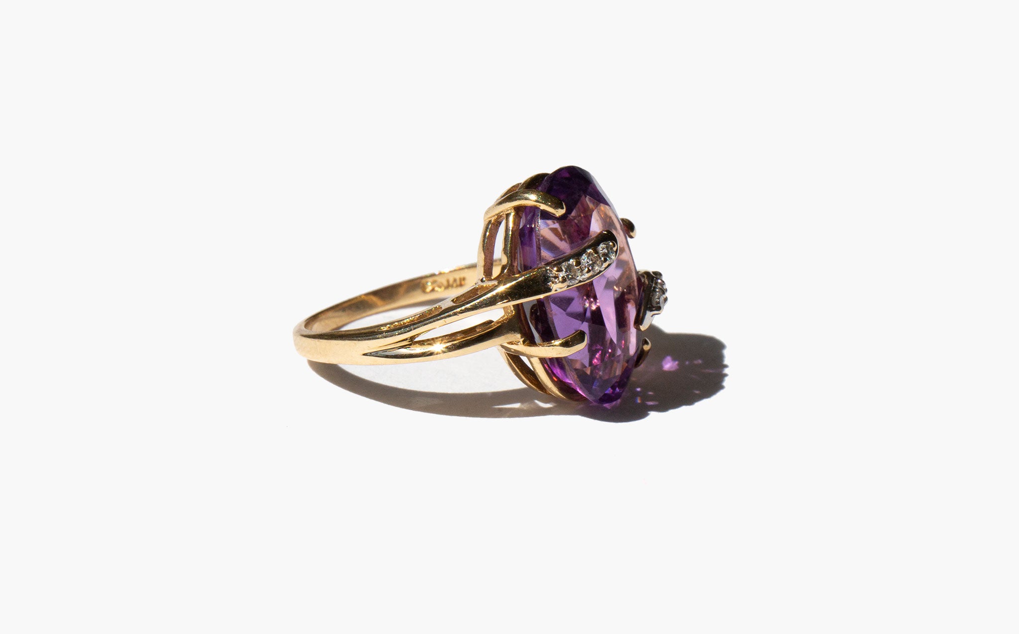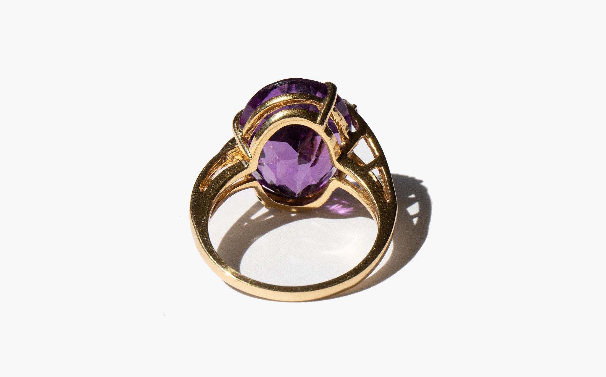 A large faceted amethyst in a vivid shade of violet set in 14k gold with sparkling diamond accents. Amethyst has been known throughout the centuries as a symbol of purity and spirituality, an amulet of protection against evil, and as a talisman of success and wealth.