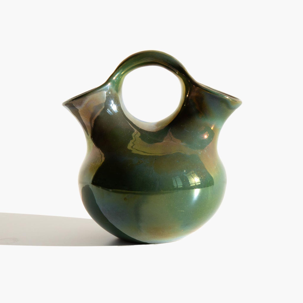 Iridescent sage green French luster finish wedding vase. The wedding vase was originally a tradition of the indigenous Pueblo people. The two spouts represent the two people being wed and the handle represents the bridge that unites them as one.