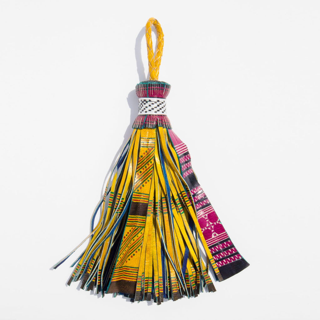 Large, vibrantly colored leather tassel handmade in the Saharan Desert. Fabricated from the leftover hand painted leather used by the Tuareg people to make water sacks and finished with a braided leather loop.