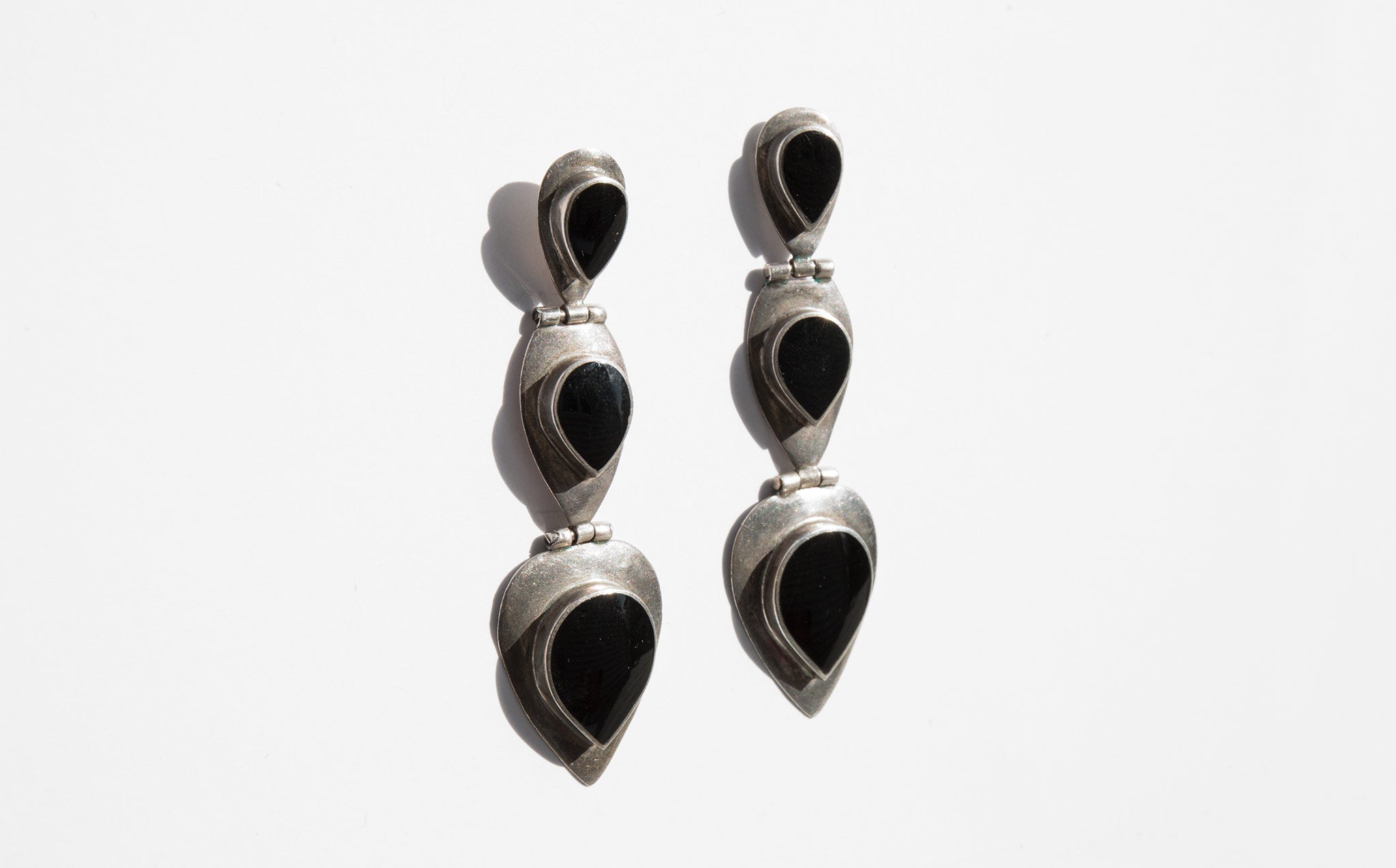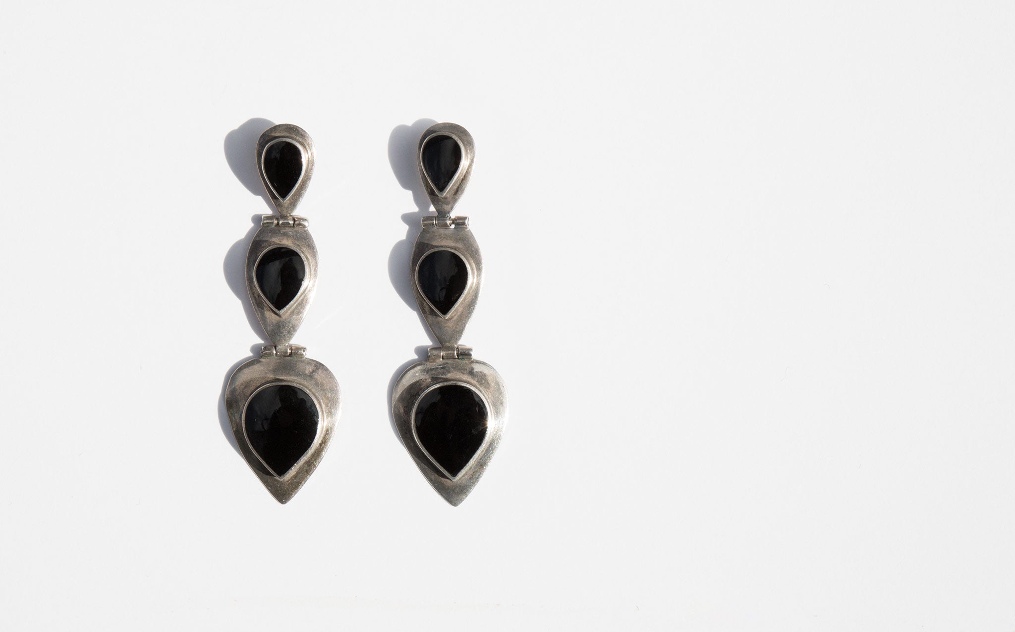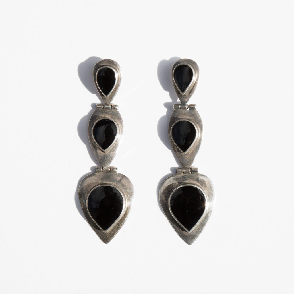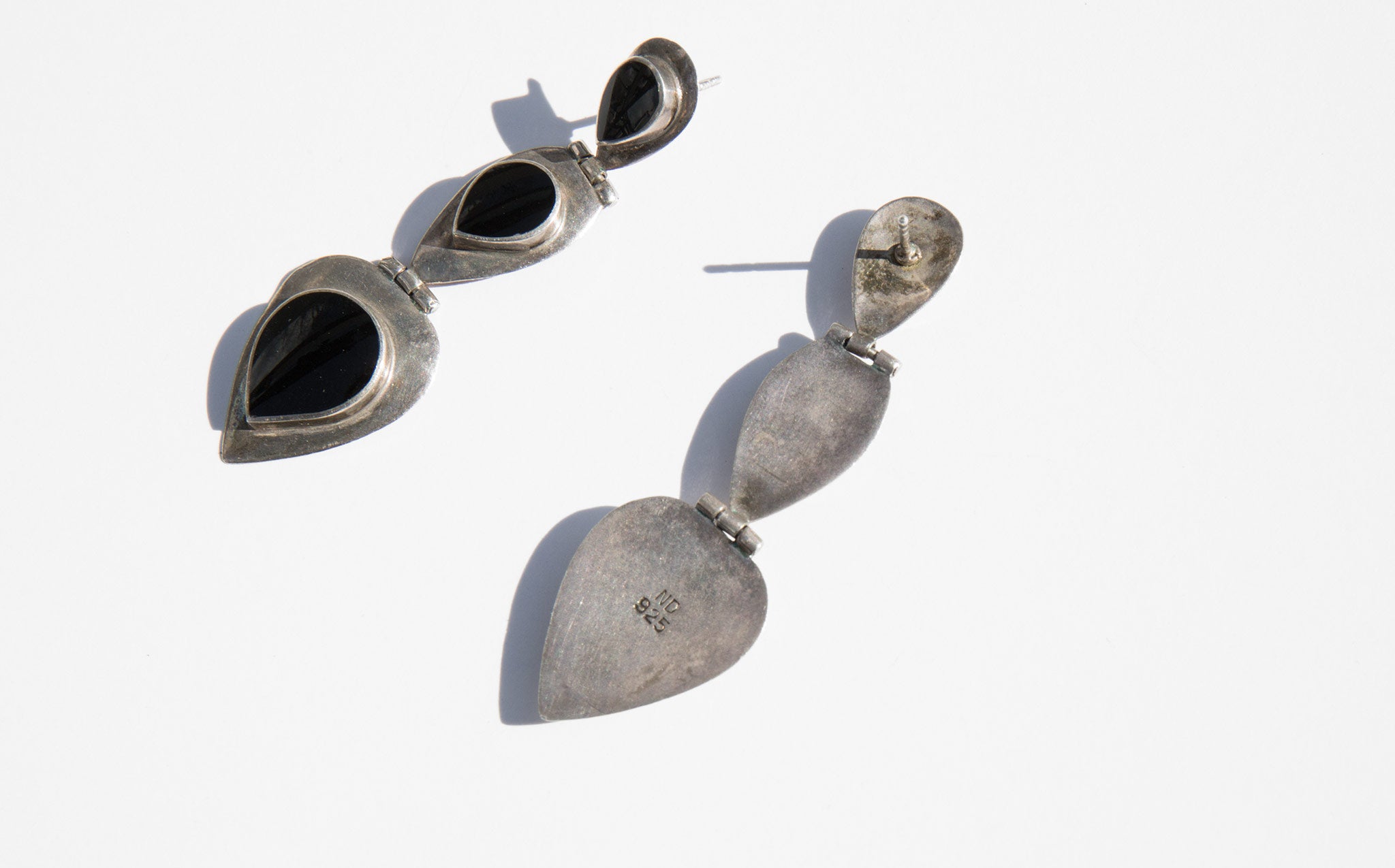 Eye catching, hinged sterling silver tear drop earrings with glossy black stone detailing.