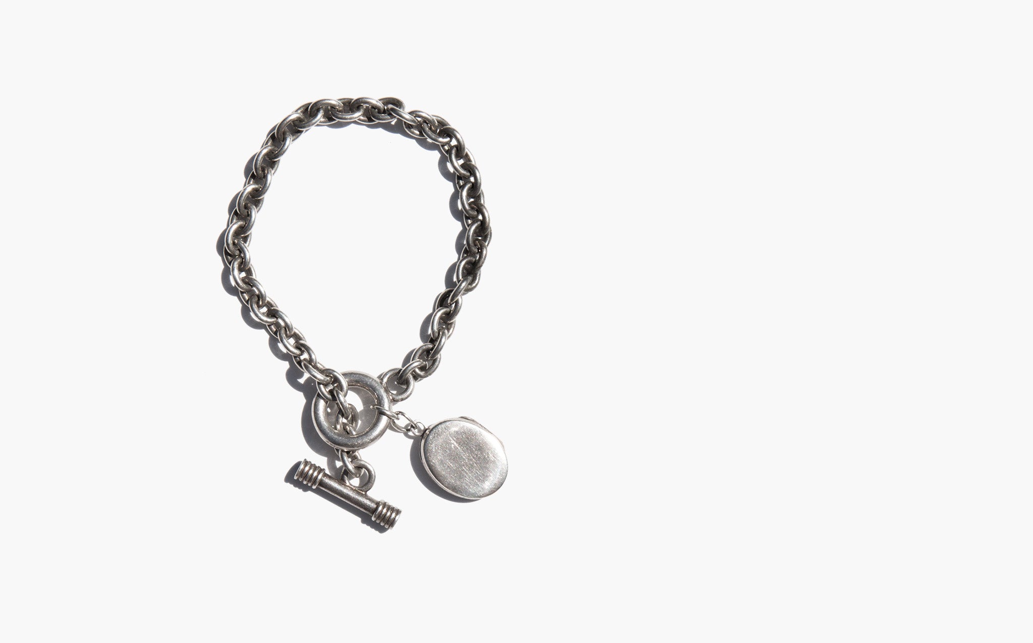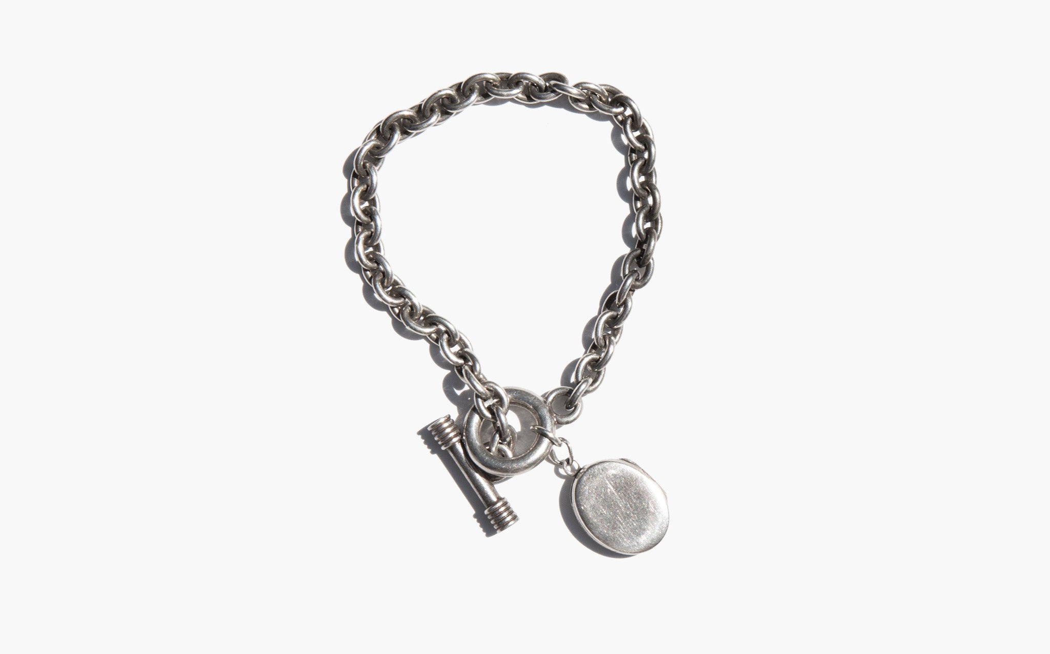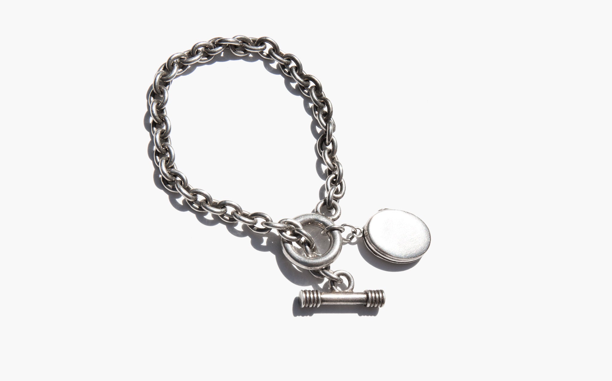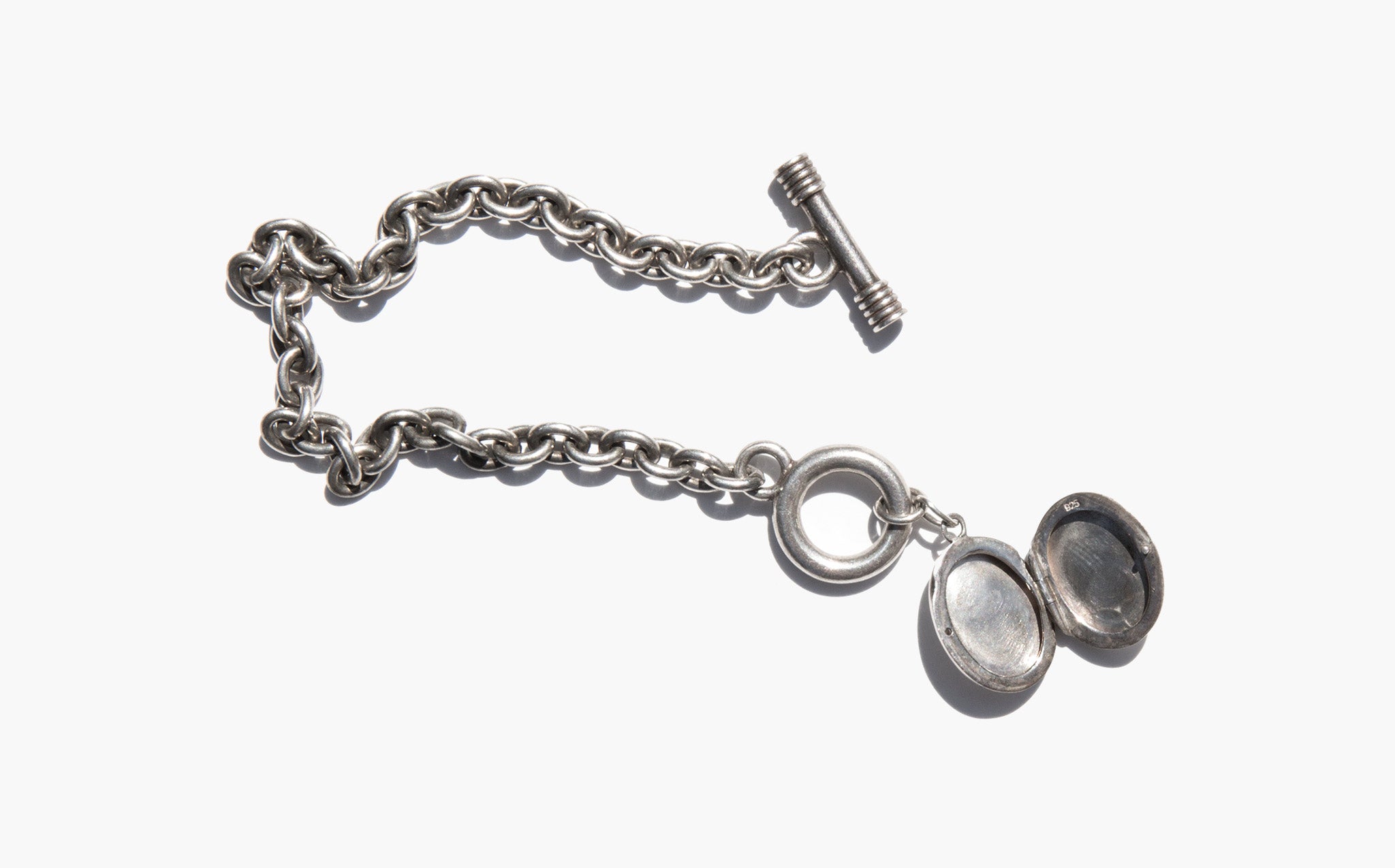 Lariat-style sterling silver chain bracelet with a small locket to hold tiny photos of those you love.