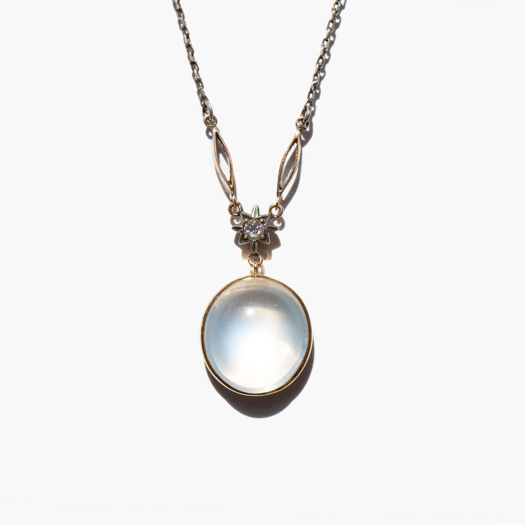 Stunning antique original Belle Époque era necklace with an ethereal old mine moonstone on a 14k gold and sterling silver chain with a diamond accent. Named for its moon-like glow and ghostly sheen, moonstone has been thought for thousands of years to offer protection for travelers, especially at night, and some cultures purport that the stone is especially beneficial for lovers and can even help to unite them if estranged.