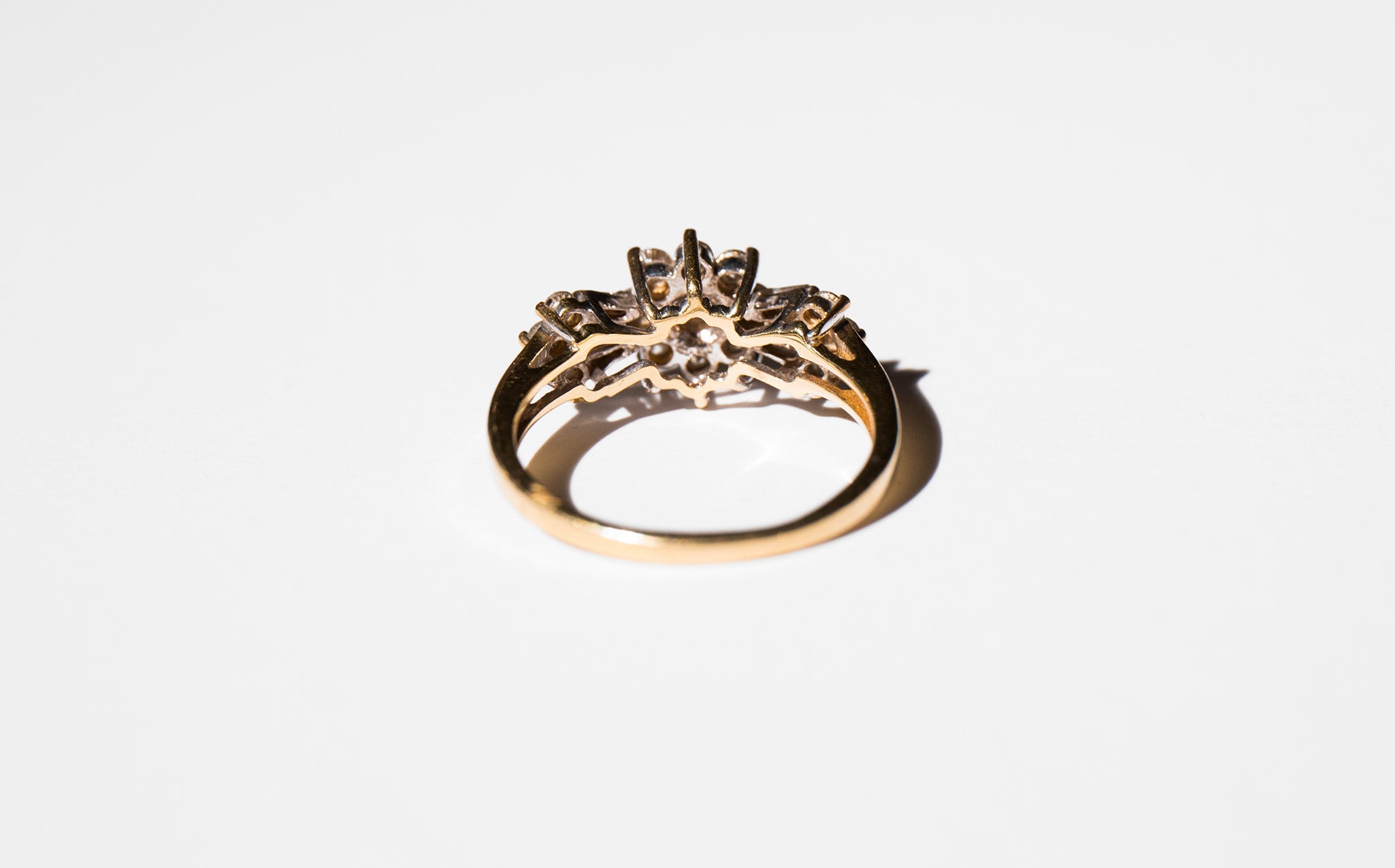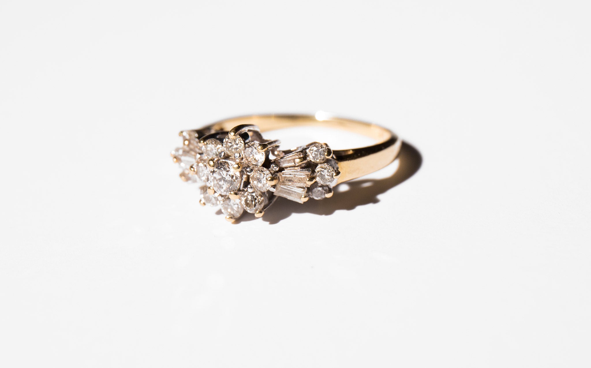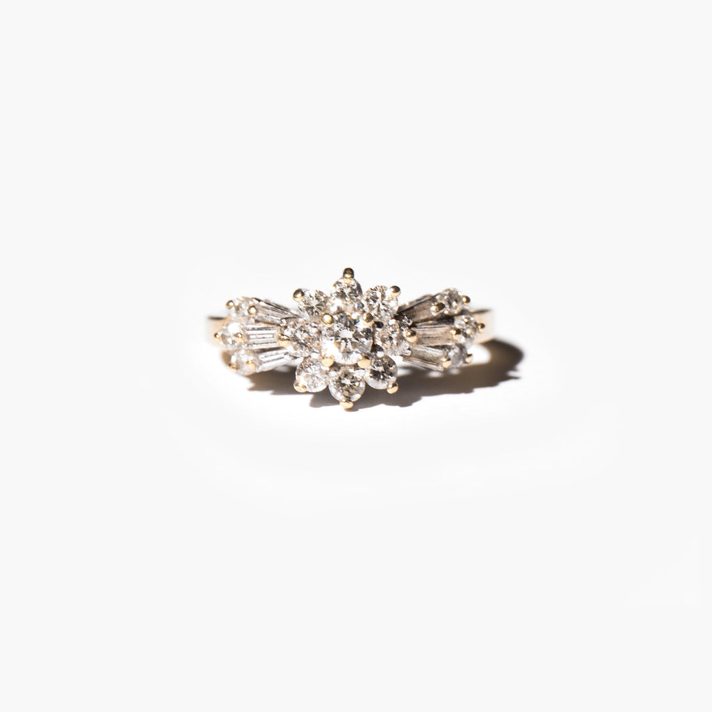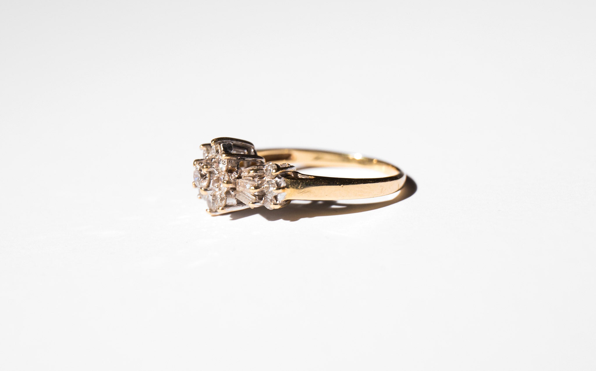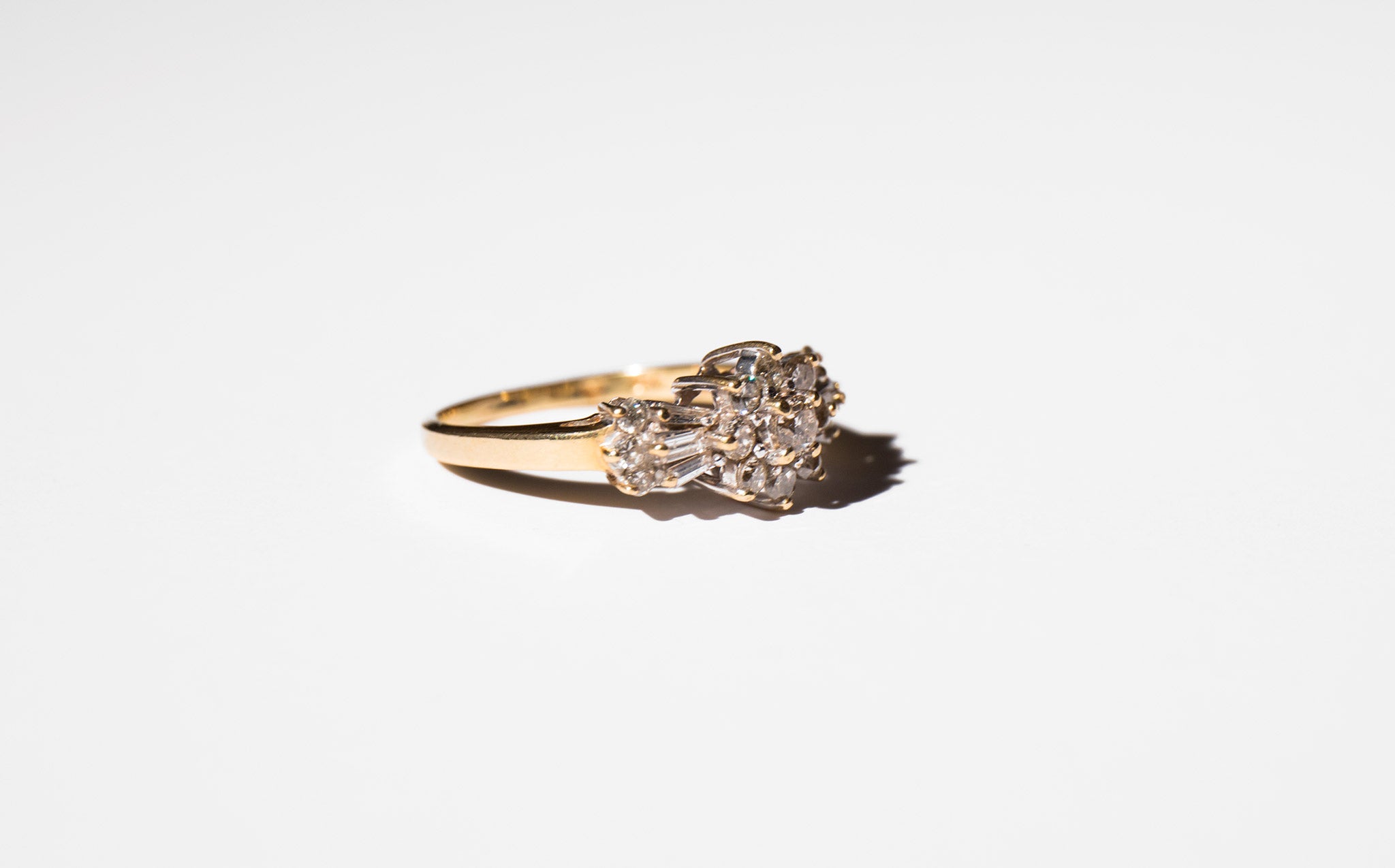 Pretty and sparkling 14k gold and diamond ring with a winged floral design.