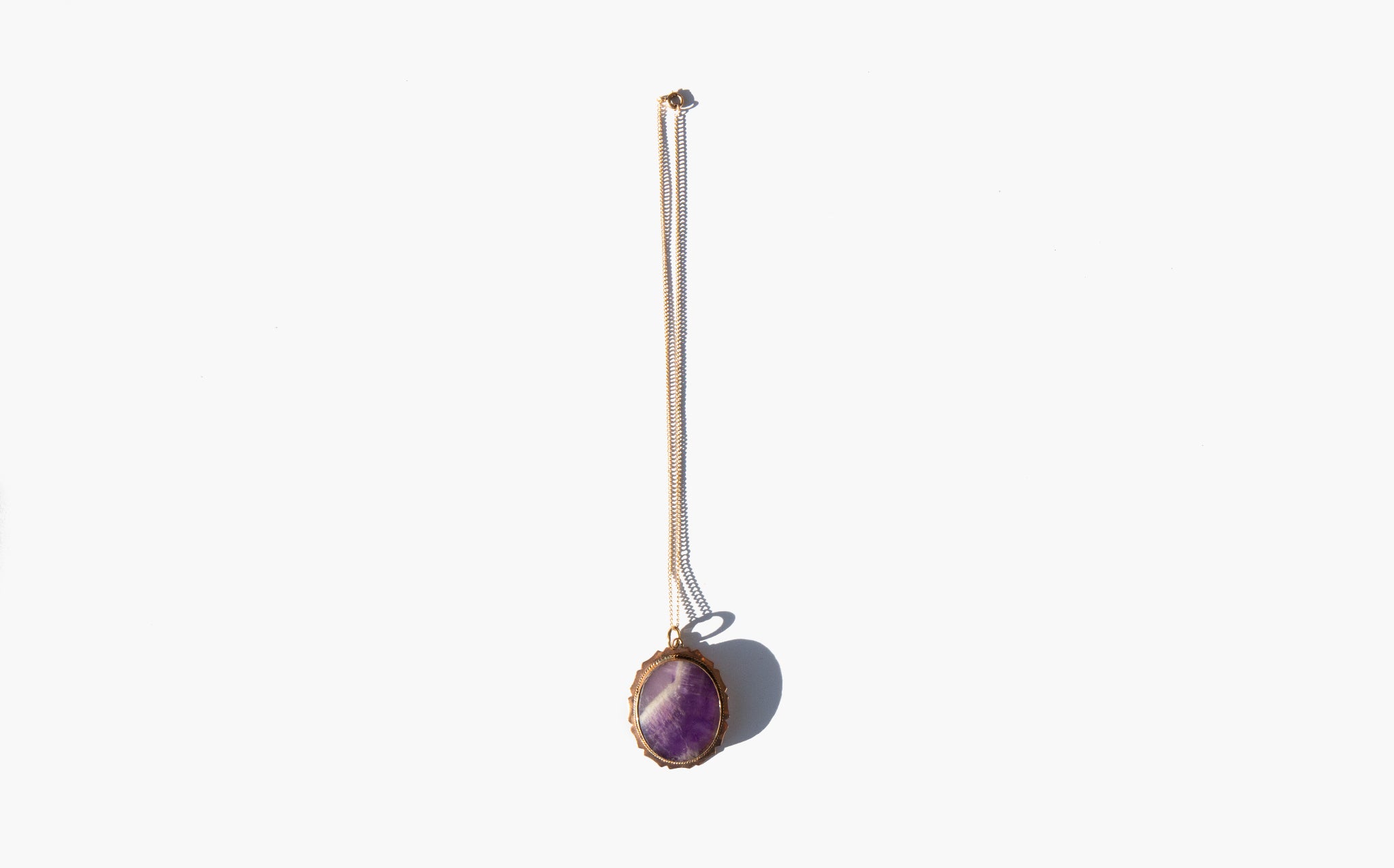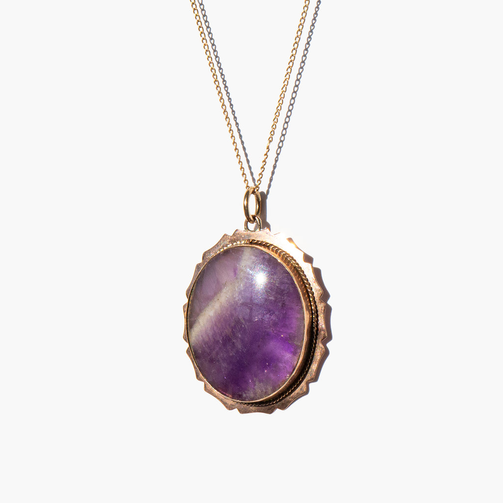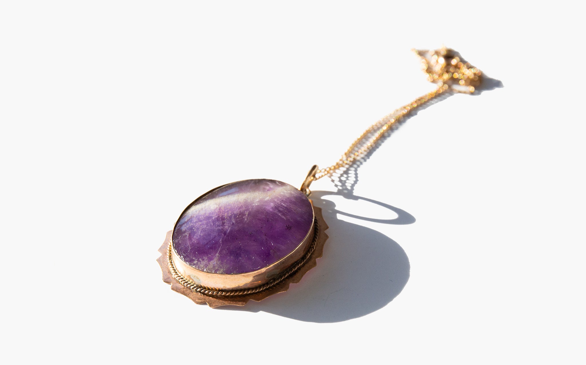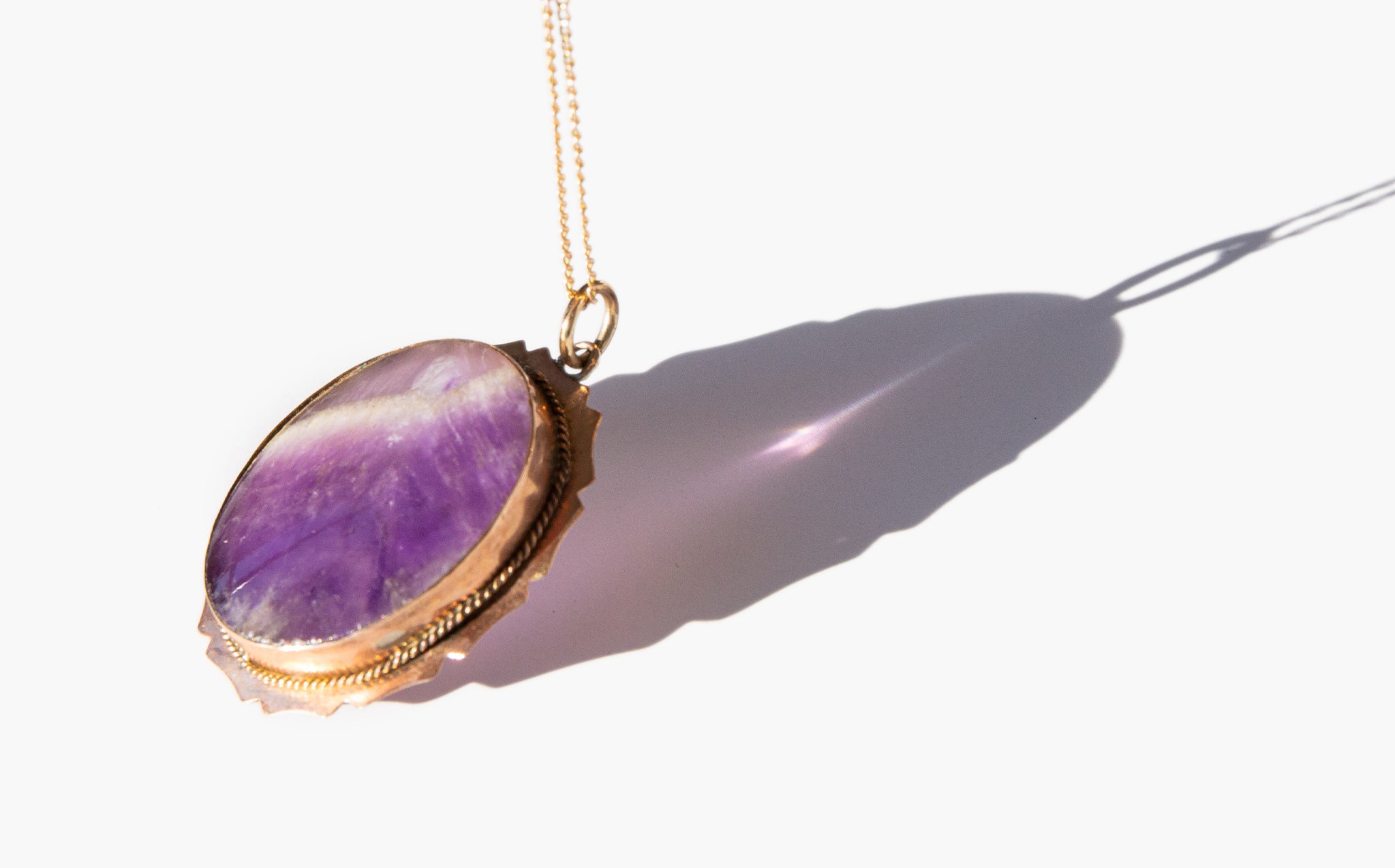 Large and stunning violet hued amethyst set in 9k peach gold on a 14k gold link chain. Amethyst has been known throughout the centuries as a symbol of purity and spirituality, an amulet of protection against evil, and as a talisman of success and wealth.